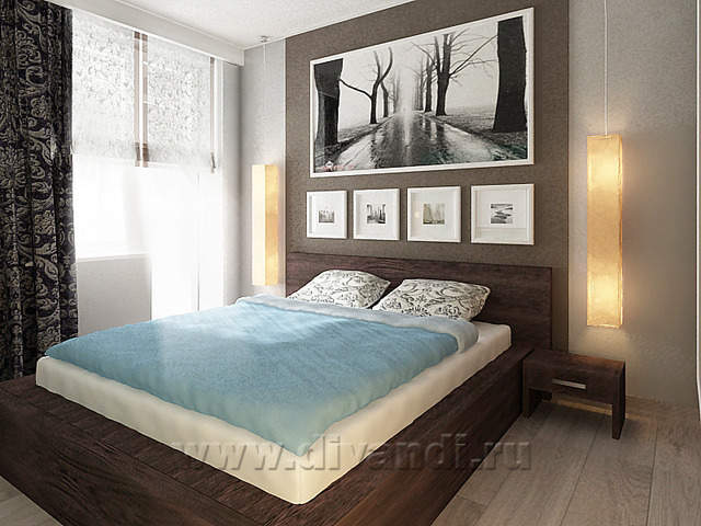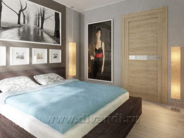 Для спальни выбрана другая, более нейтральная серо-голубая гамма. Уютность помещению придают торшеры и подвесные светильники и кровати.