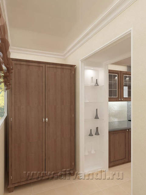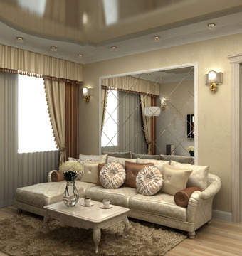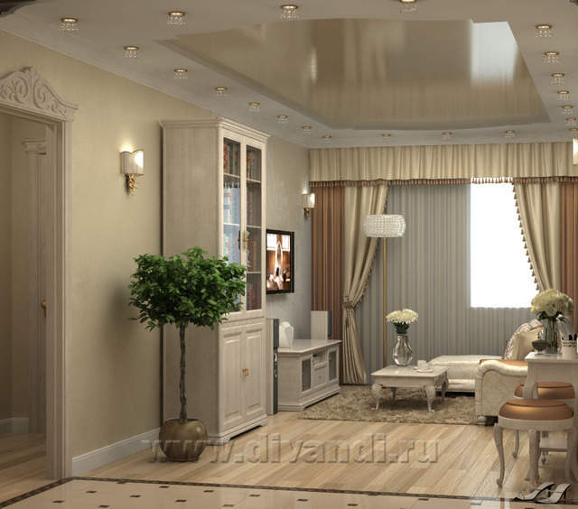 Центральным помещением в этой квартире является просторная гостиная. Светлая комната выполнена в классическом стиле и объединена с прихожей, образуя в плане вытянутый прямоугольник. Для того, чтобы помещение не было узким и длинным, на стене за диваном пемещено стеклянное панно, а на противоположной стене за телевизором сделана роспись. Такие приемы зрительно раздвигают стены.