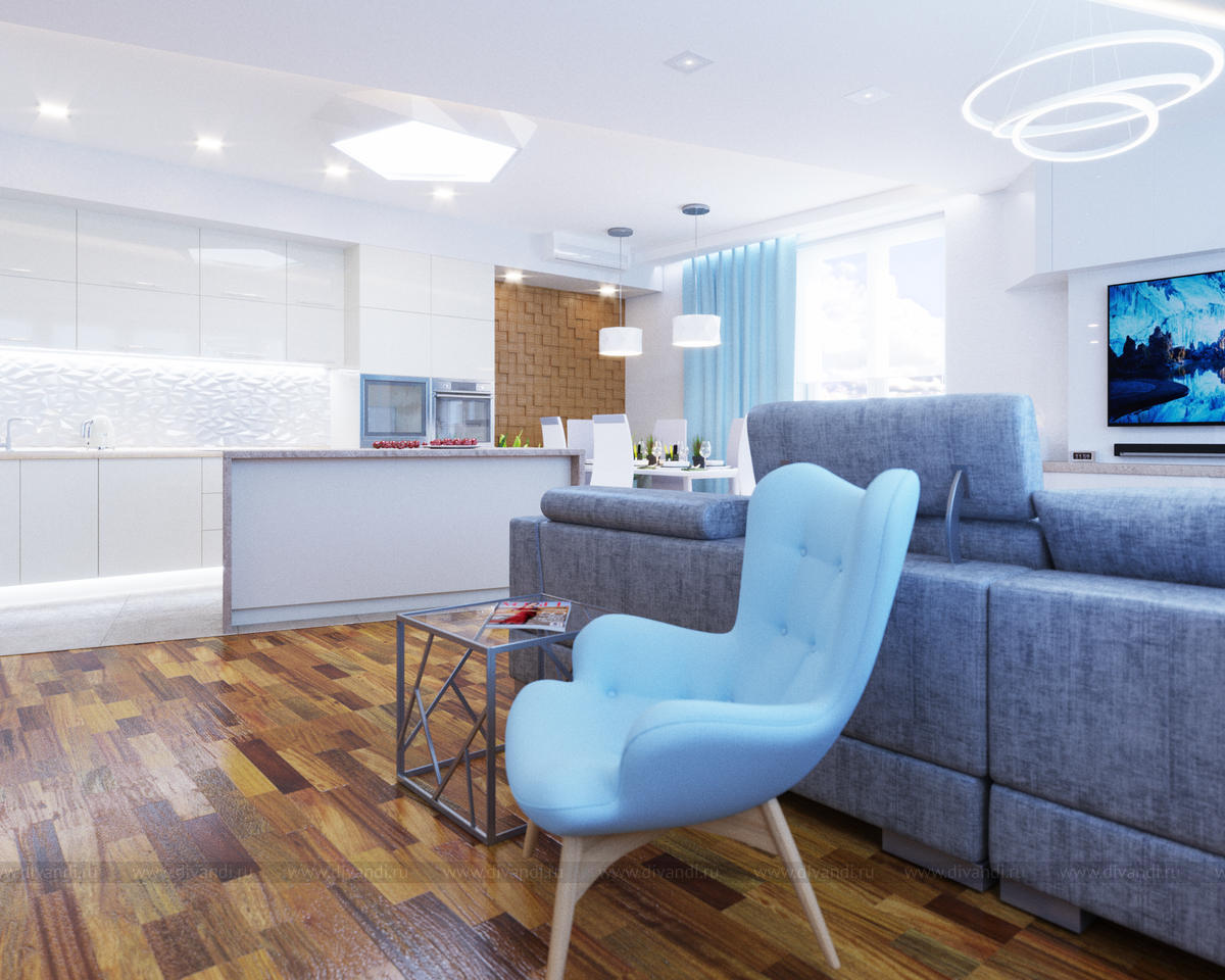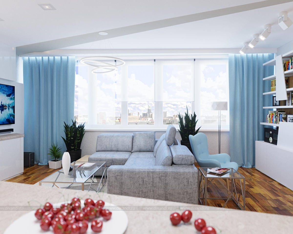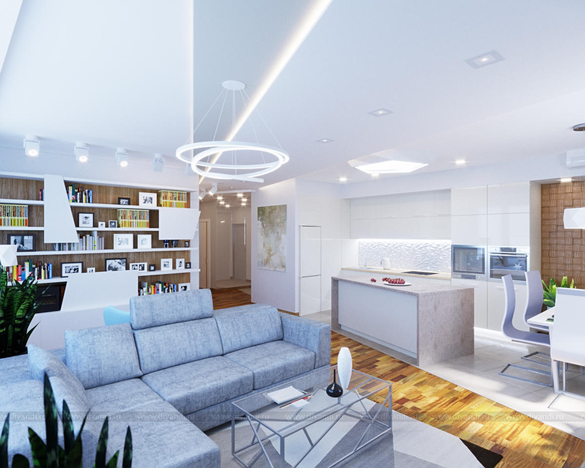 Гостиная-кухня в белых тонах с видом на центральный стадион