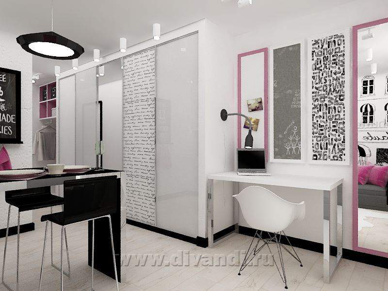Глобальной перепланировки в квартире не выполнялось, но нам удалось разделить маленькую квартиру на зоны с помощью небольших изменений. В квартире выделены зоны сна, рабочая зона и зона кухни, а зона прихожей зрительно отделена от основной комнаты.
