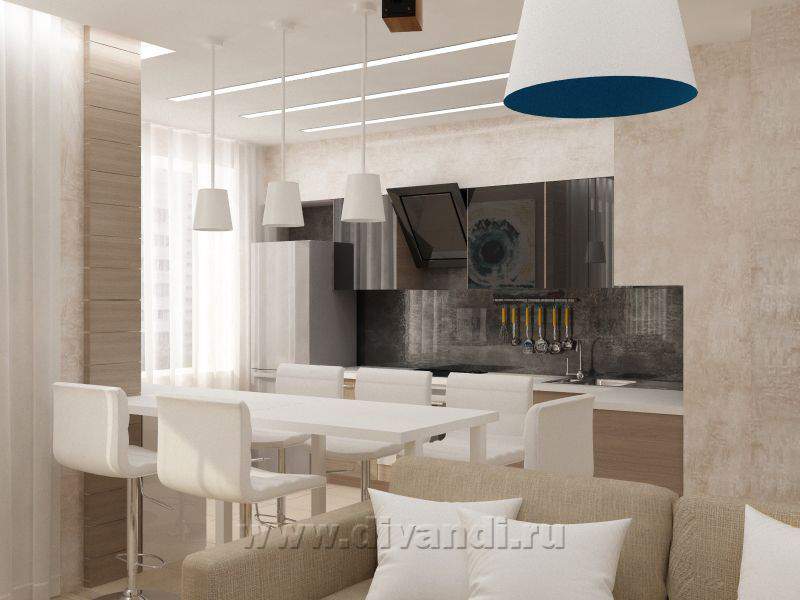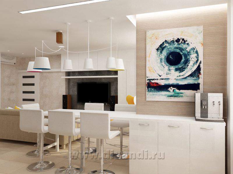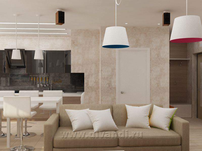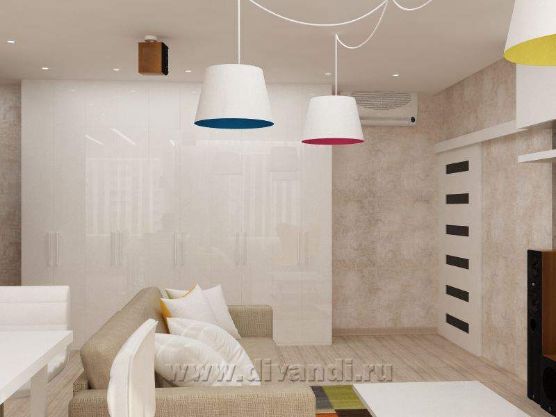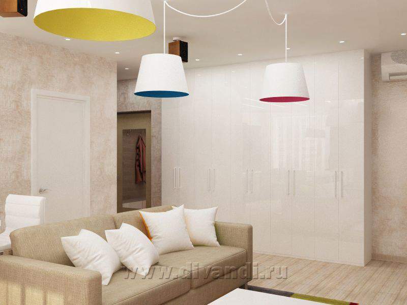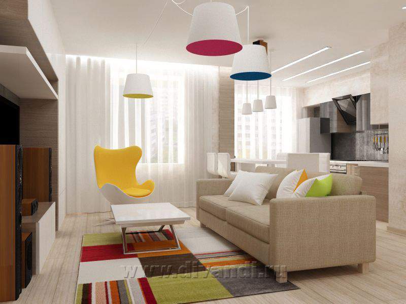Основная идея интерьера – яркие акценты на нейтральном фоне.