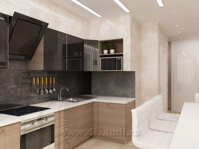 При работе над дизайном этой квартиры нам необходимо было учитывать, что кухонный гарнитур в квартире останется прежним, поэтому интерьер кухни стал своеобразной отправной точкой для дизайна этой квартиры.