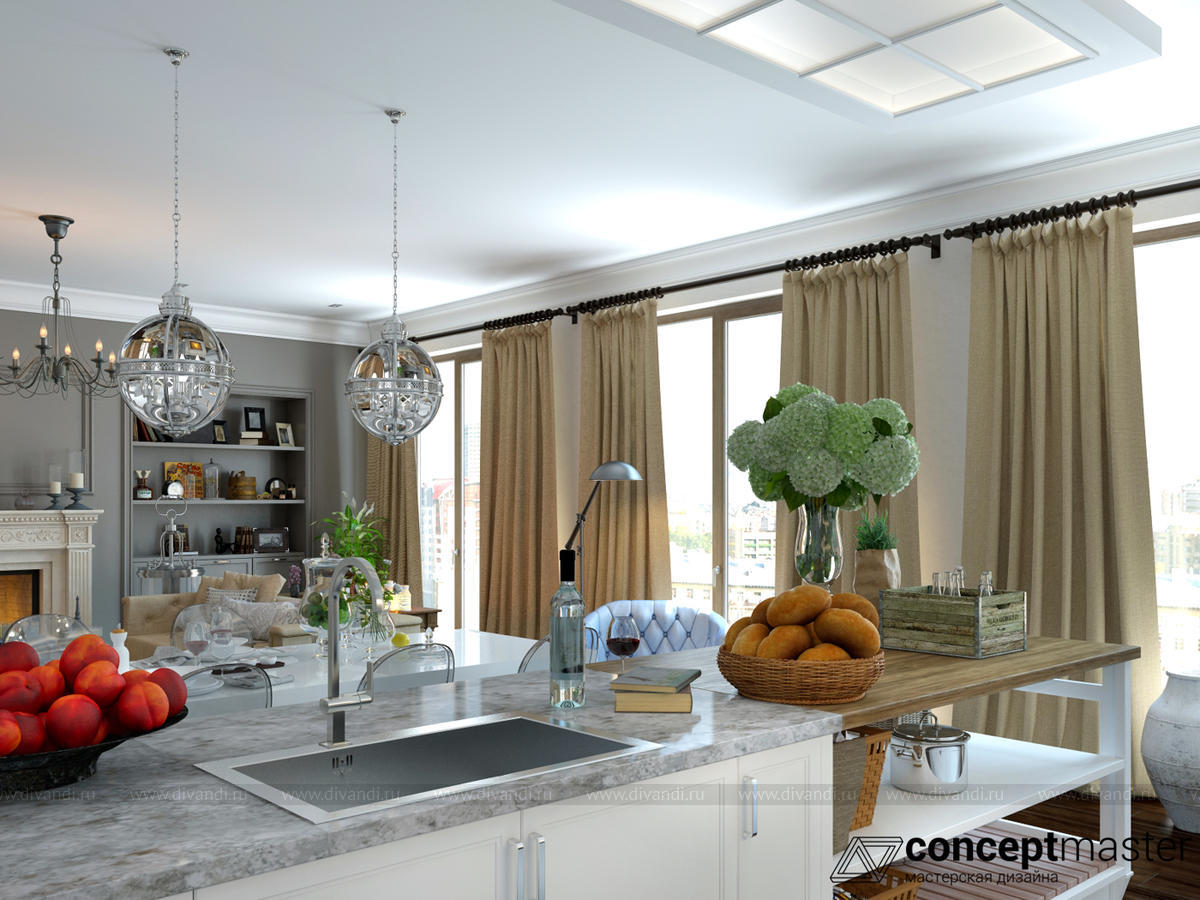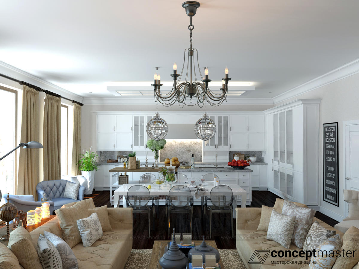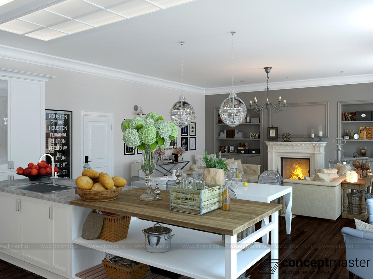 Тип проекта: квартира, загородный дом, кухня, гостиная