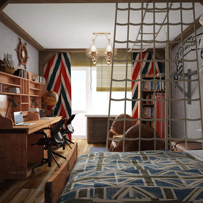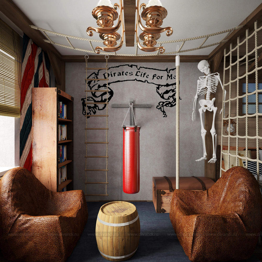 Проект интерьера детской комнаты для двух братьев по мотивам пиратских романов. Когда ещё чудить и дурачиться, как не в детстве? Здесь есть всё для активных ребят - место для учёбы, для спорта, для отдыха, и, конечно, для мальчишеских игр в пиратов!