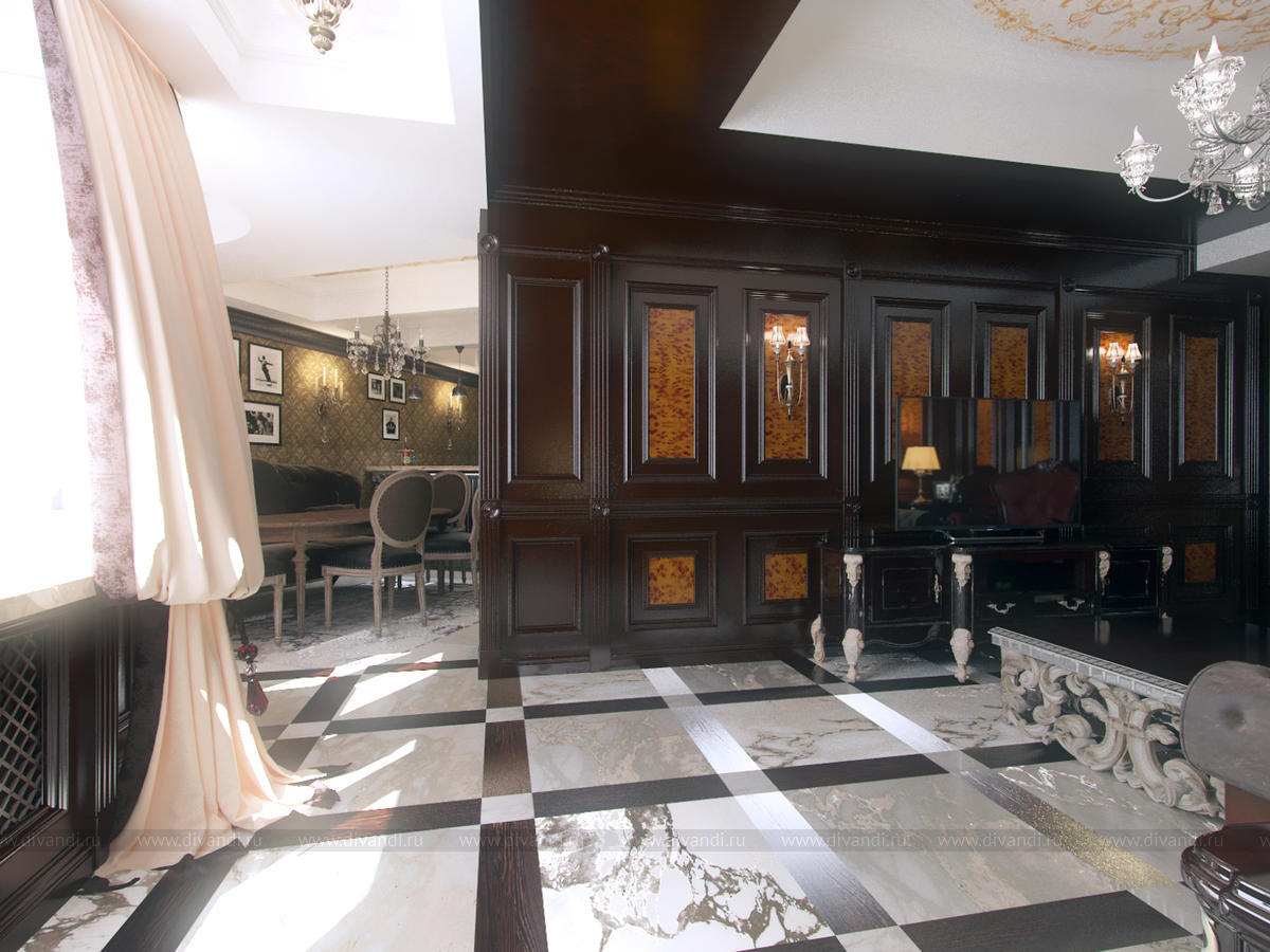 Классический стиль в контрастном сочетании темного дерева и белого гранита
