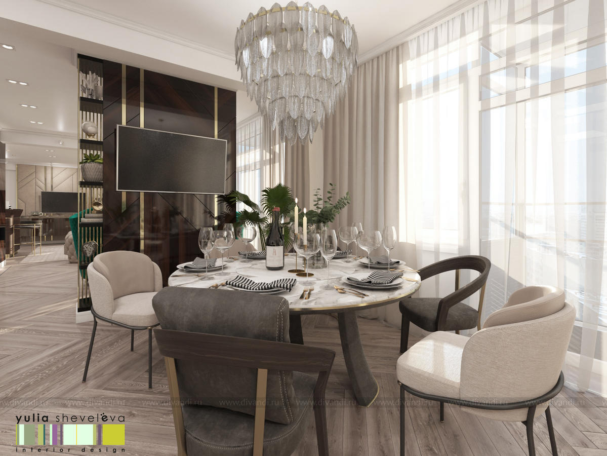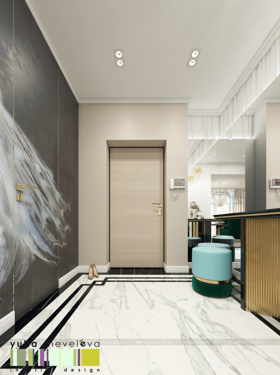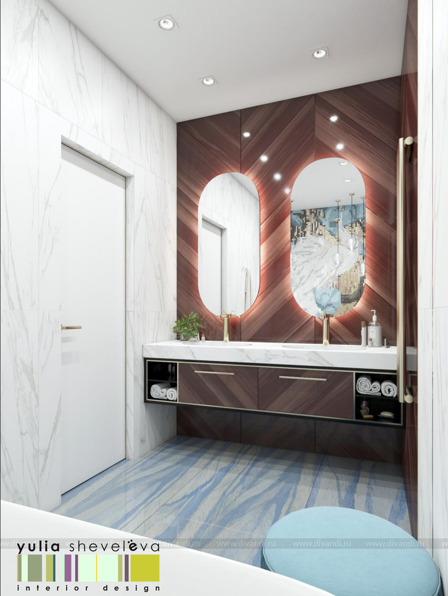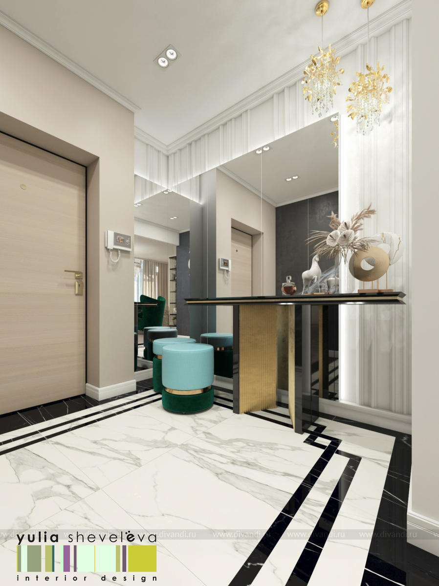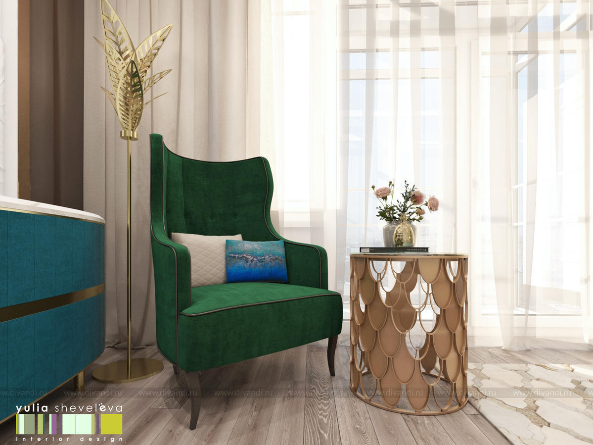 В проекте переплетаются элементы разных стилей, текстур и материалов в отделке и декоре – деревянные и зеркальные поверхности, мрамор, латунь и нежный текстиль. Интерьер выполнен в нейтральной теплой гамме, а в качестве акцентов использованы зеленые и синие оттенки.