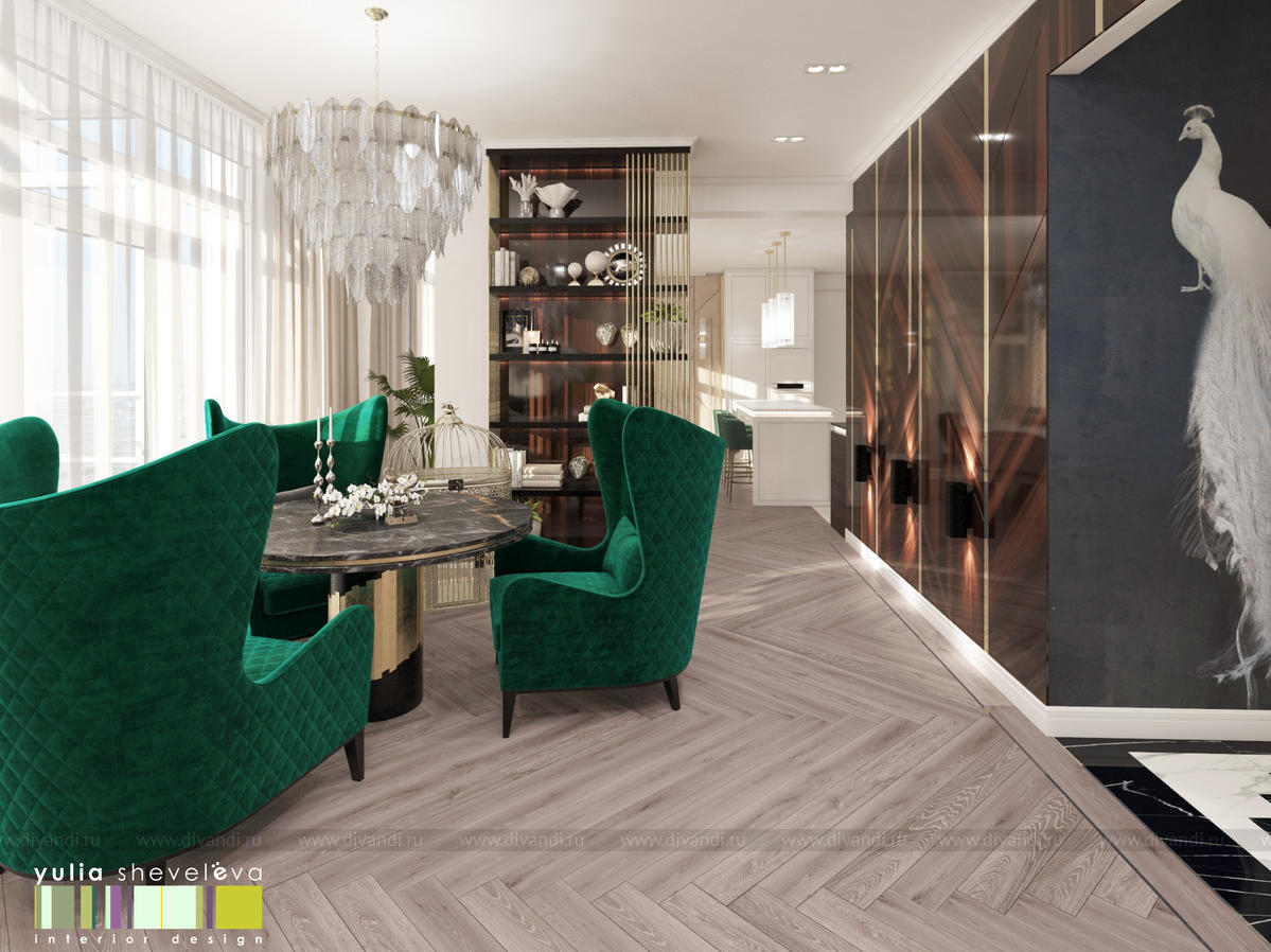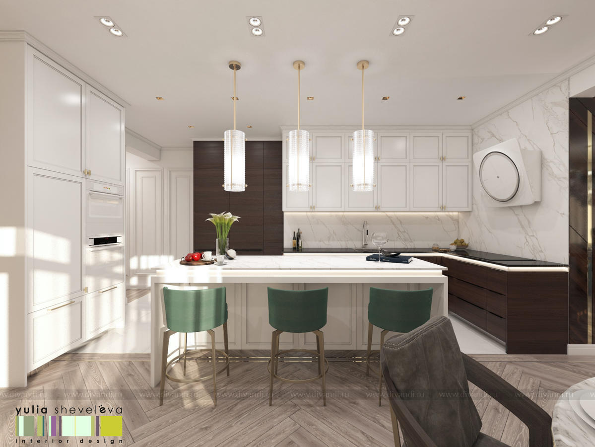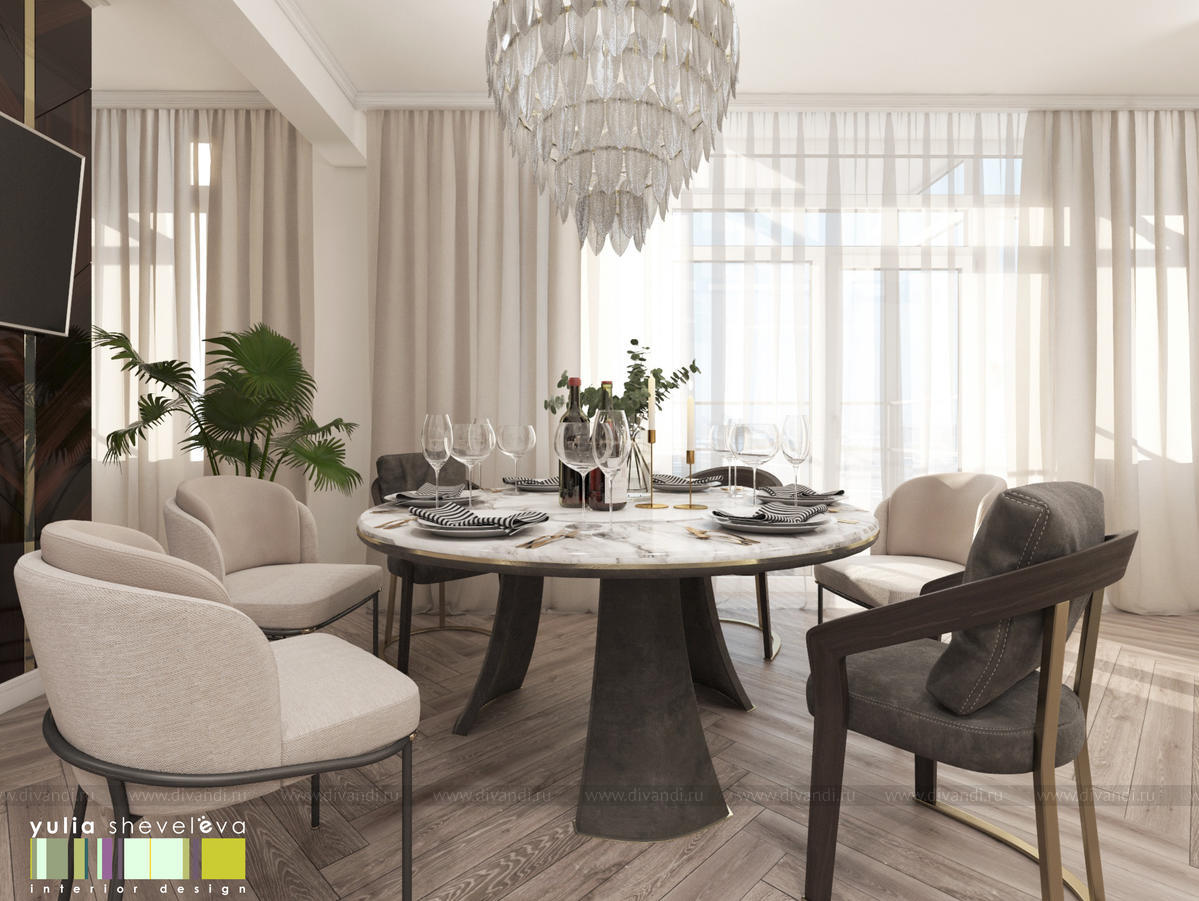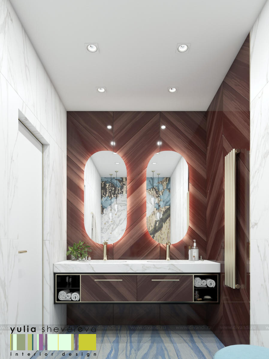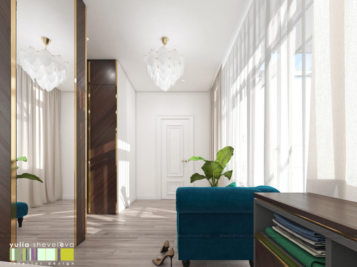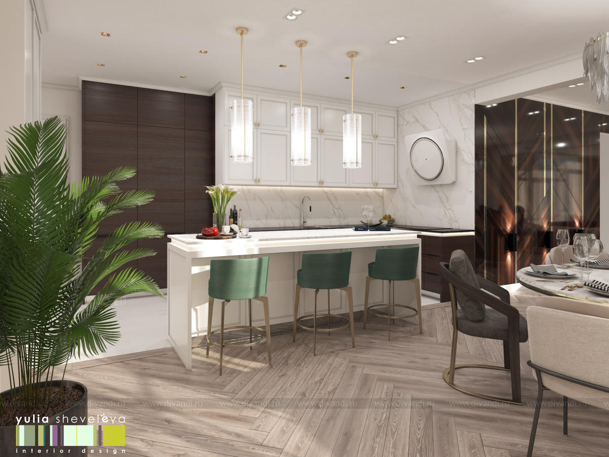 В проекте переплетаются элементы разных стилей, текстур и материалов в отделке и декоре – деревянные и зеркальные поверхности, мрамор, латунь и нежный текстиль. Интерьер выполнен в нейтральной теплой гамме, а в качестве акцентов использованы зеленые и синие оттенки.