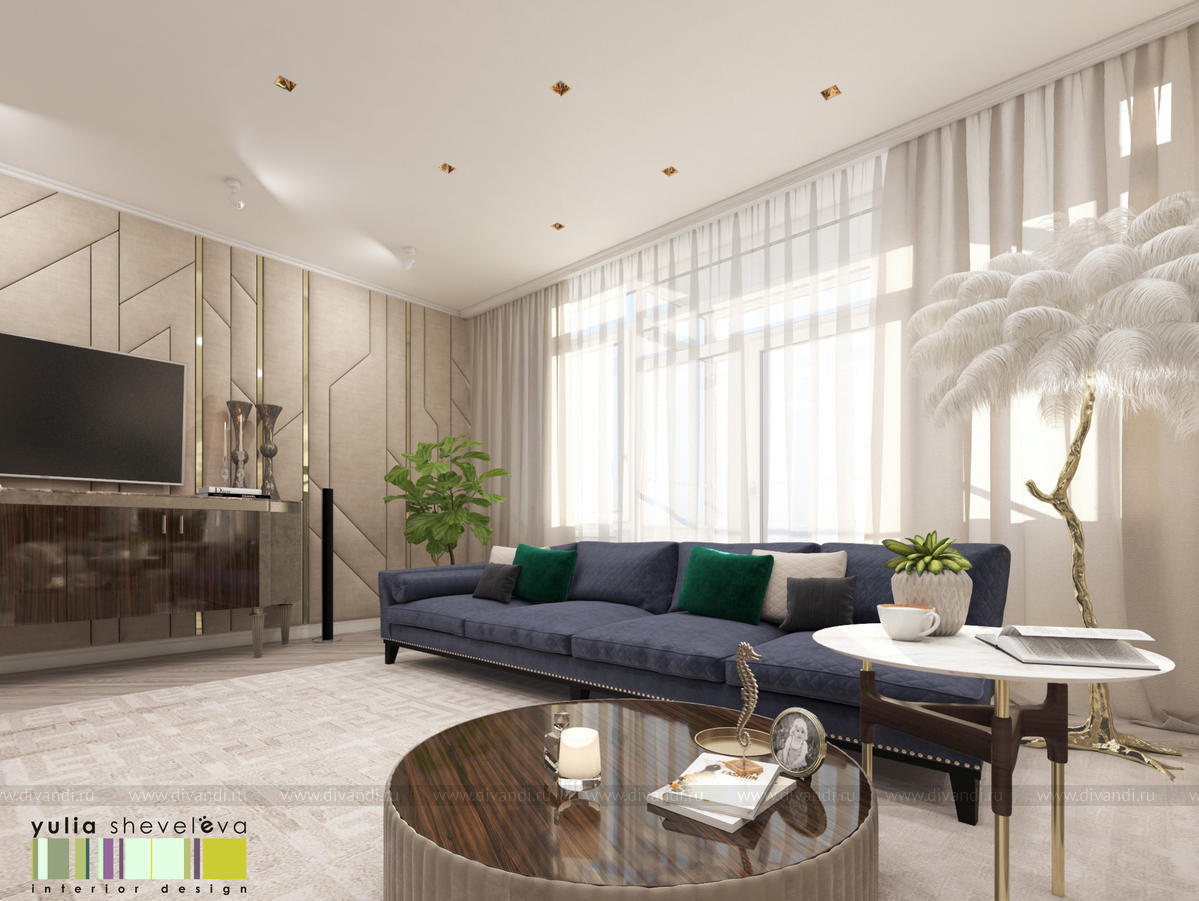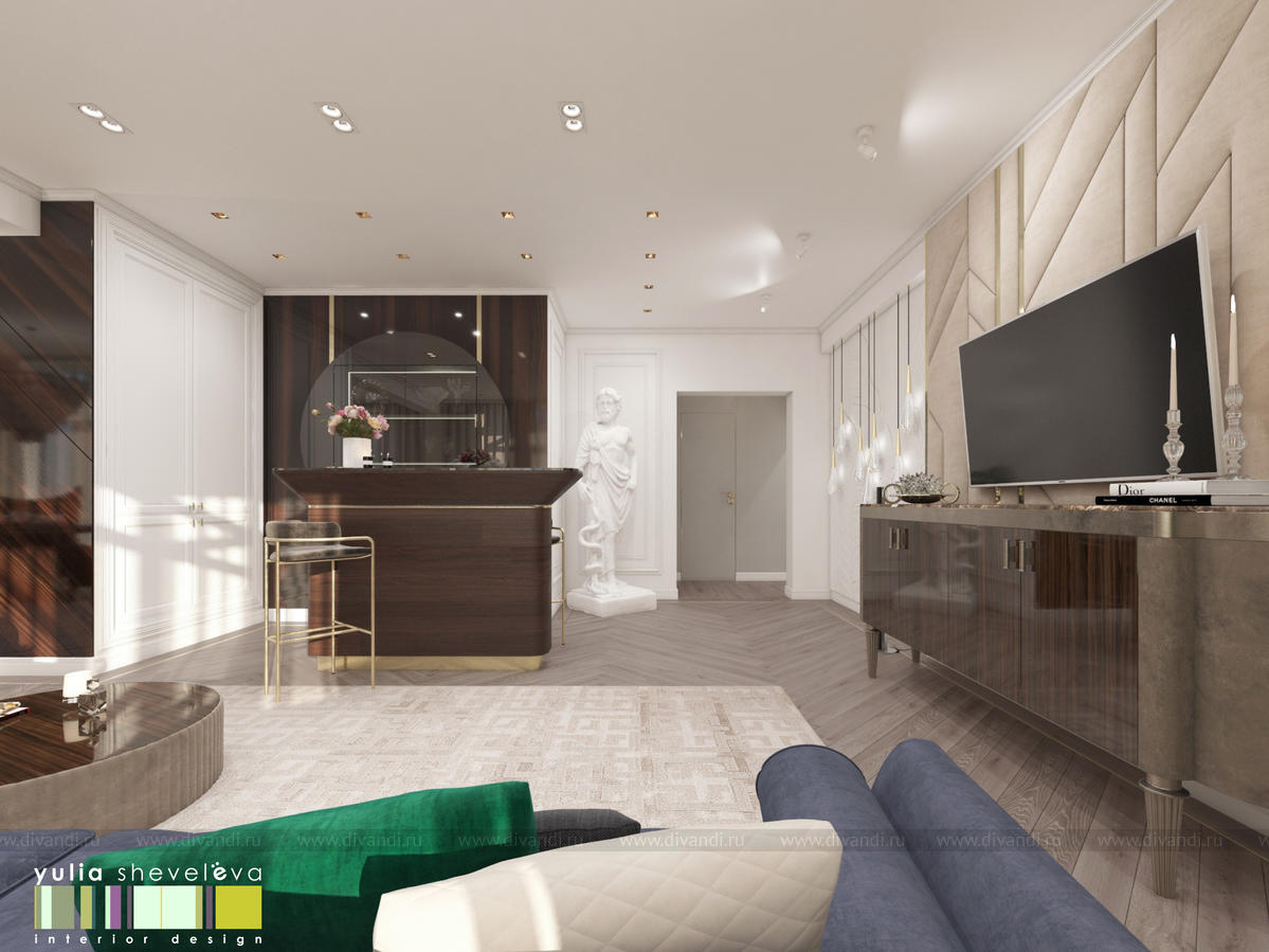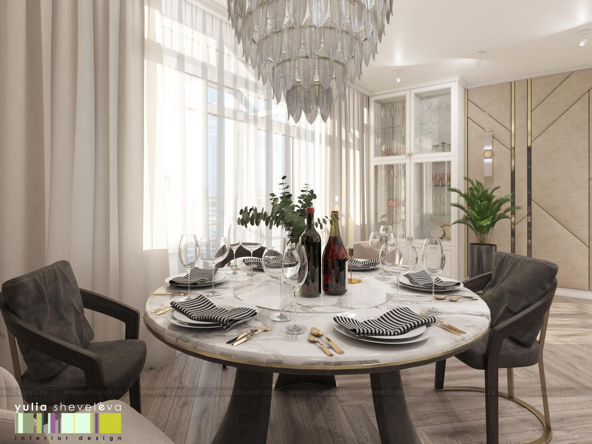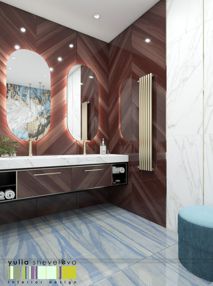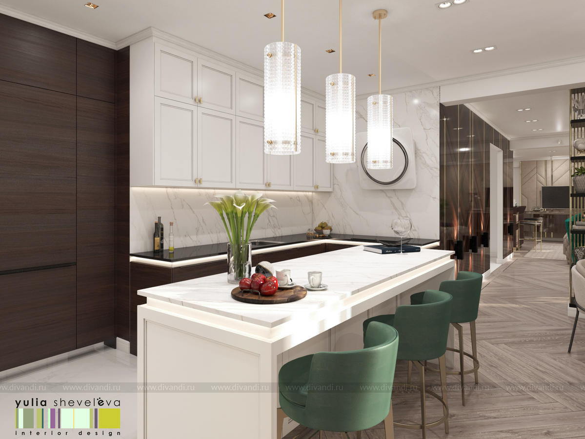 В проекте переплетаются элементы разных стилей, текстур и материалов в отделке и декоре – деревянные и зеркальные поверхности, мрамор, латунь и нежный текстиль. Интерьер выполнен в нейтральной теплой гамме, а в качестве акцентов использованы зеленые и синие оттенки.