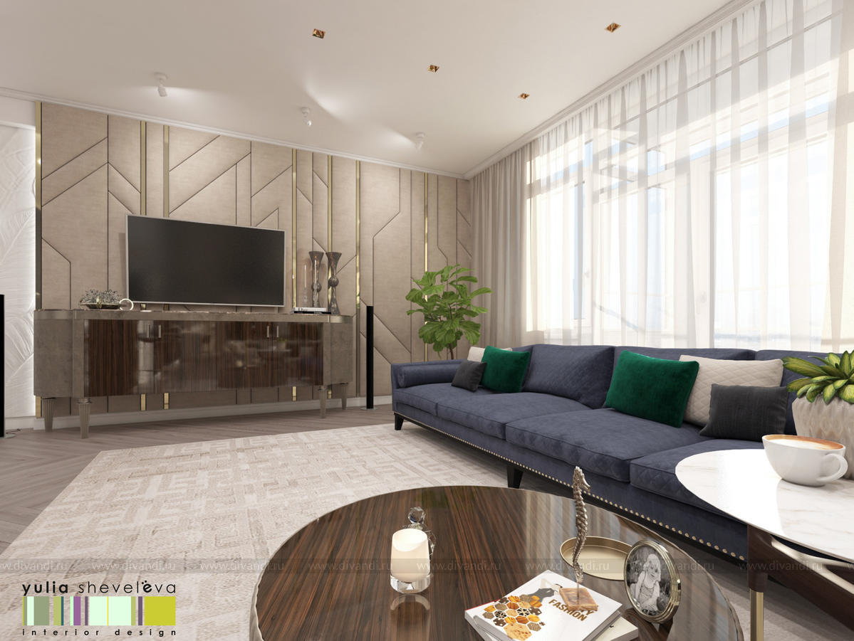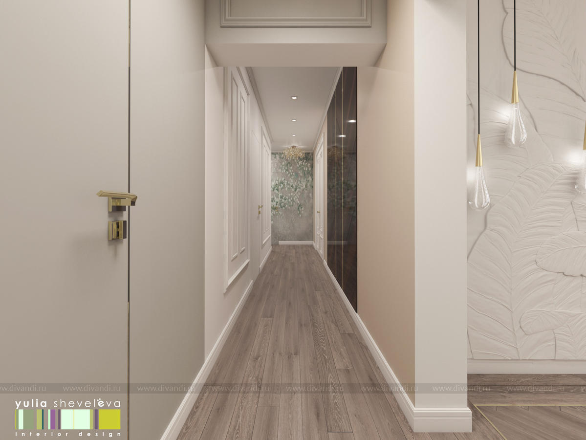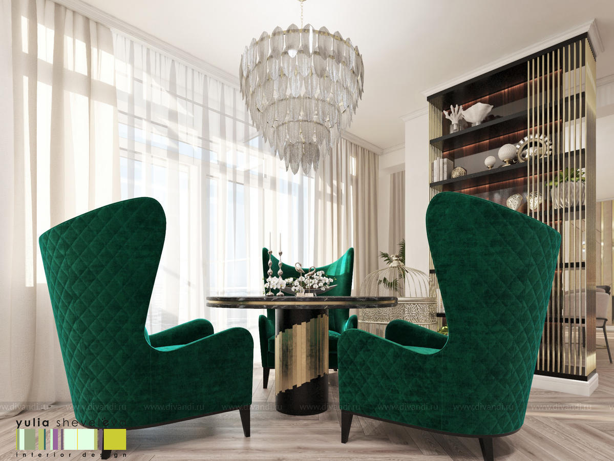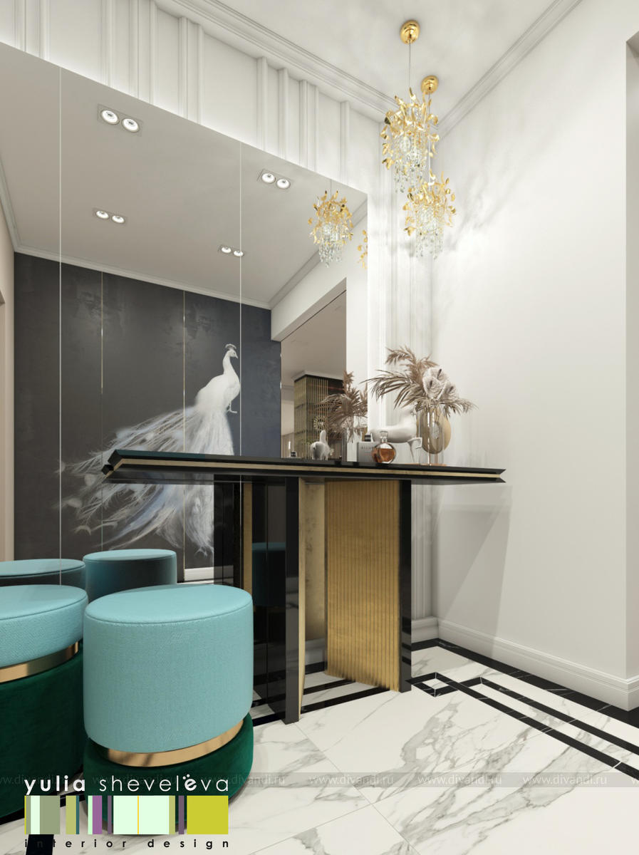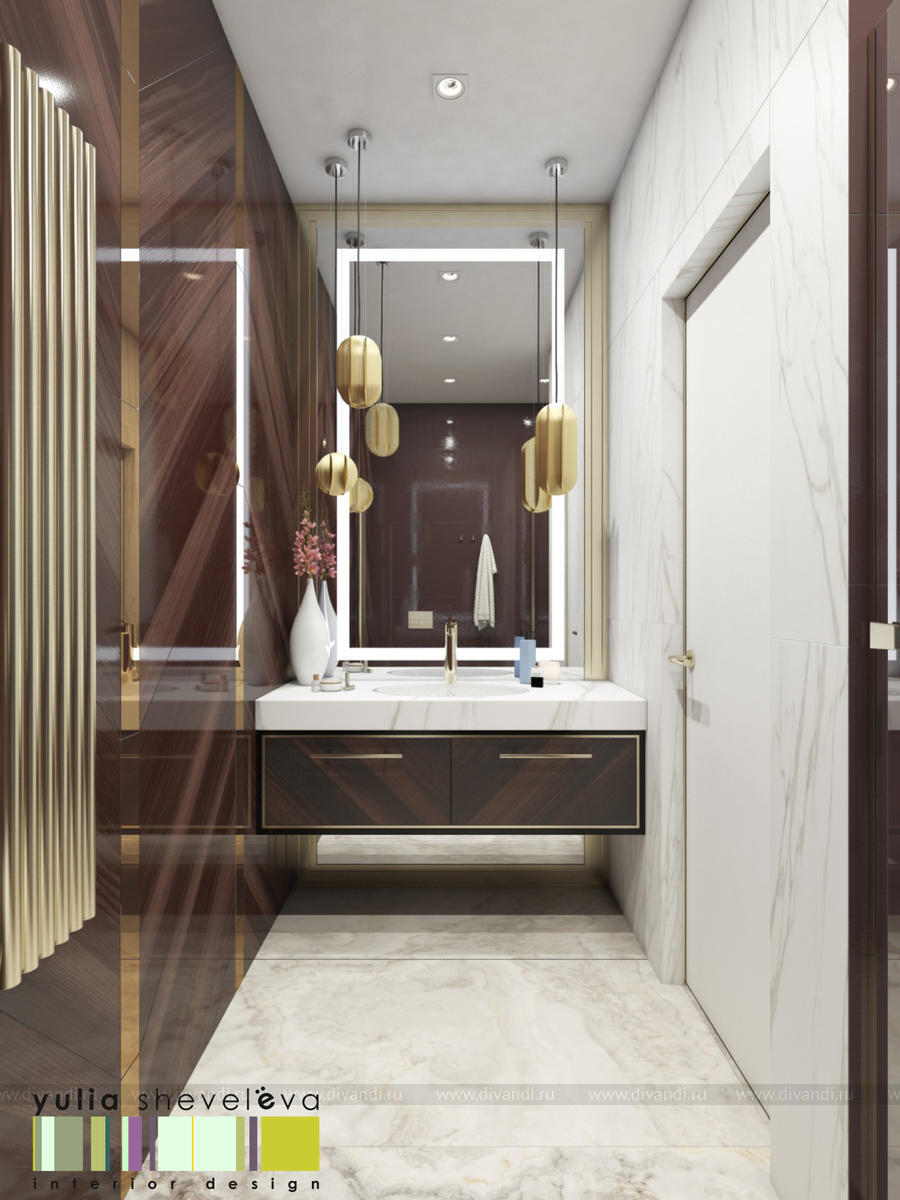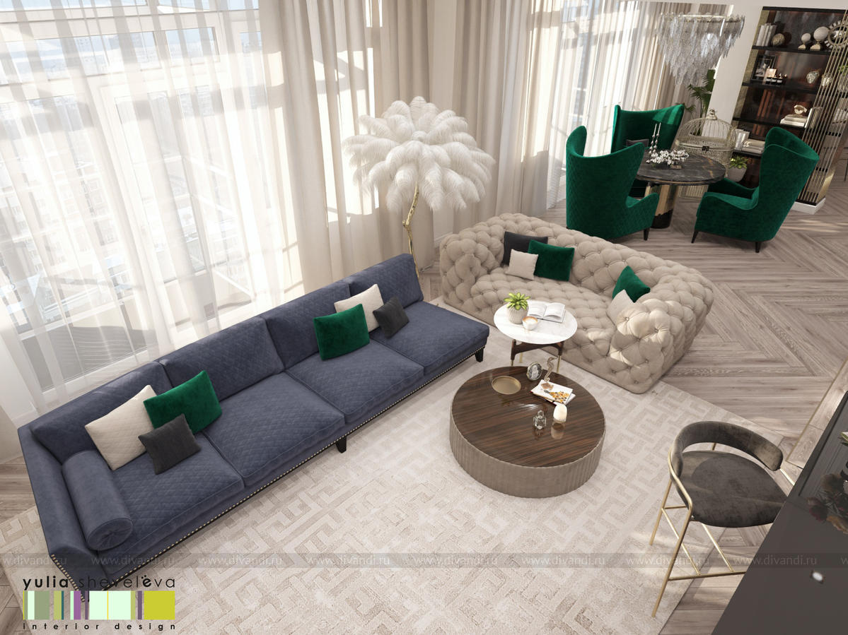 В проекте переплетаются элементы разных стилей, текстур и материалов в отделке и декоре – деревянные и зеркальные поверхности, мрамор, латунь и нежный текстиль. Интерьер выполнен в нейтральной теплой гамме, а в качестве акцентов использованы зеленые и синие оттенки.