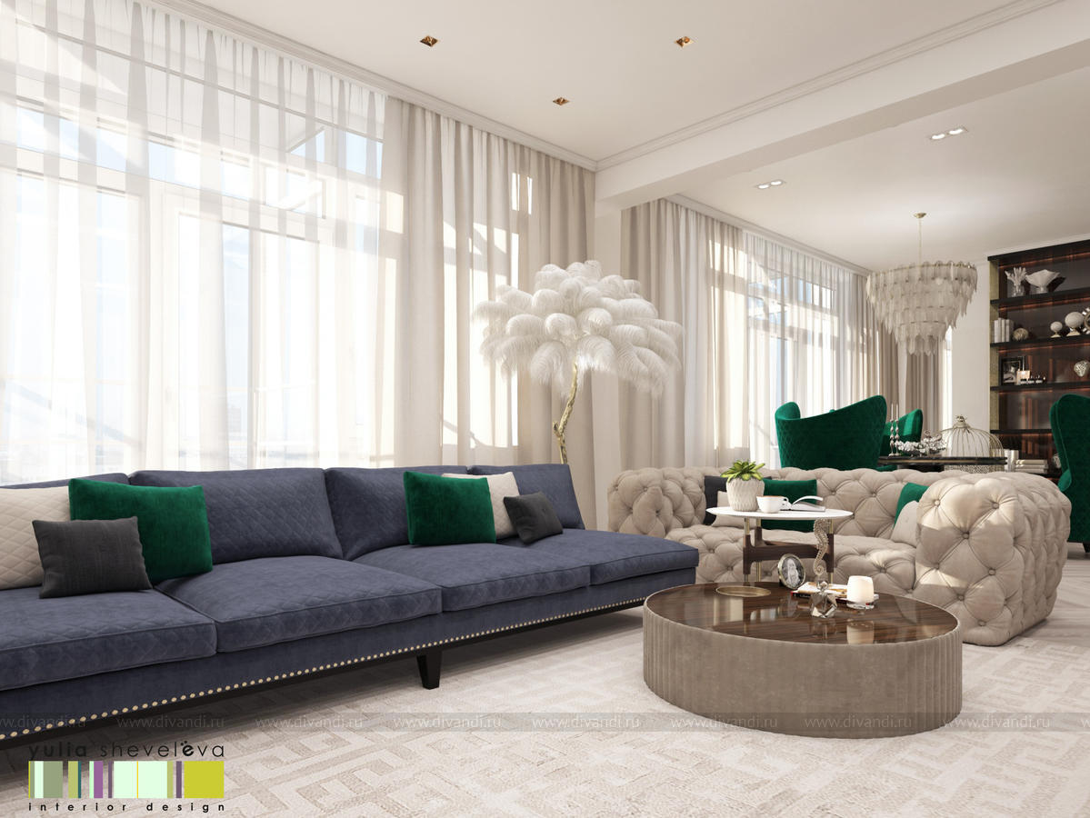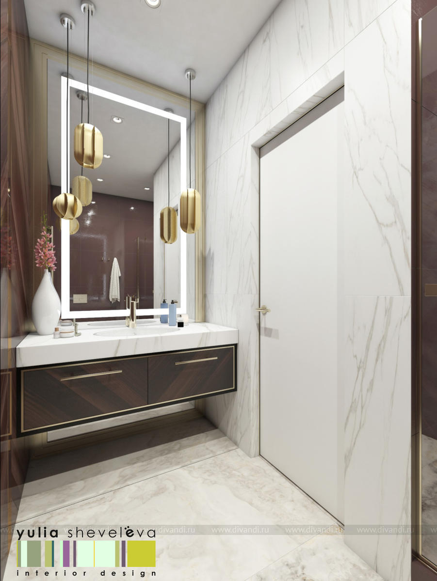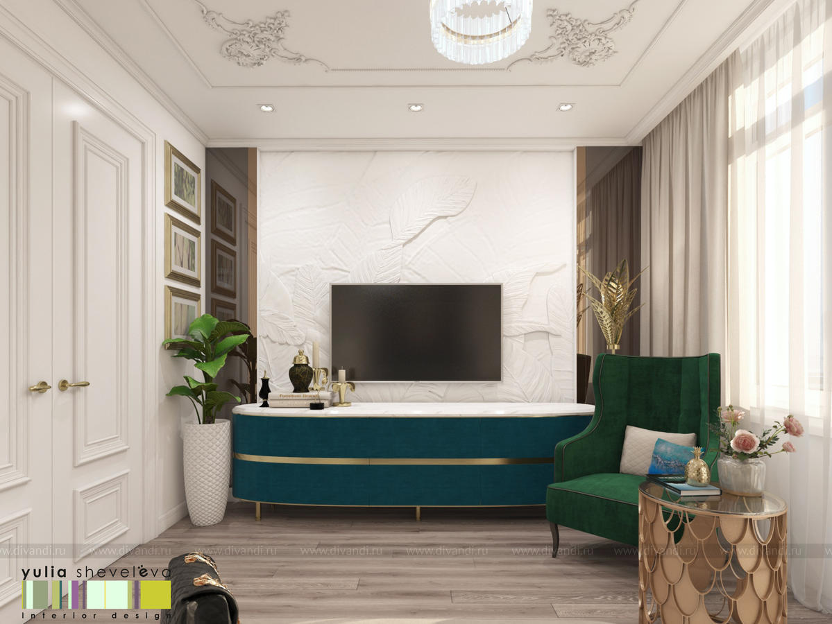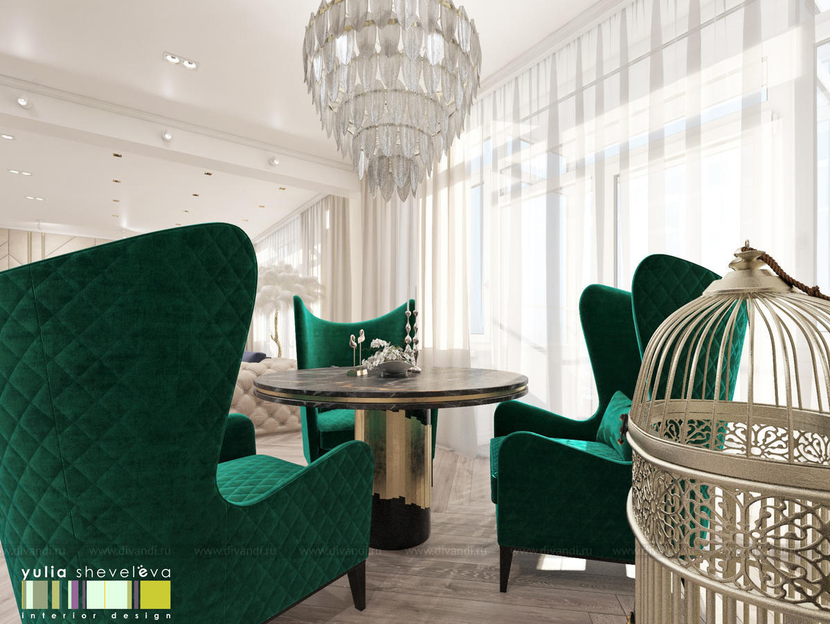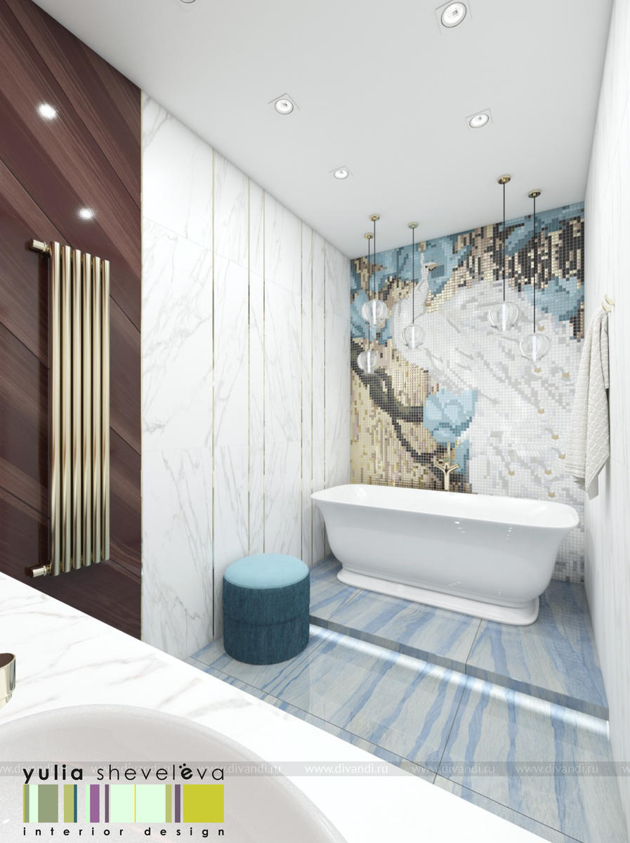 В проекте переплетаются элементы разных стилей, текстур и материалов в отделке и декоре – деревянные и зеркальные поверхности, мрамор, латунь и нежный текстиль. Интерьер выполнен в нейтральной теплой гамме, а в качестве акцентов использованы зеленые и синие оттенки.