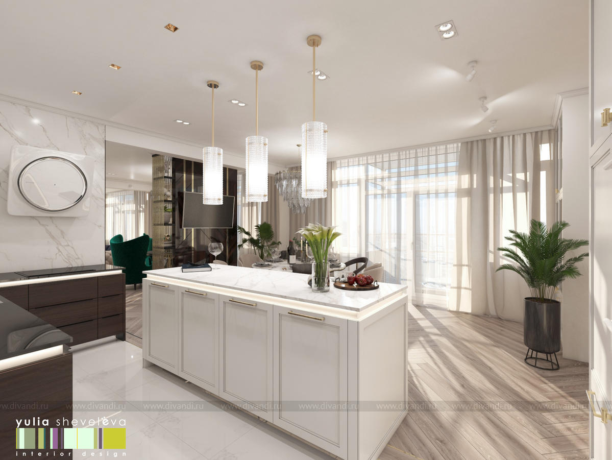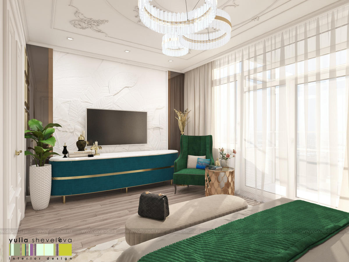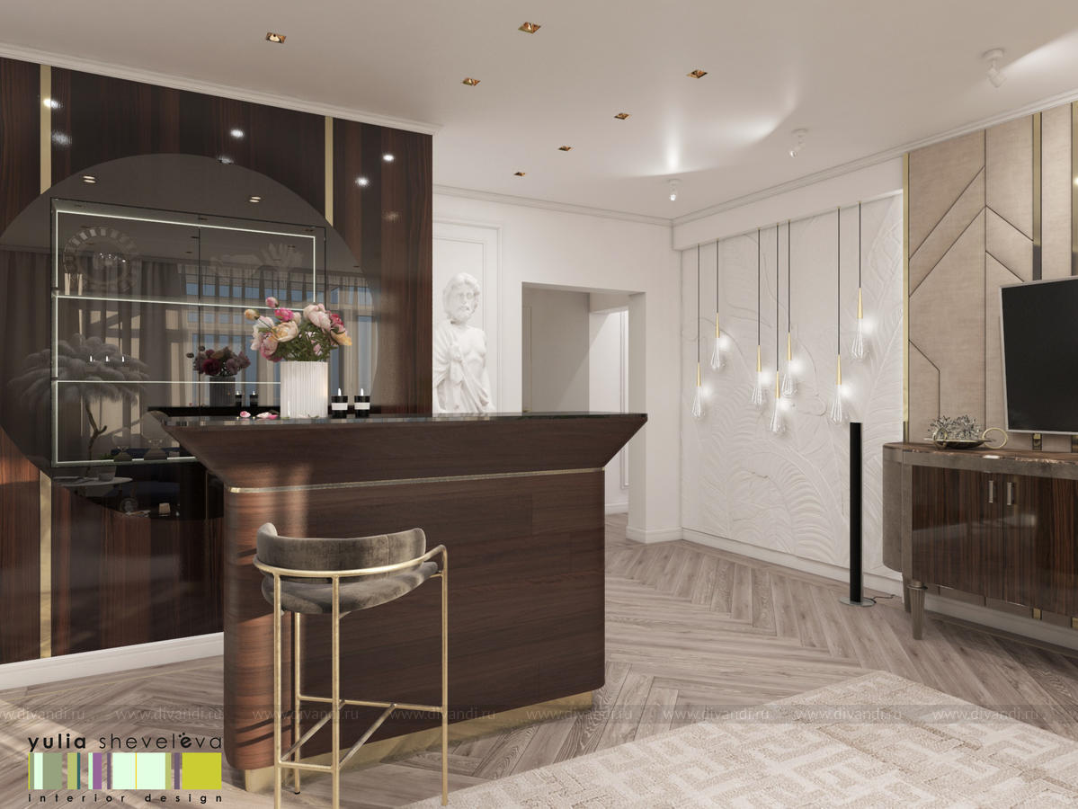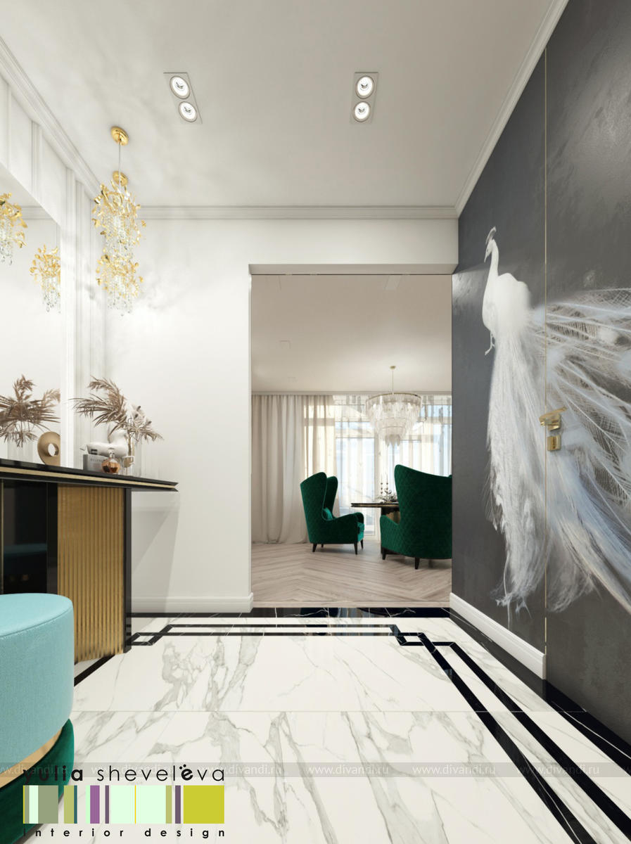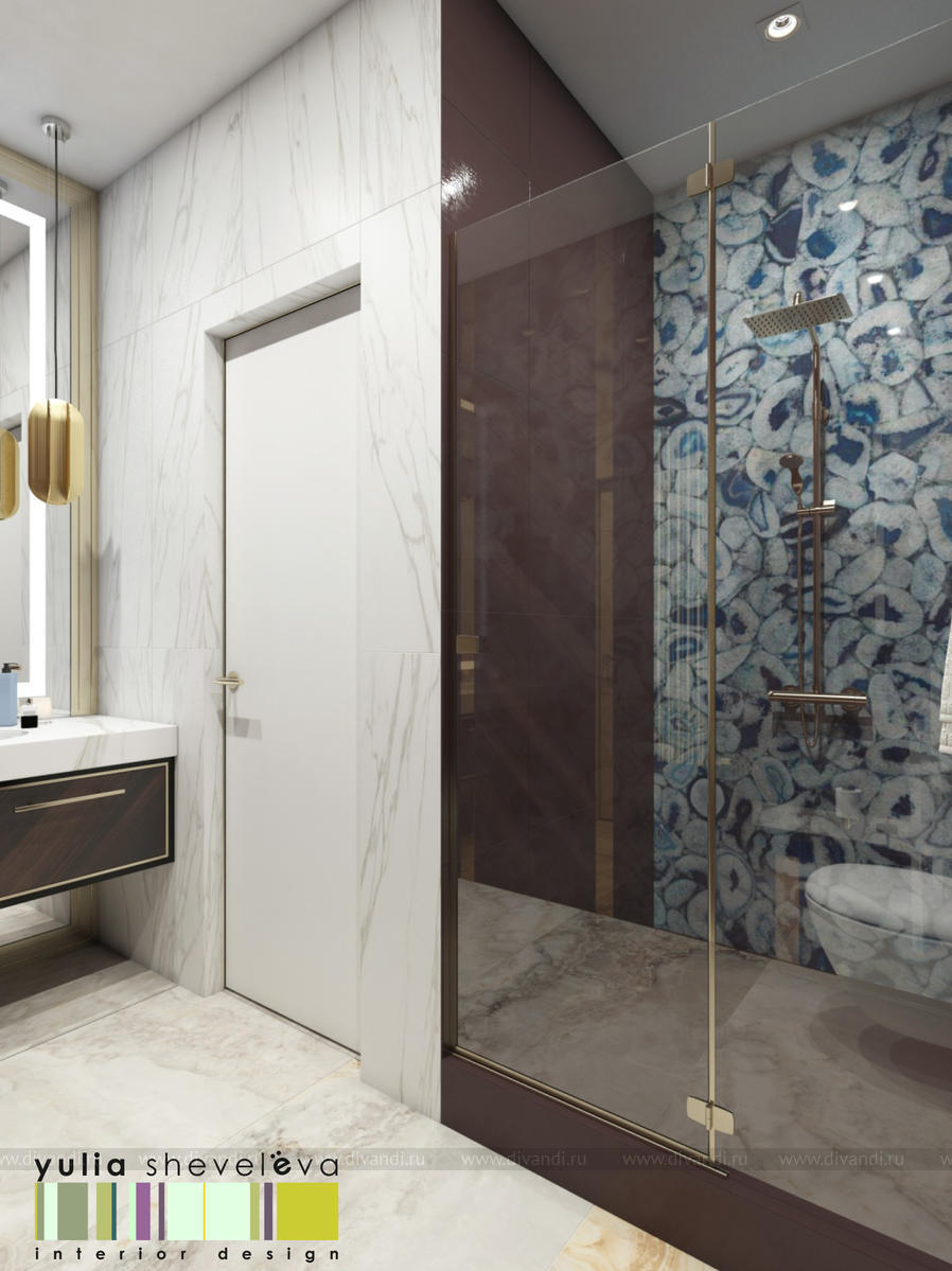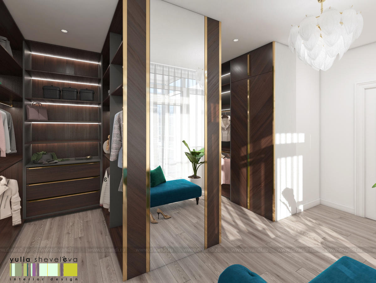 В проекте переплетаются элементы разных стилей, текстур и материалов в отделке и декоре – деревянные и зеркальные поверхности, мрамор, латунь и нежный текстиль. Интерьер выполнен в нейтральной теплой гамме, а в качестве акцентов использованы зеленые и синие оттенки.