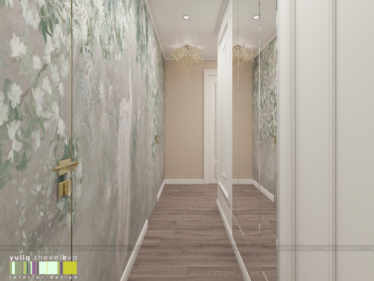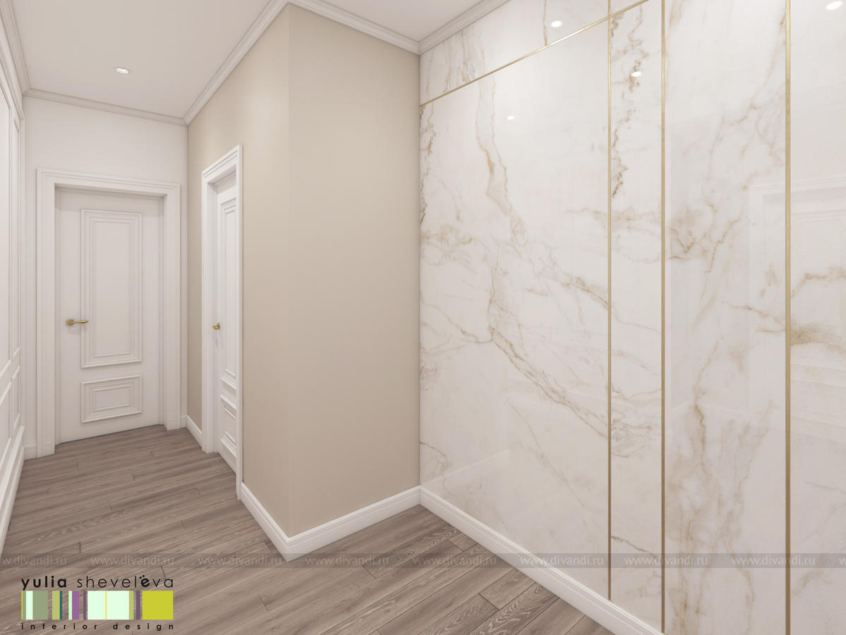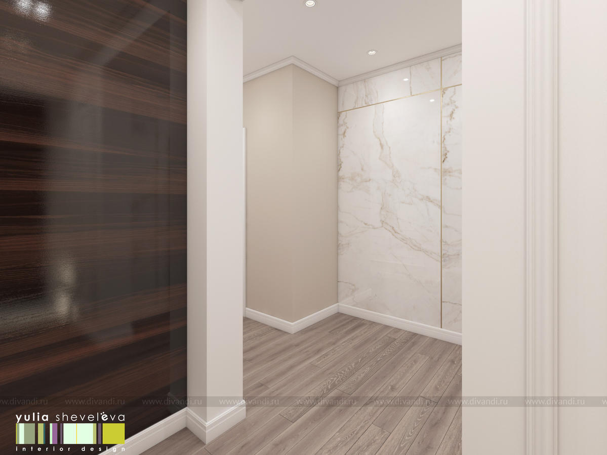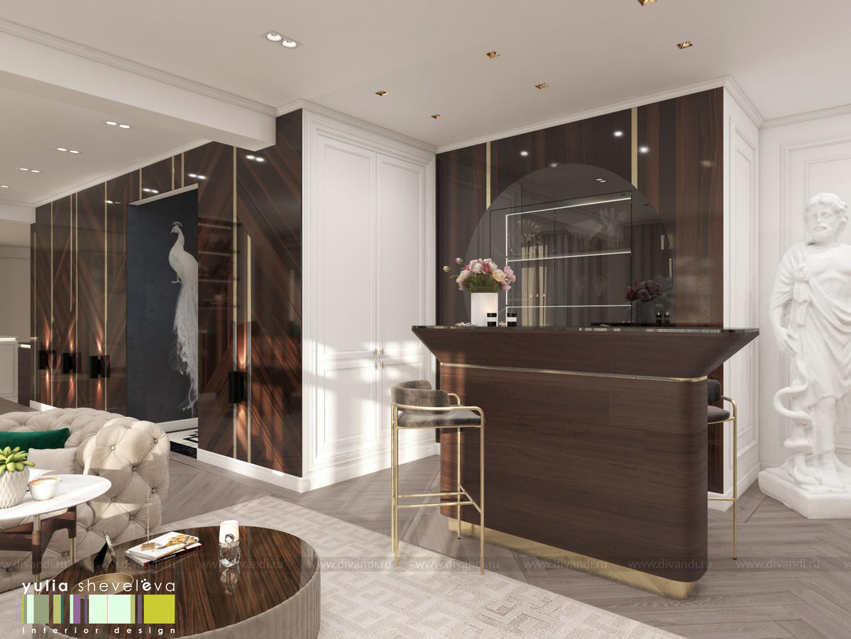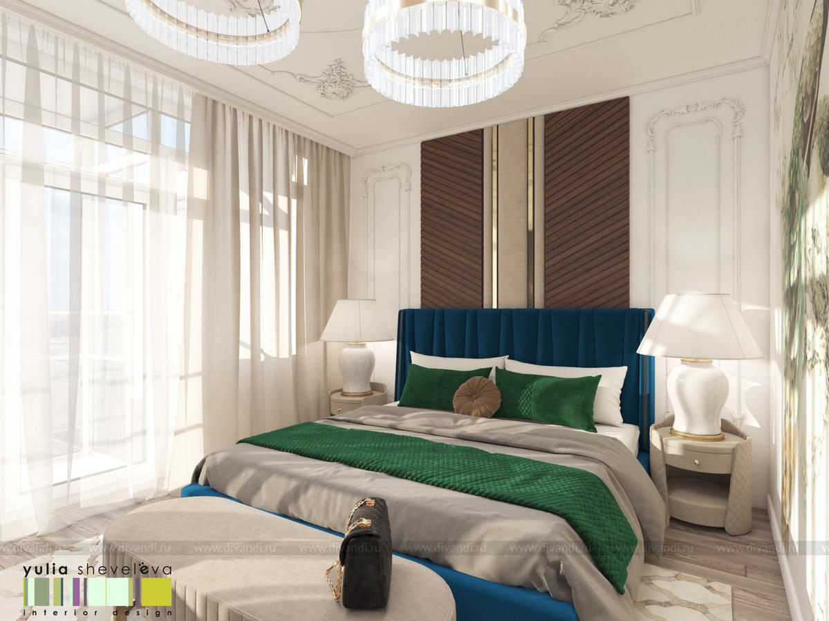 В проекте переплетаются элементы разных стилей, текстур и материалов в отделке и декоре – деревянные и зеркальные поверхности, мрамор, латунь и нежный текстиль. Интерьер выполнен в нейтральной теплой гамме, а в качестве акцентов использованы зеленые и синие оттенки.