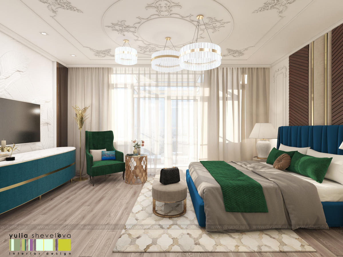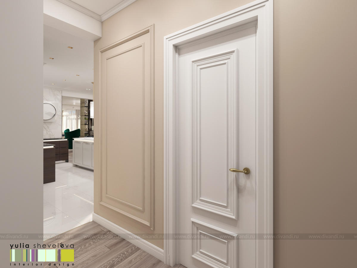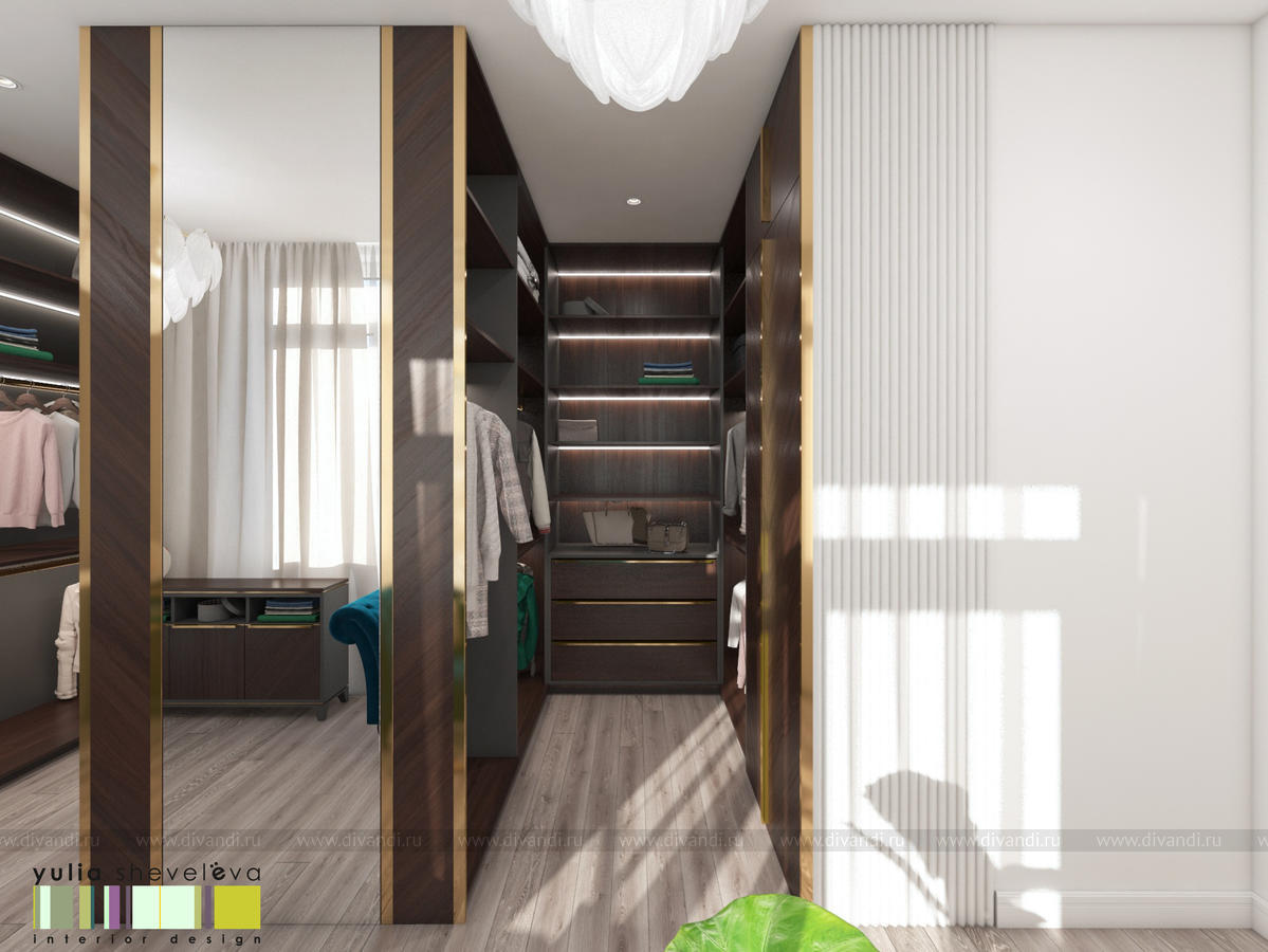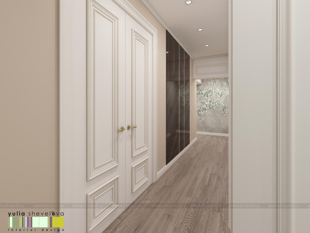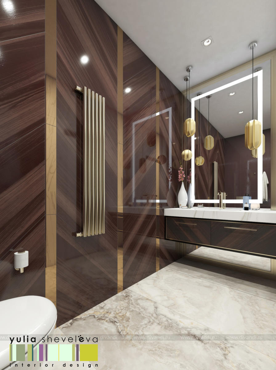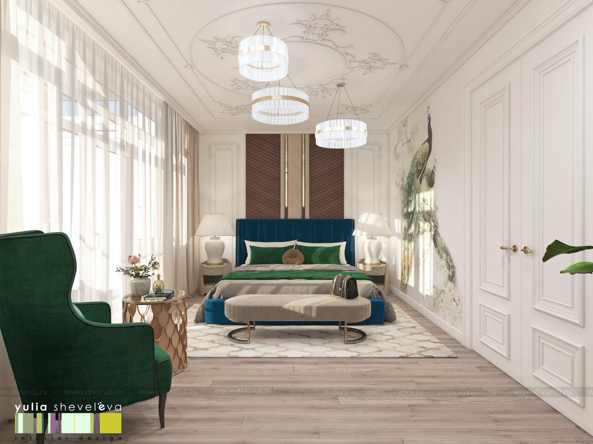 В проекте переплетаются элементы разных стилей, текстур и материалов в отделке и декоре – деревянные и зеркальные поверхности, мрамор, латунь и нежный текстиль. Интерьер выполнен в нейтральной теплой гамме, а в качестве акцентов использованы зеленые и синие оттенки.