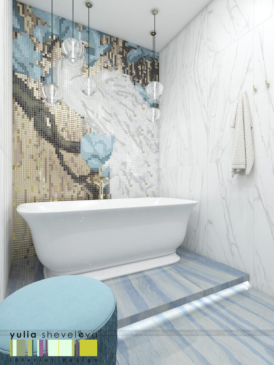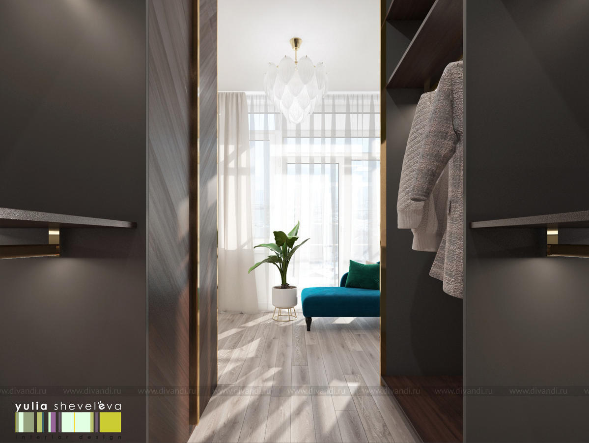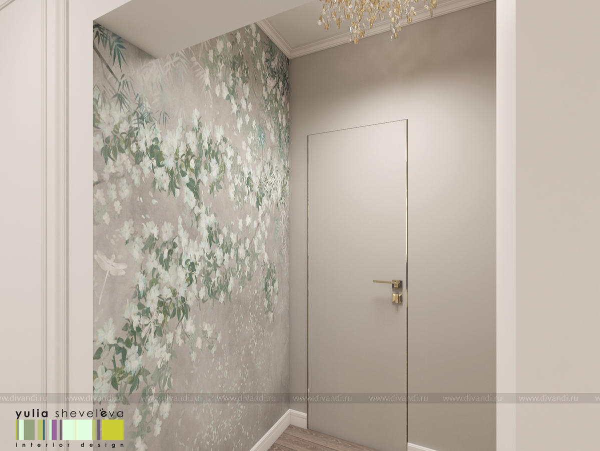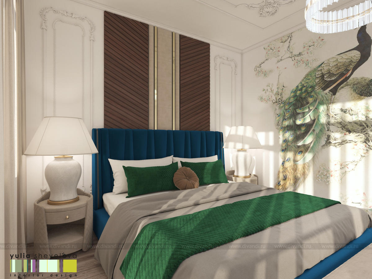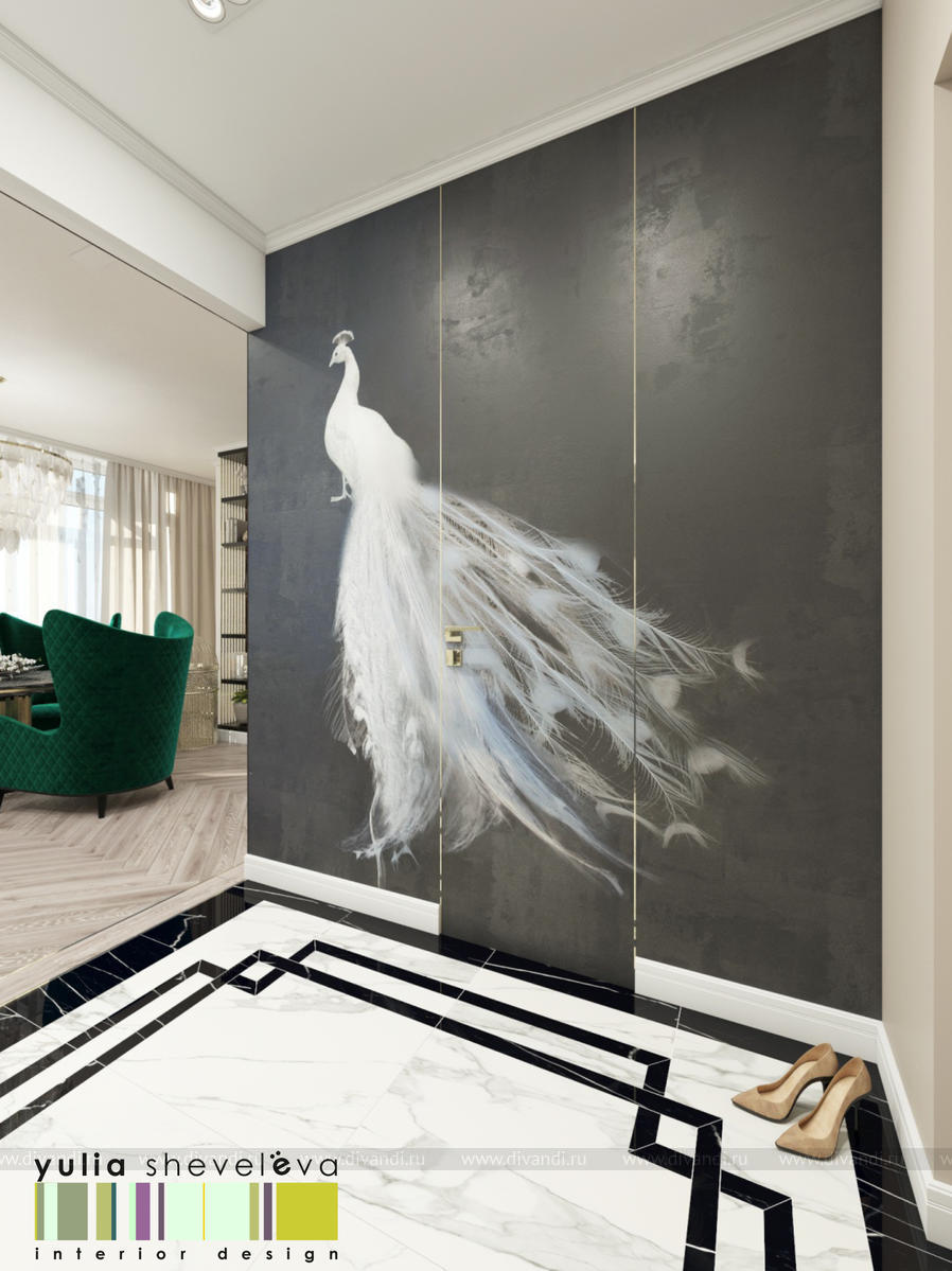 В проекте переплетаются элементы разных стилей, текстур и материалов в отделке и декоре – деревянные и зеркальные поверхности, мрамор, латунь и нежный текстиль. Интерьер выполнен в нейтральной теплой гамме, а в качестве акцентов использованы зеленые и синие оттенки.