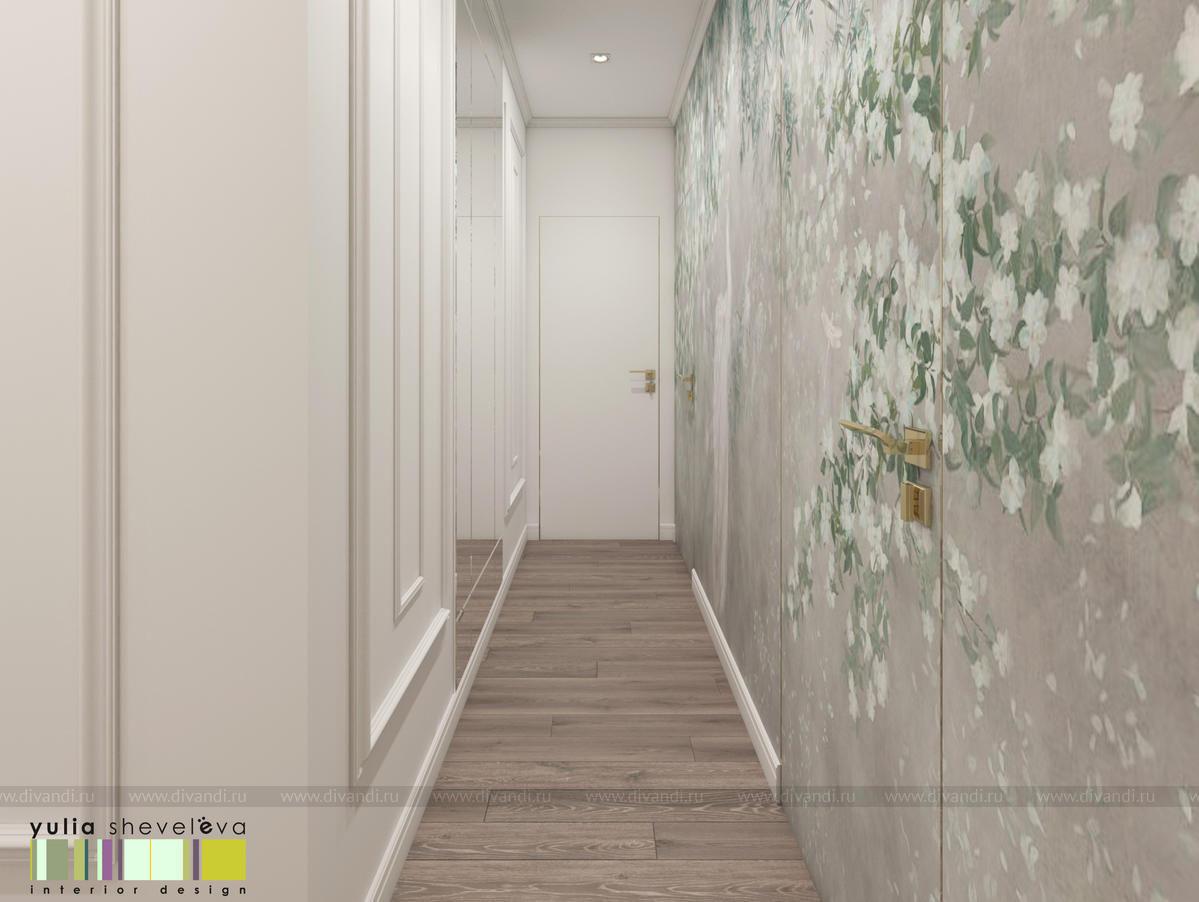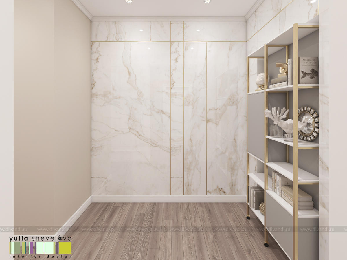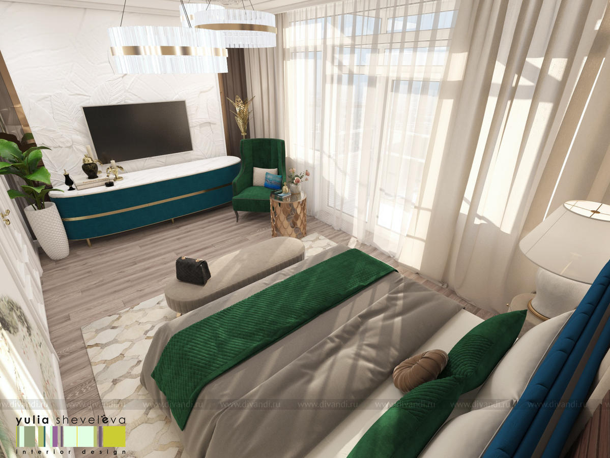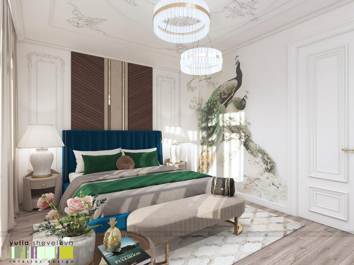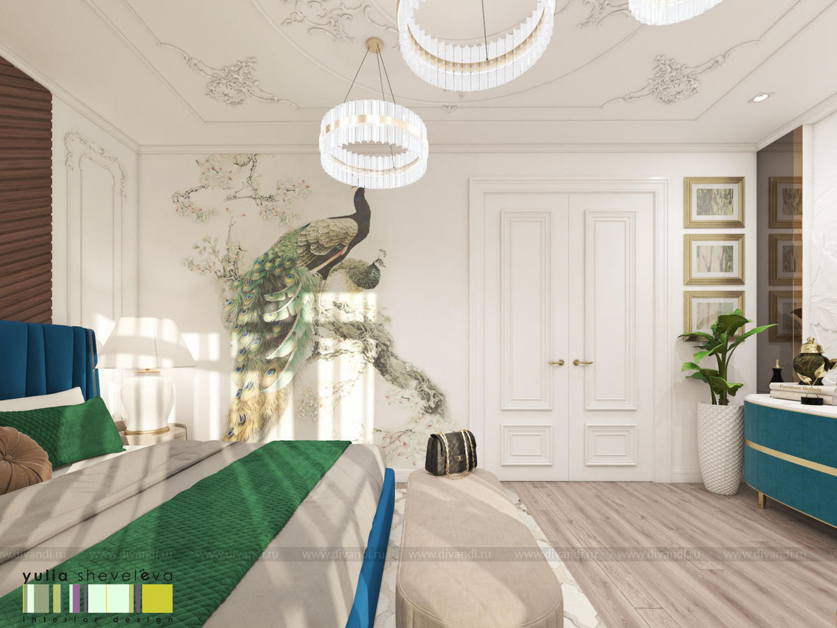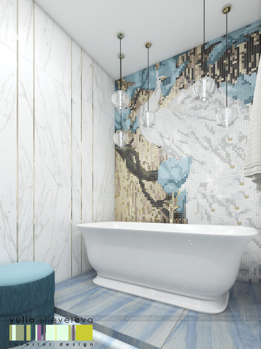 В проекте переплетаются элементы разных стилей, текстур и материалов в отделке и декоре – деревянные и зеркальные поверхности, мрамор, латунь и нежный текстиль. Интерьер выполнен в нейтральной теплой гамме, а в качестве акцентов использованы зеленые и синие оттенки.