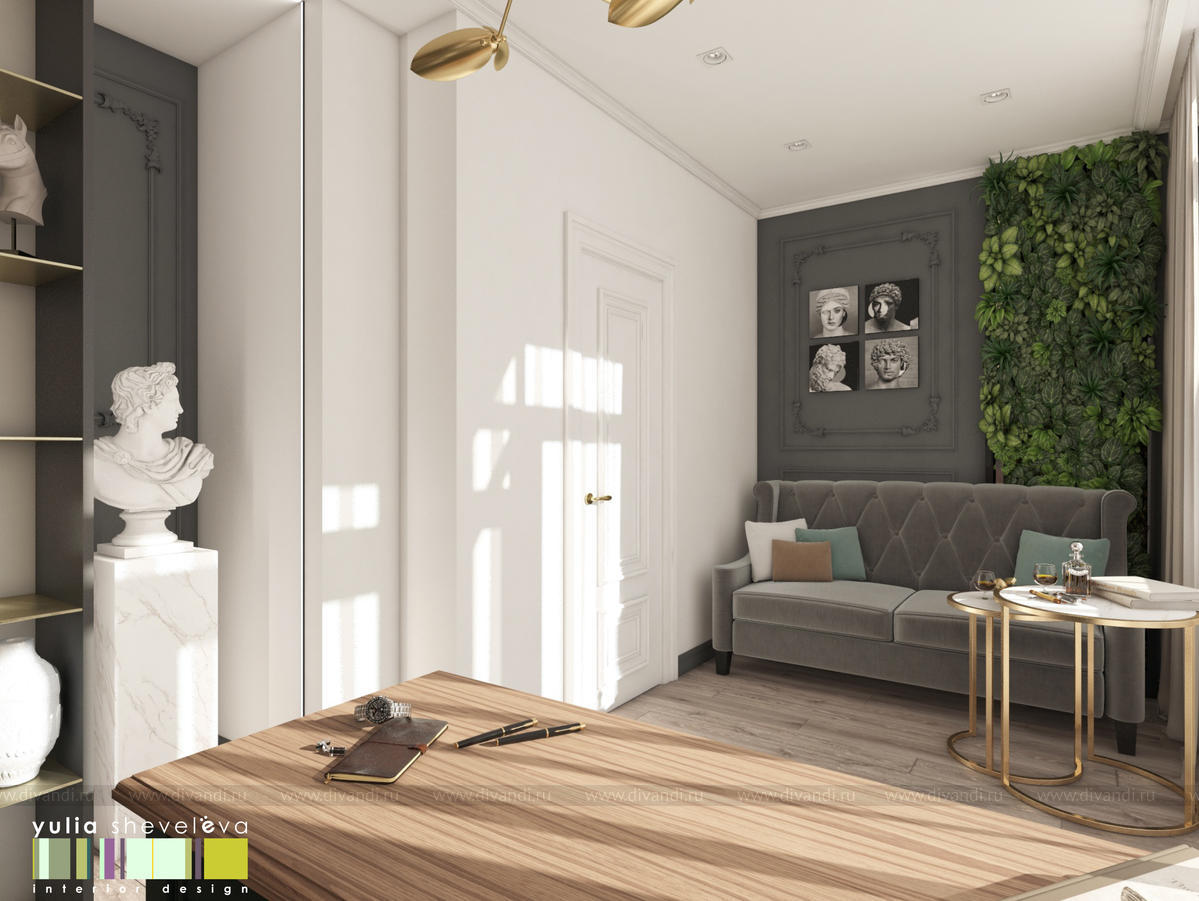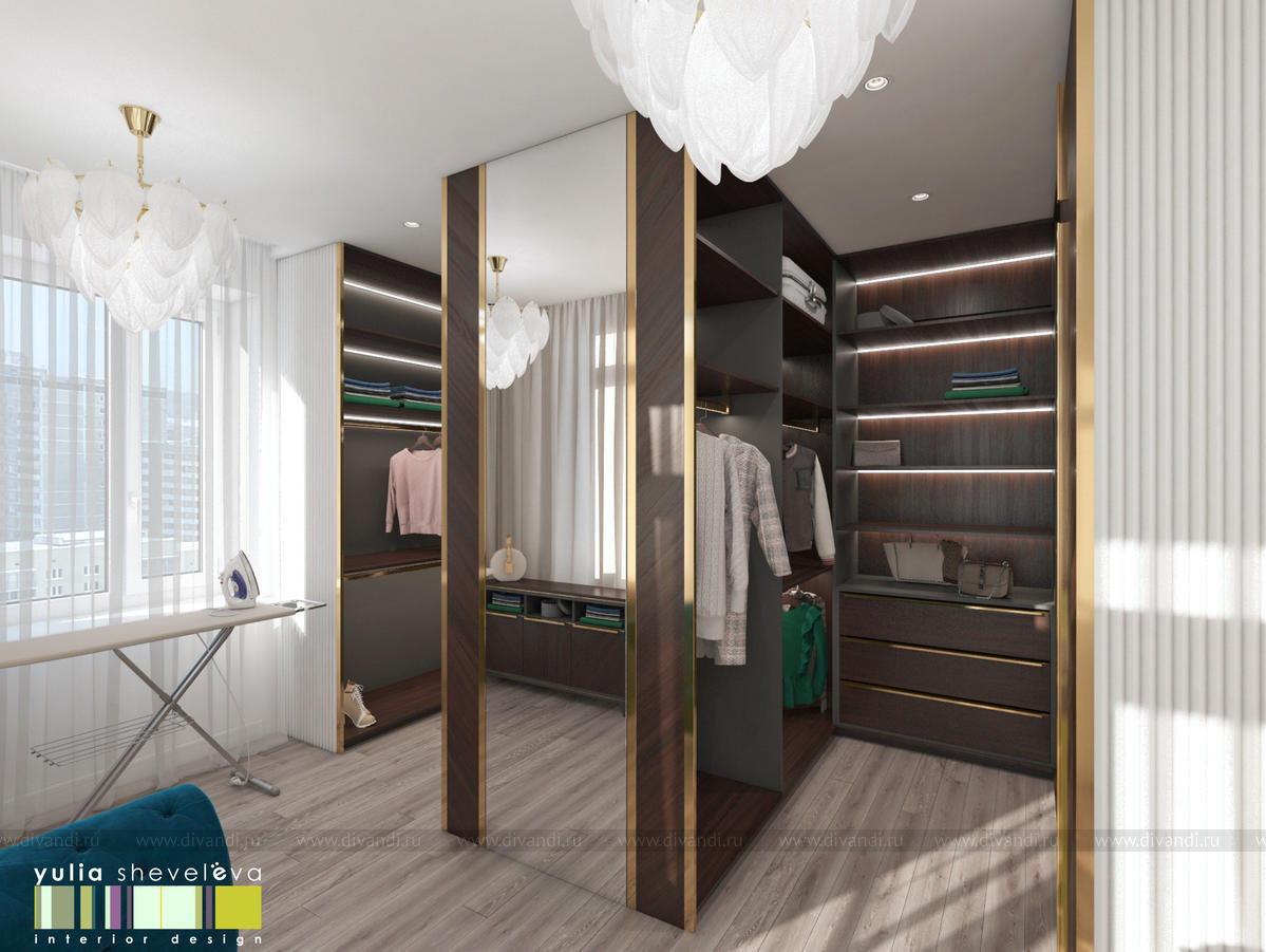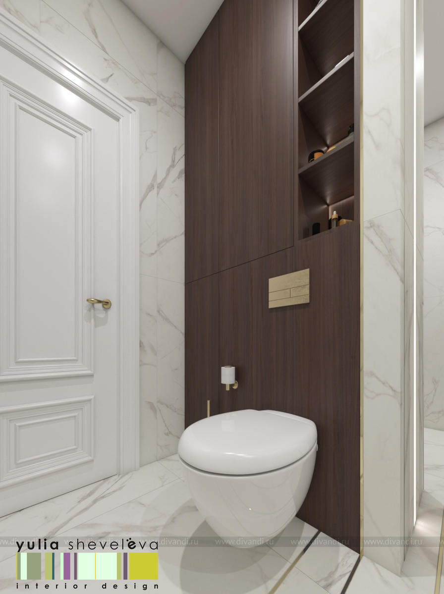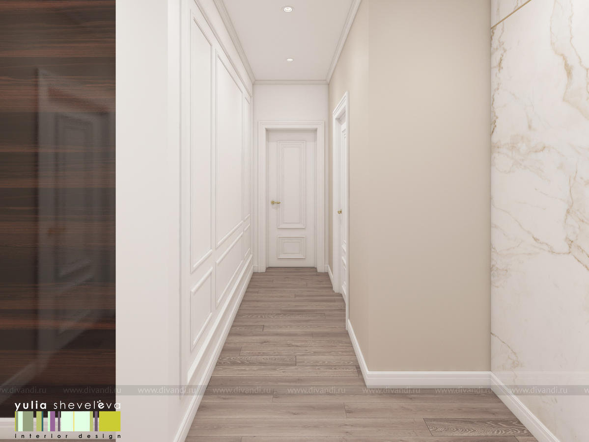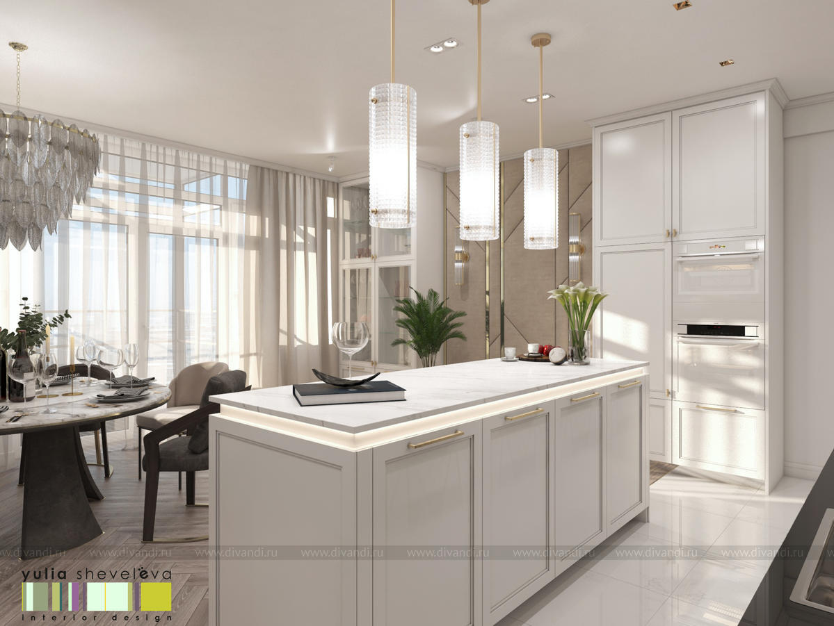 В проекте переплетаются элементы разных стилей, текстур и материалов в отделке и декоре – деревянные и зеркальные поверхности, мрамор, латунь и нежный текстиль. Интерьер выполнен в нейтральной теплой гамме, а в качестве акцентов использованы зеленые и синие оттенки.