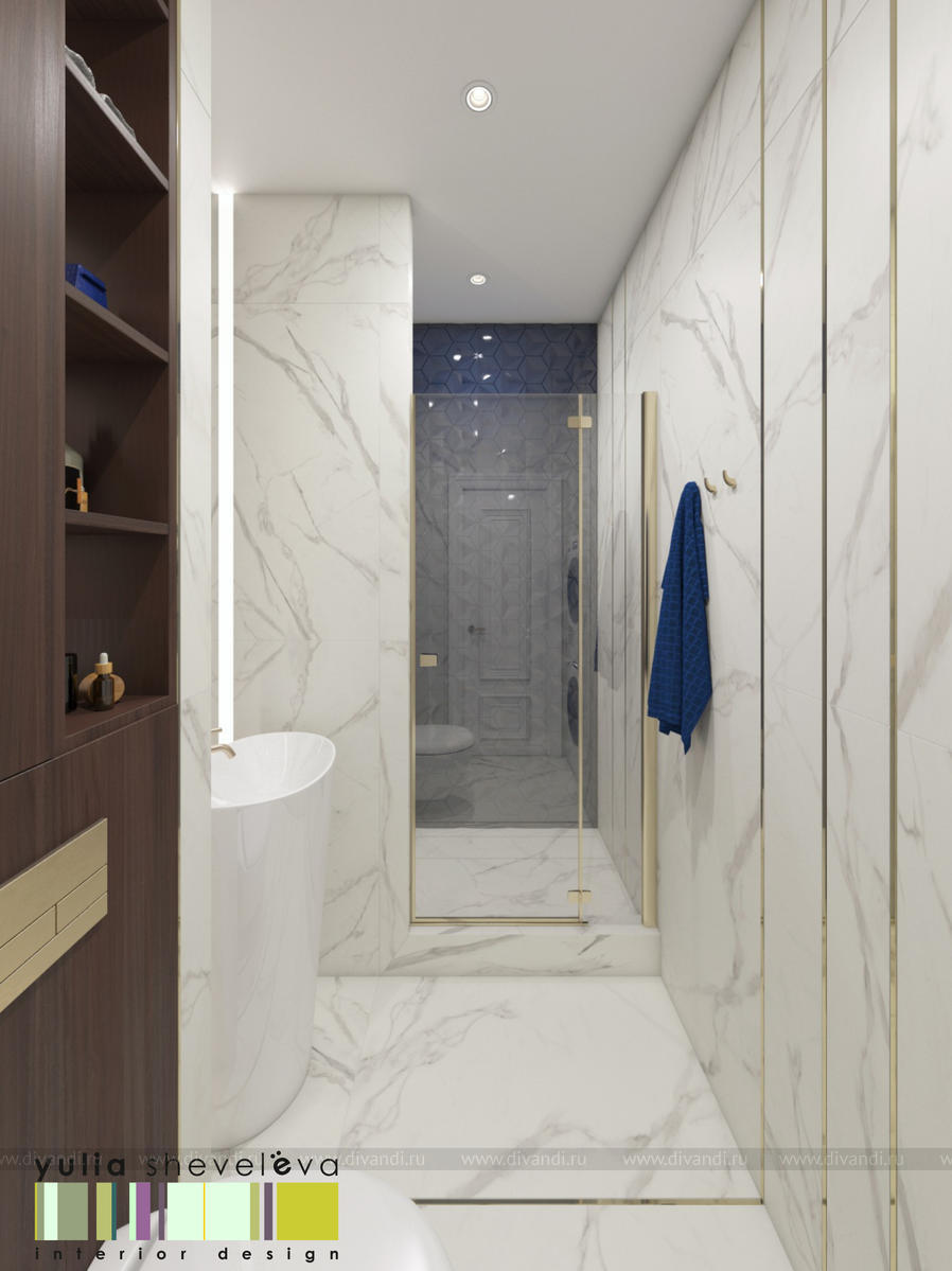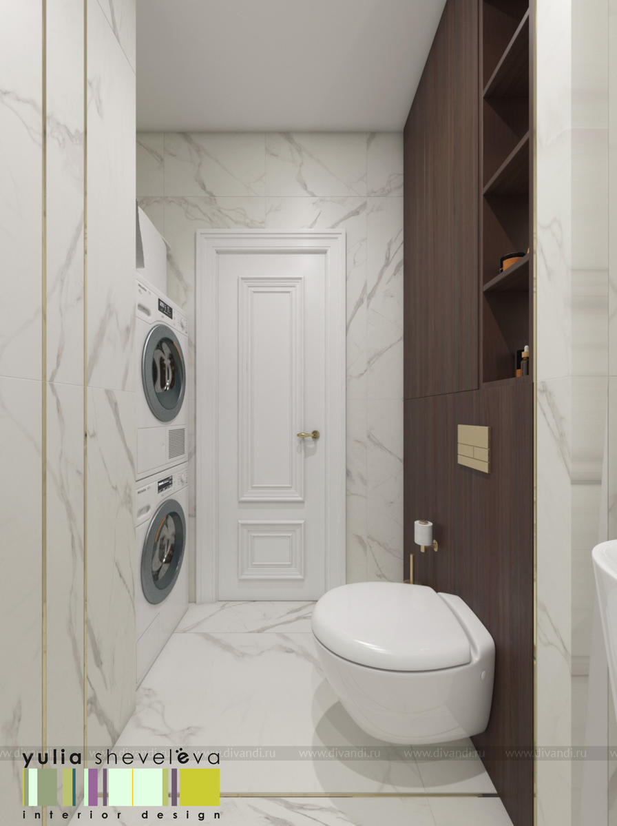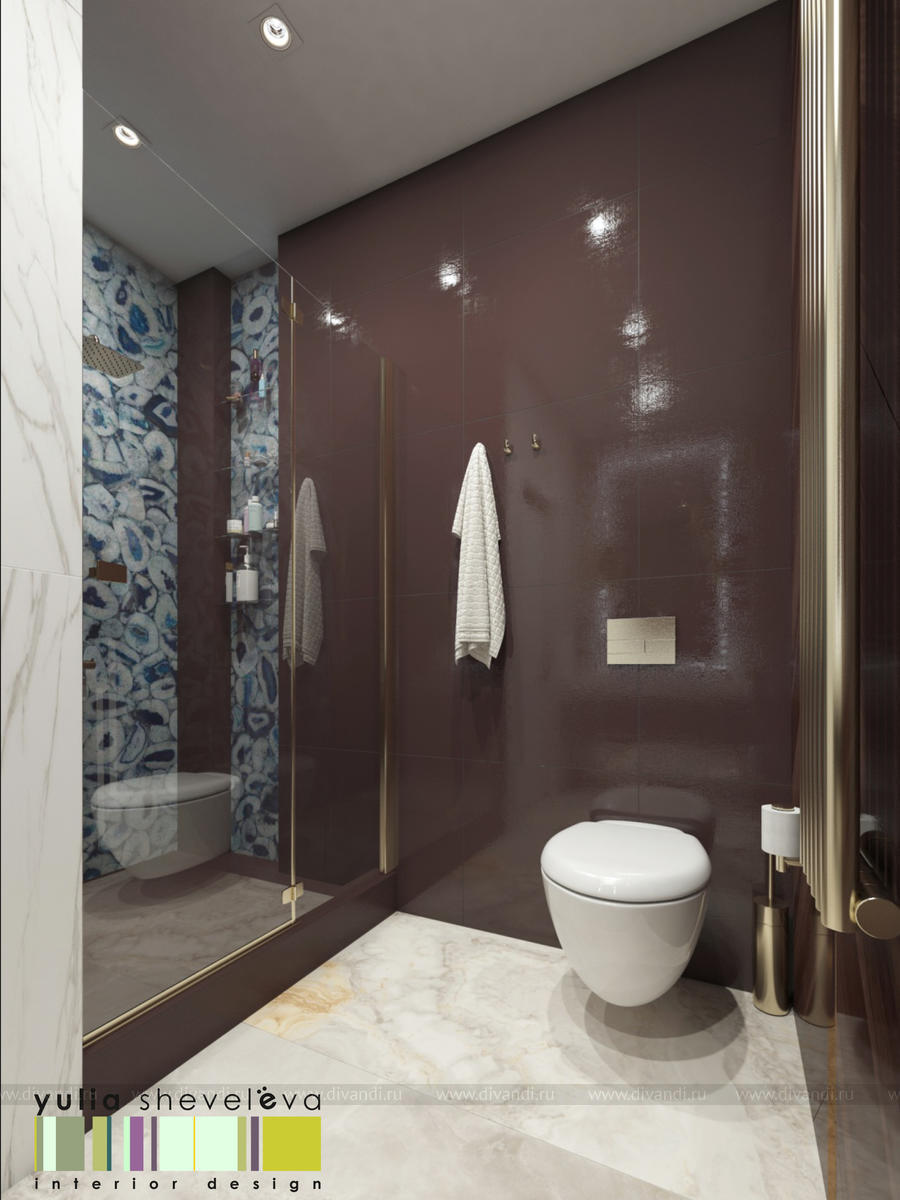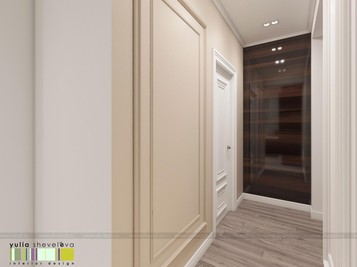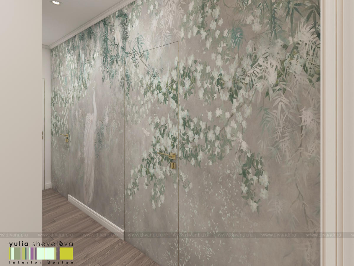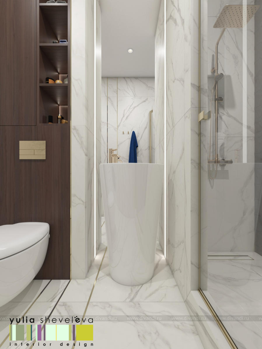 В проекте переплетаются элементы разных стилей, текстур и материалов в отделке и декоре – деревянные и зеркальные поверхности, мрамор, латунь и нежный текстиль. Интерьер выполнен в нейтральной теплой гамме, а в качестве акцентов использованы зеленые и синие оттенки.