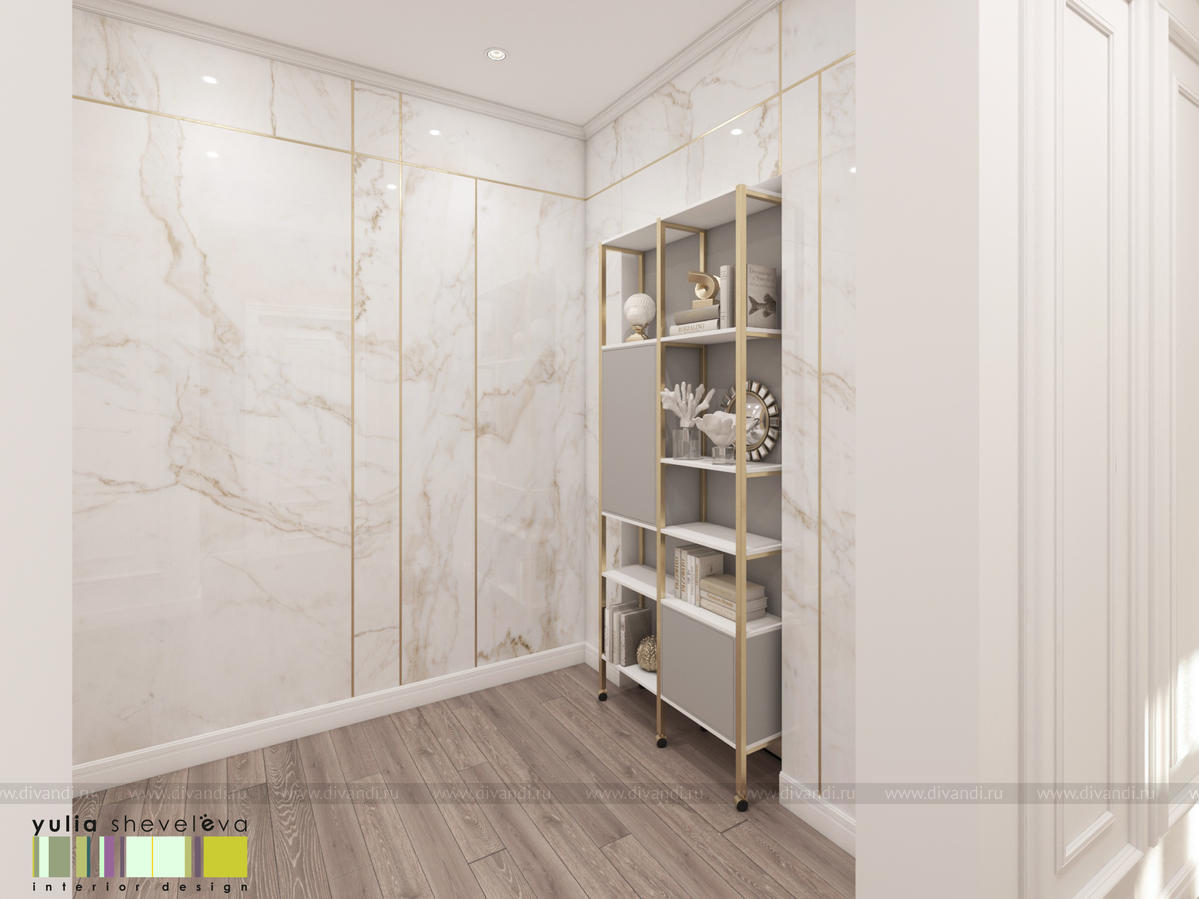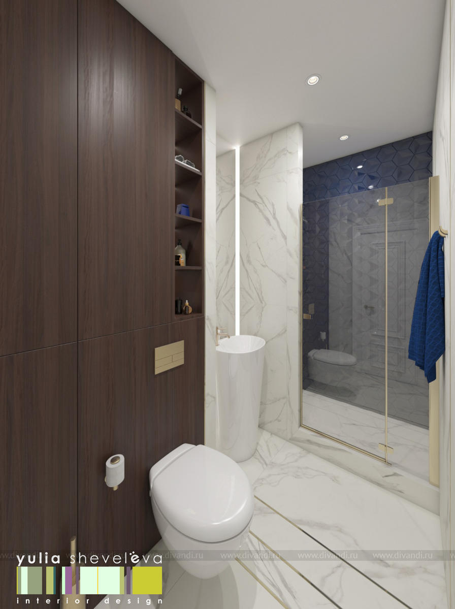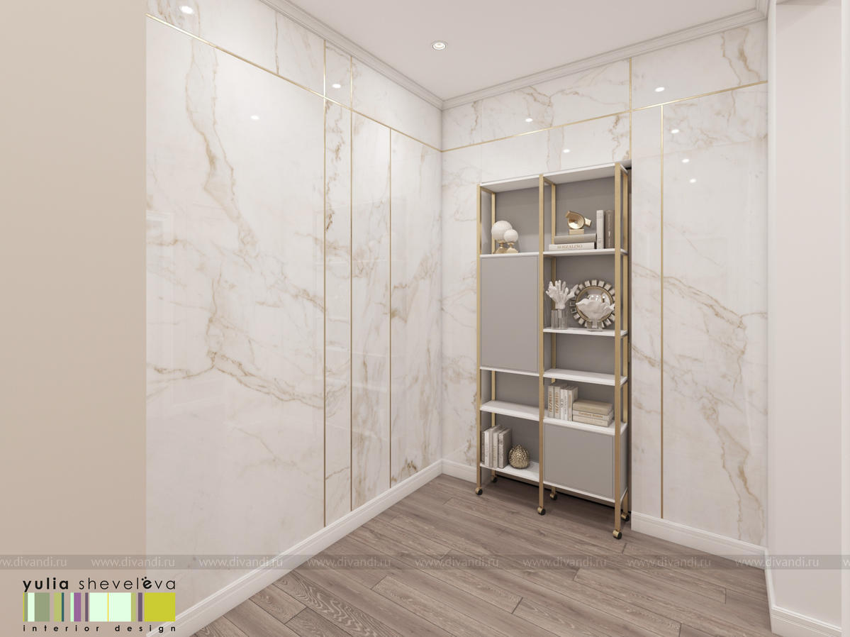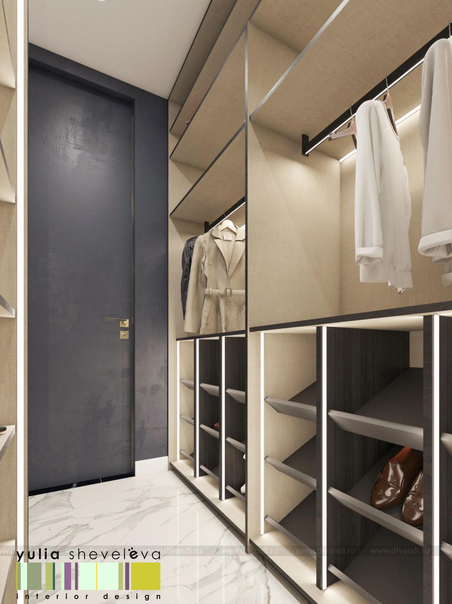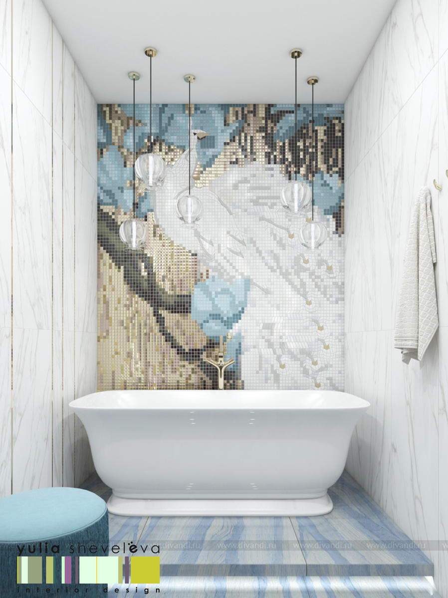 В проекте переплетаются элементы разных стилей, текстур и материалов в отделке и декоре – деревянные и зеркальные поверхности, мрамор, латунь и нежный текстиль. Интерьер выполнен в нейтральной теплой гамме, а в качестве акцентов использованы зеленые и синие оттенки.