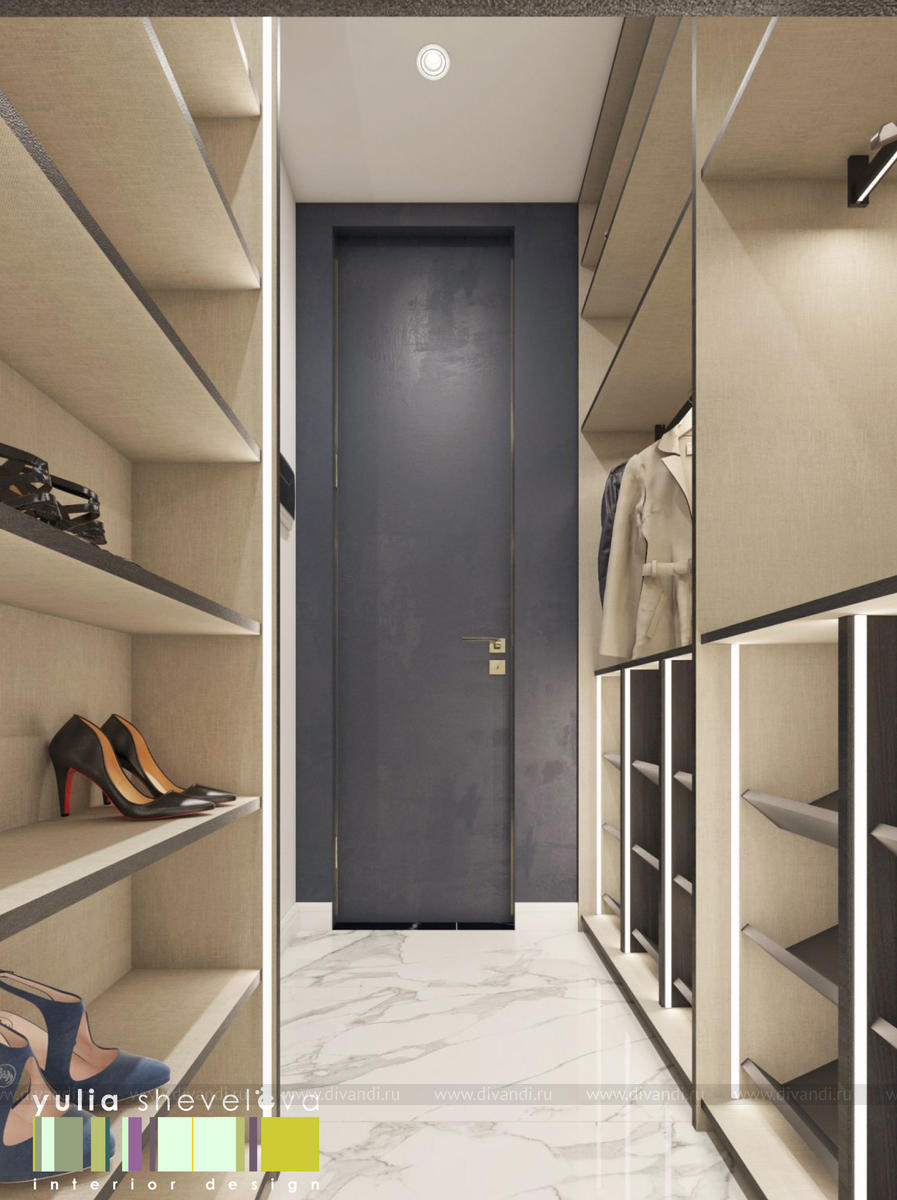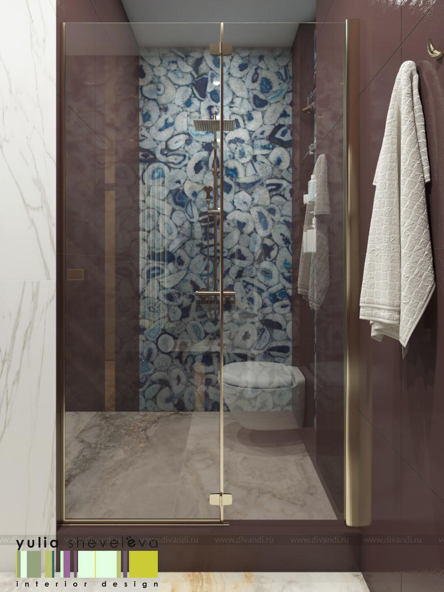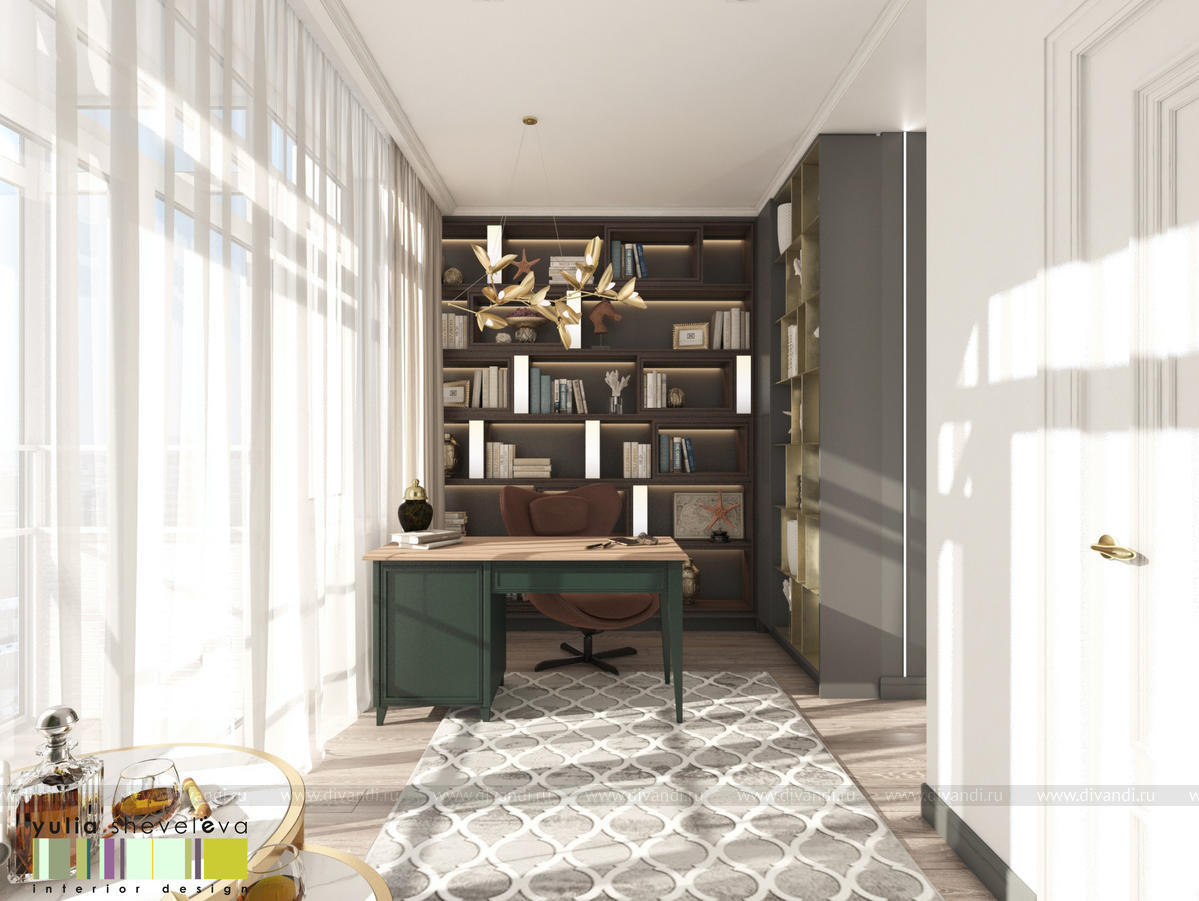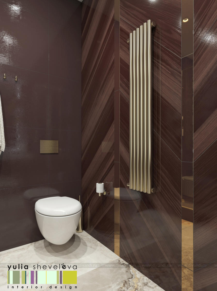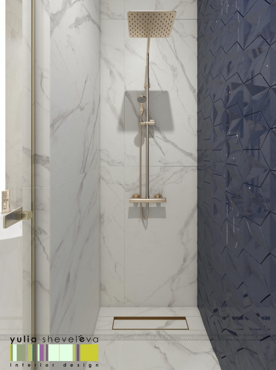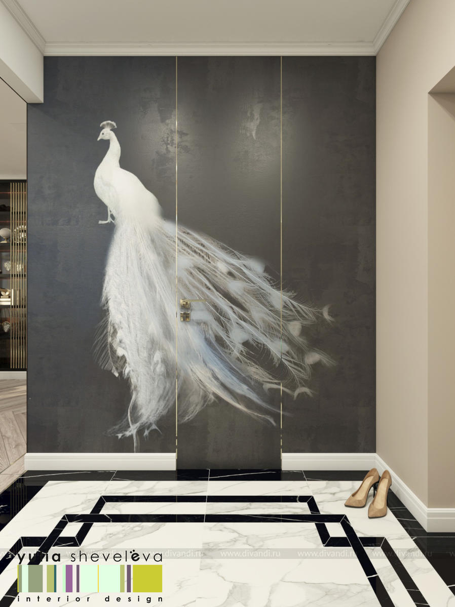 В проекте переплетаются элементы разных стилей, текстур и материалов в отделке и декоре – деревянные и зеркальные поверхности, мрамор, латунь и нежный текстиль. Интерьер выполнен в нейтральной теплой гамме, а в качестве акцентов использованы зеленые и синие оттенки.