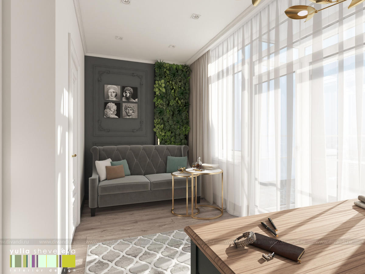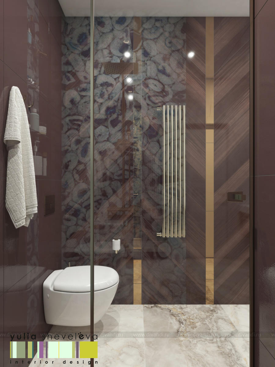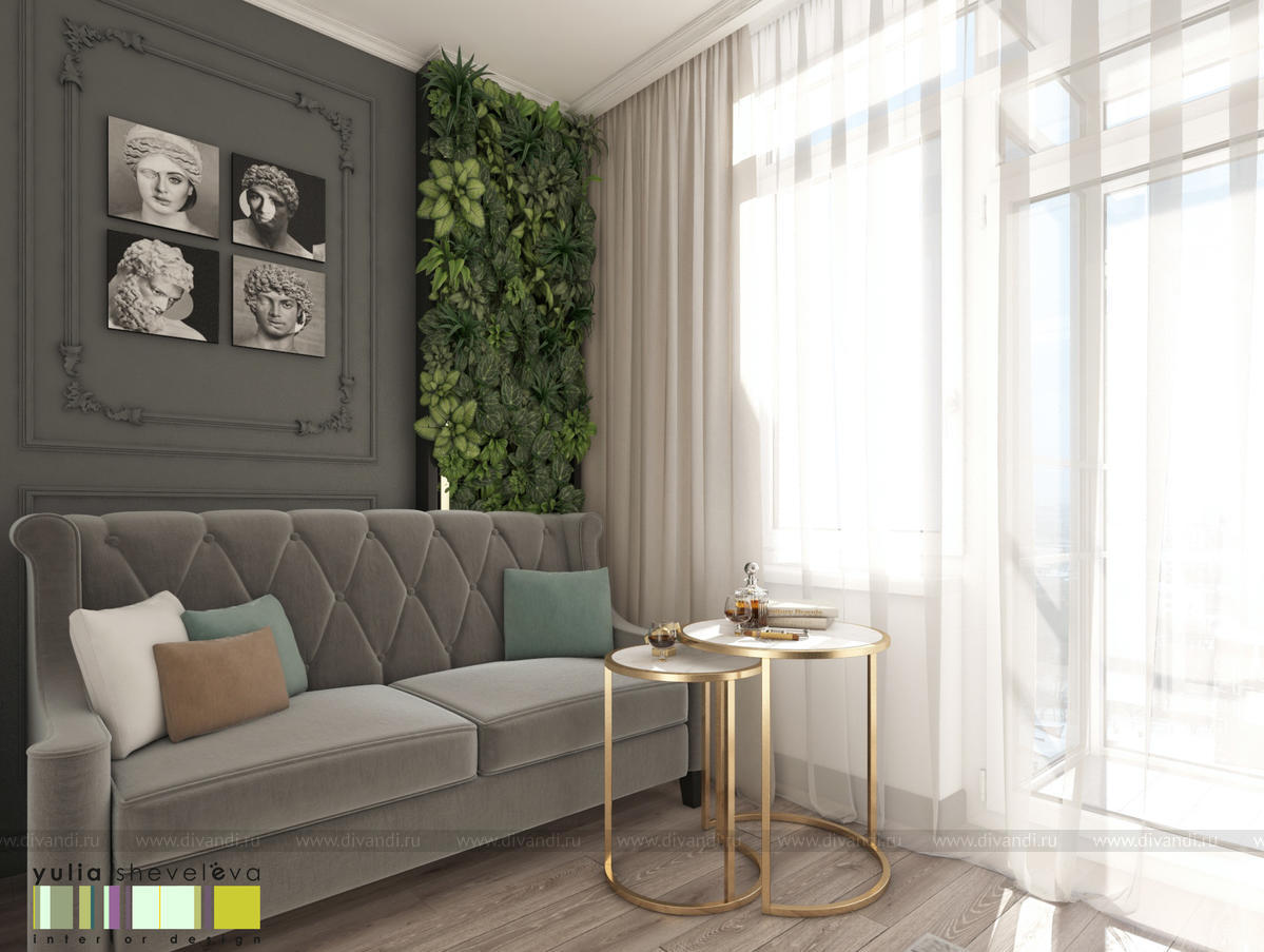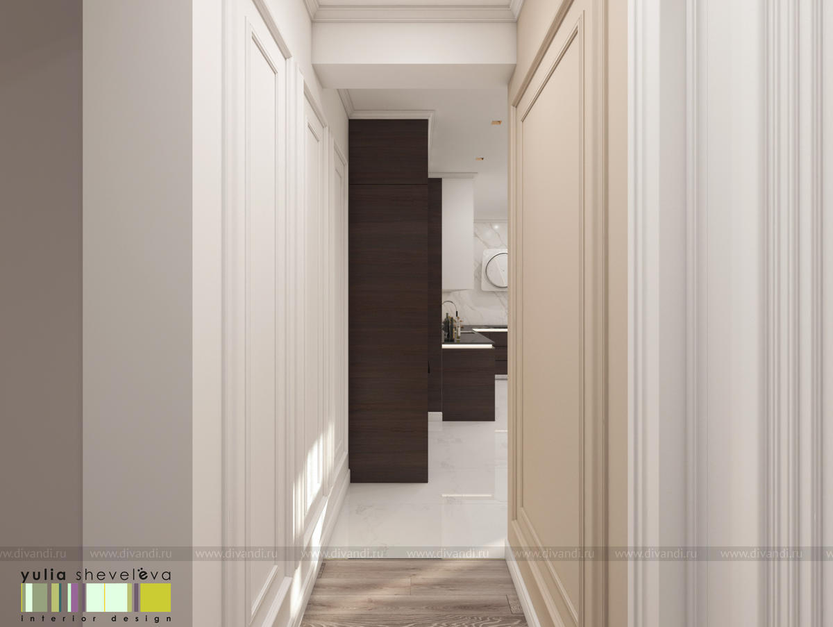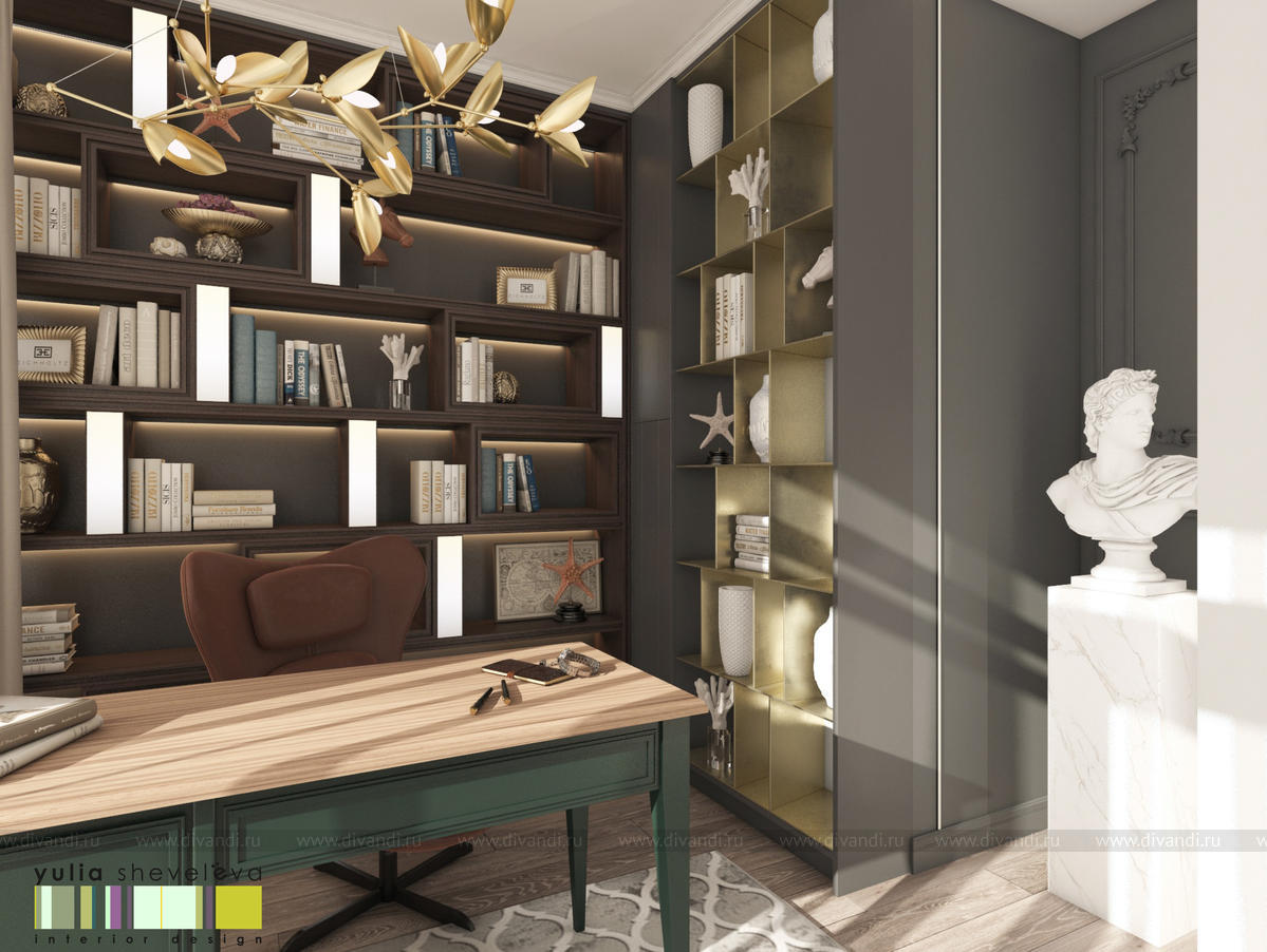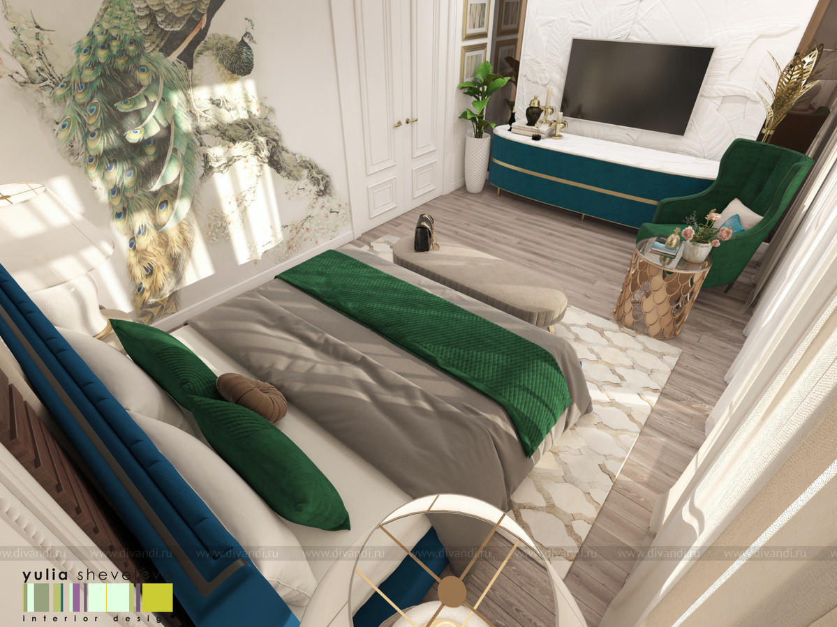 В проекте переплетаются элементы разных стилей, текстур и материалов в отделке и декоре – деревянные и зеркальные поверхности, мрамор, латунь и нежный текстиль. Интерьер выполнен в нейтральной теплой гамме, а в качестве акцентов использованы зеленые и синие оттенки.