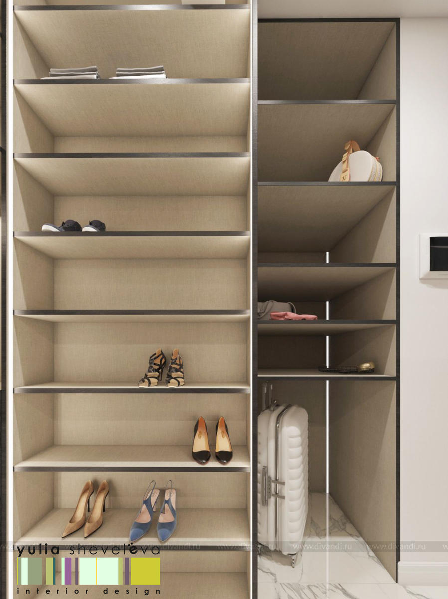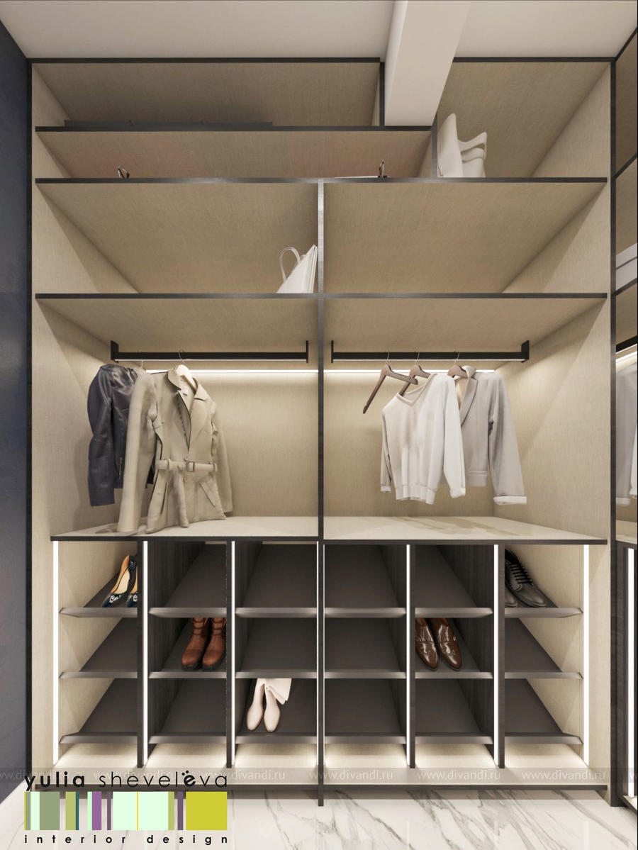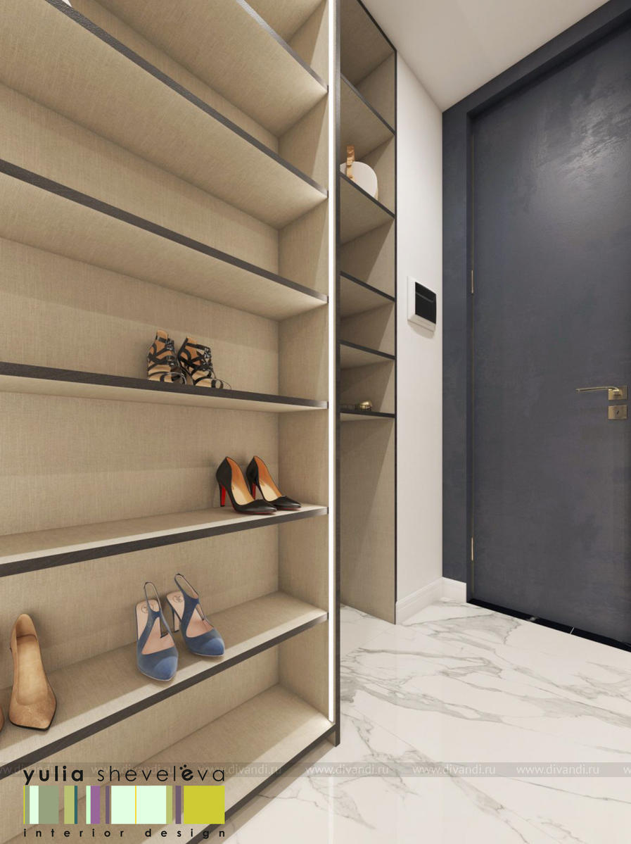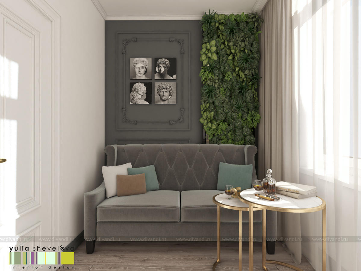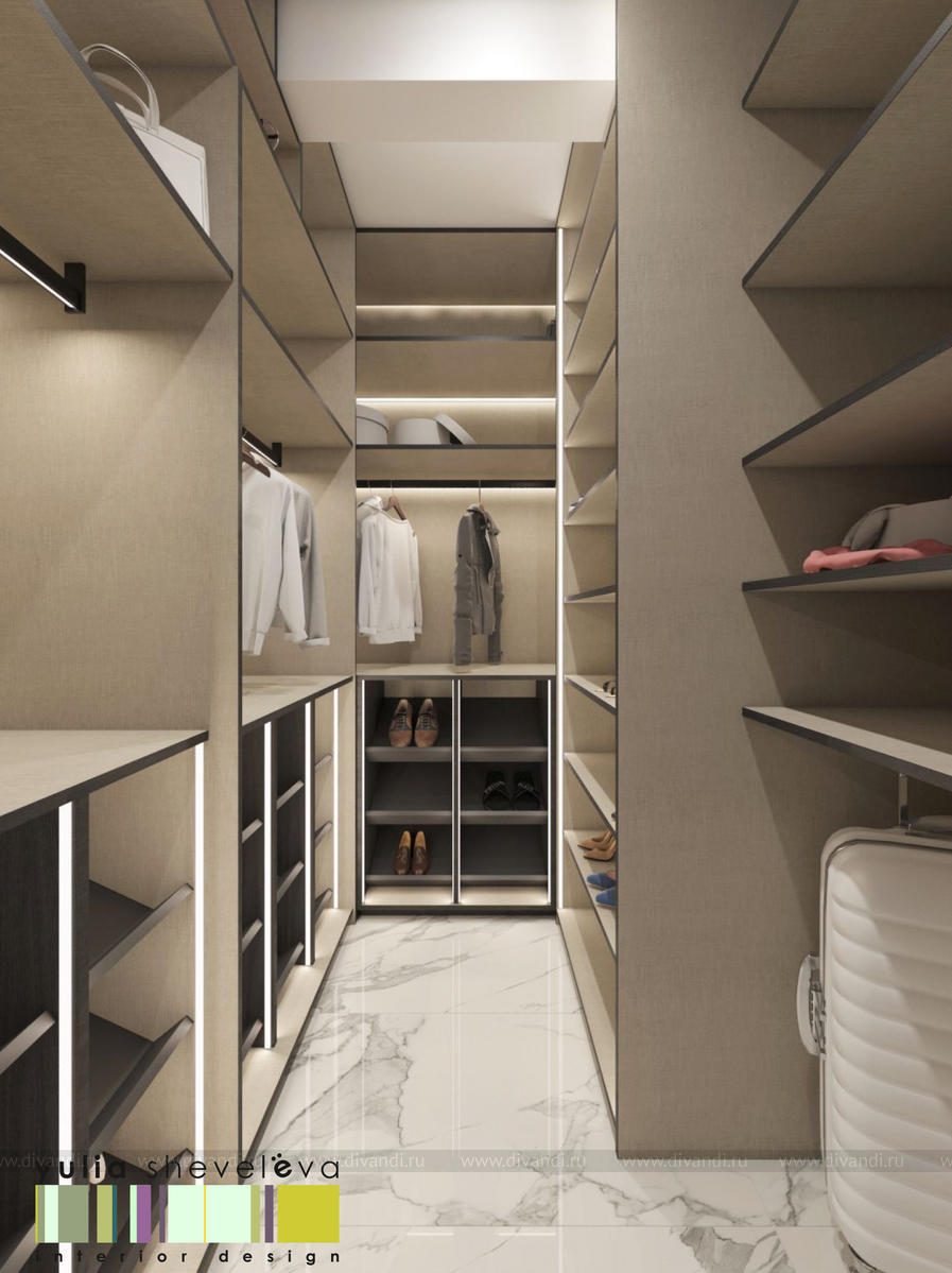 В проекте переплетаются элементы разных стилей, текстур и материалов в отделке и декоре – деревянные и зеркальные поверхности, мрамор, латунь и нежный текстиль. Интерьер выполнен в нейтральной теплой гамме, а в качестве акцентов использованы зеленые и синие оттенки.