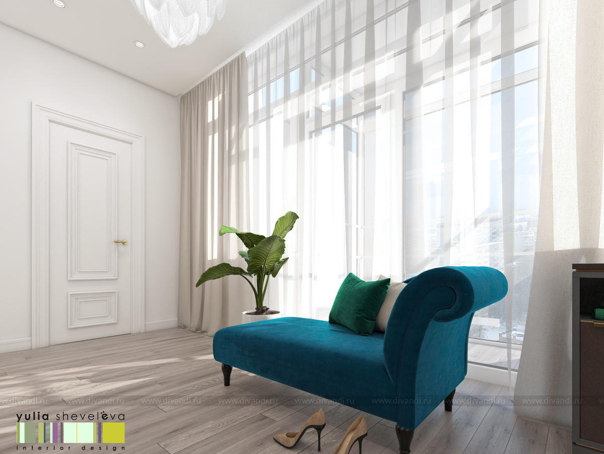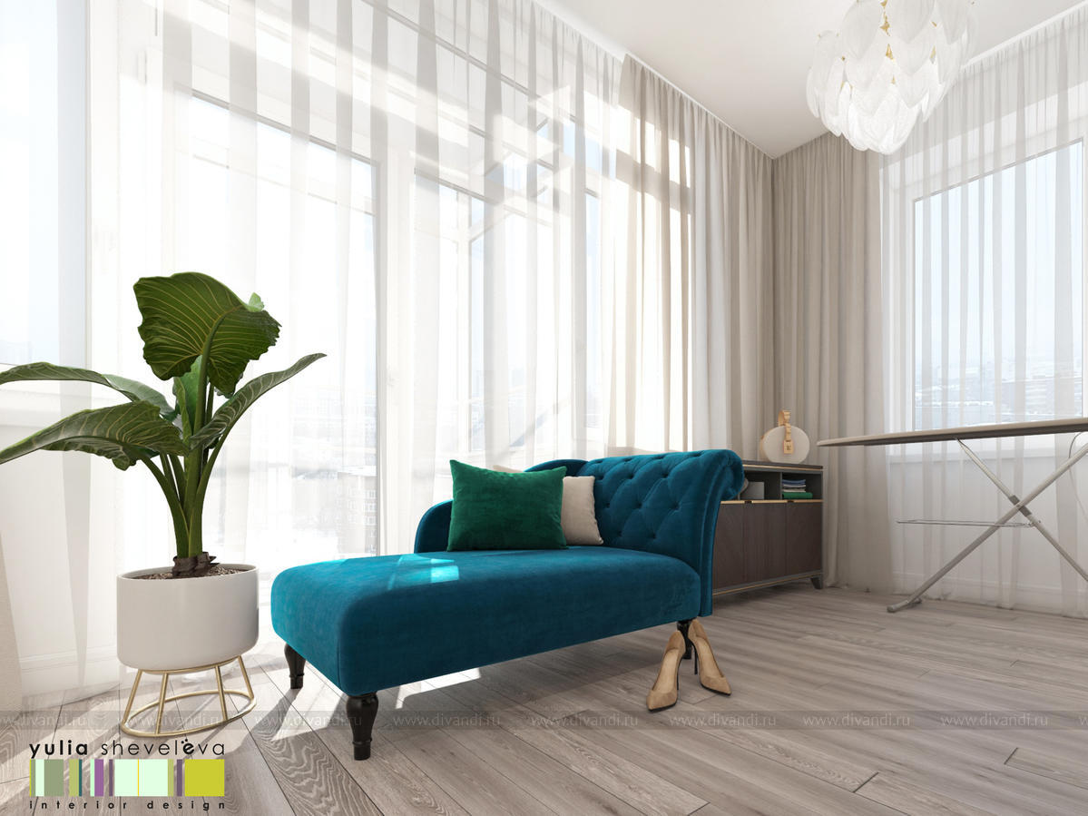 Панорамные окна наполняют пространство светом, а нежный текстиль создается ощущение легкости.