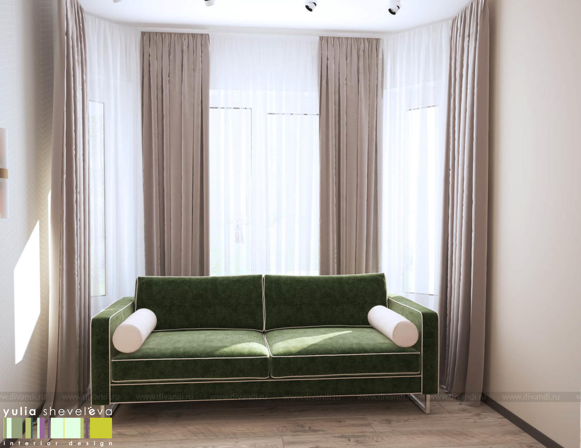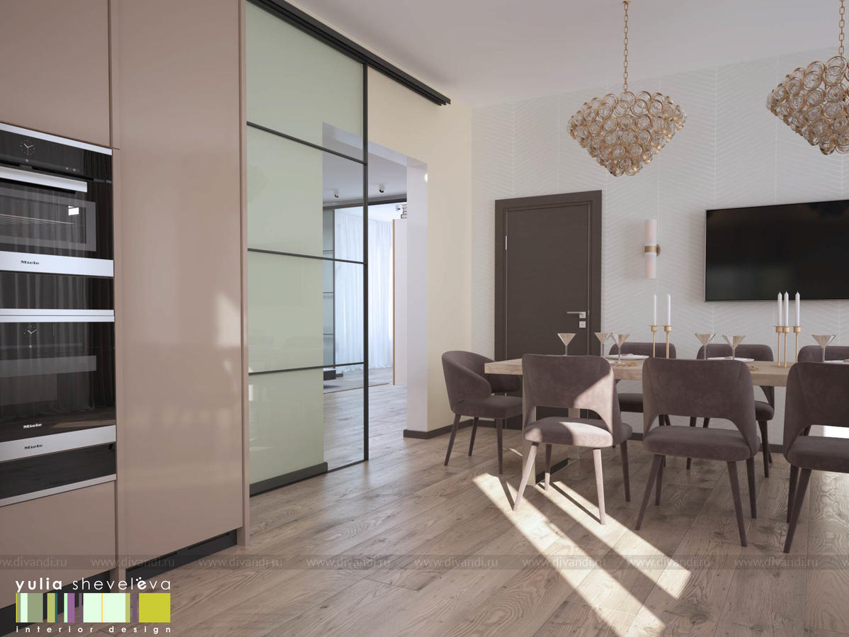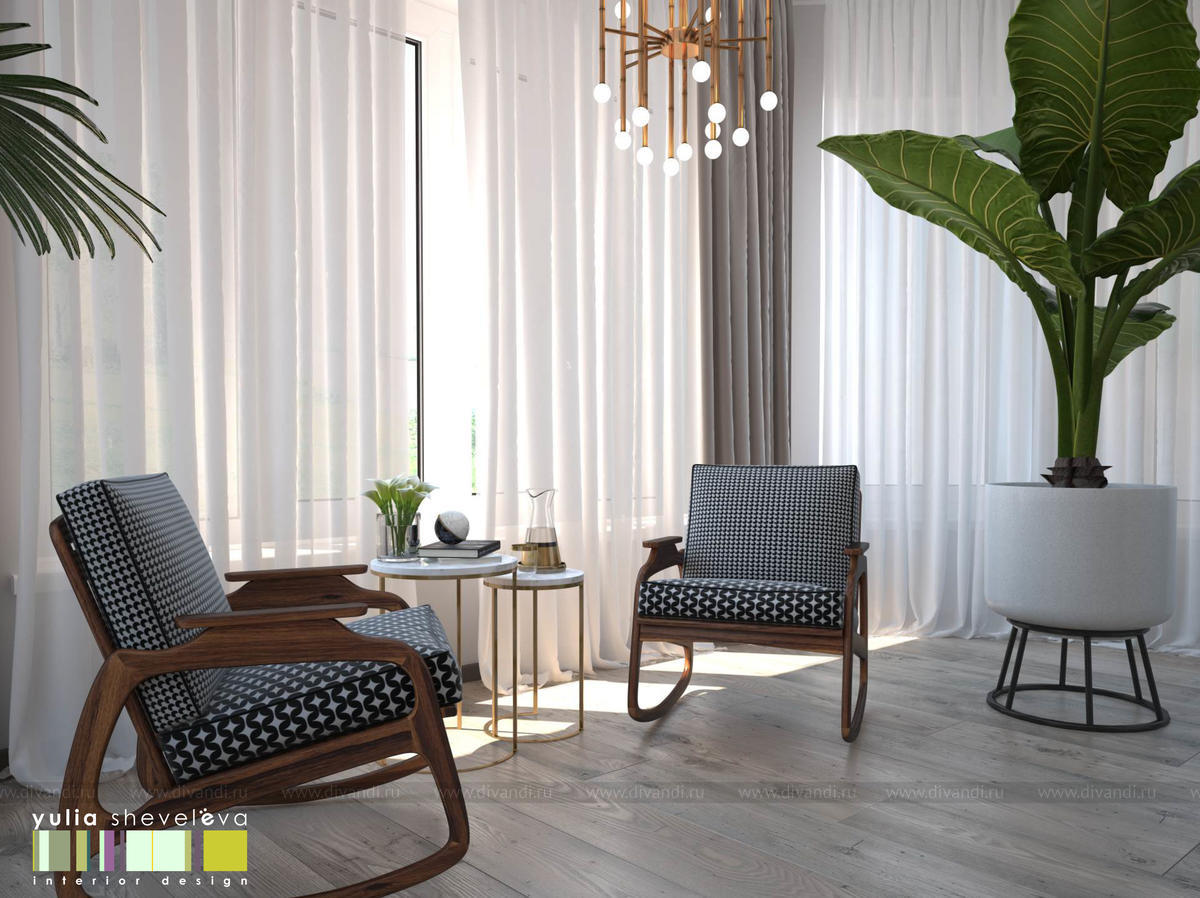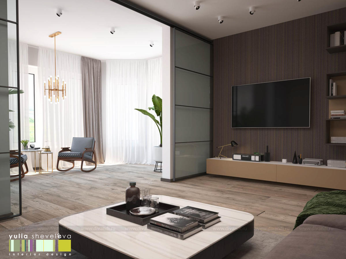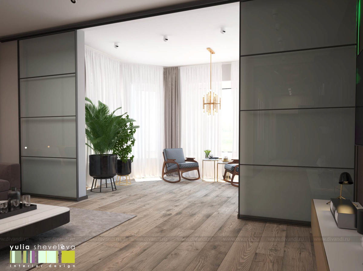 На первом этаже – холл, гостиная, кухня-столовая, гостевой санузел и комната для гостей. За раздвижными дверцами в гостиной разместилась приватная зона – уютный уголок с удобными креслами, наполненный солнечным светом.
