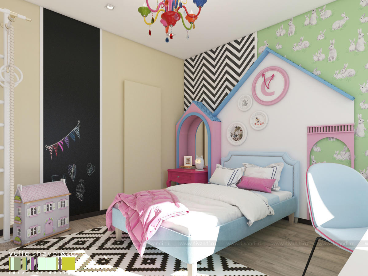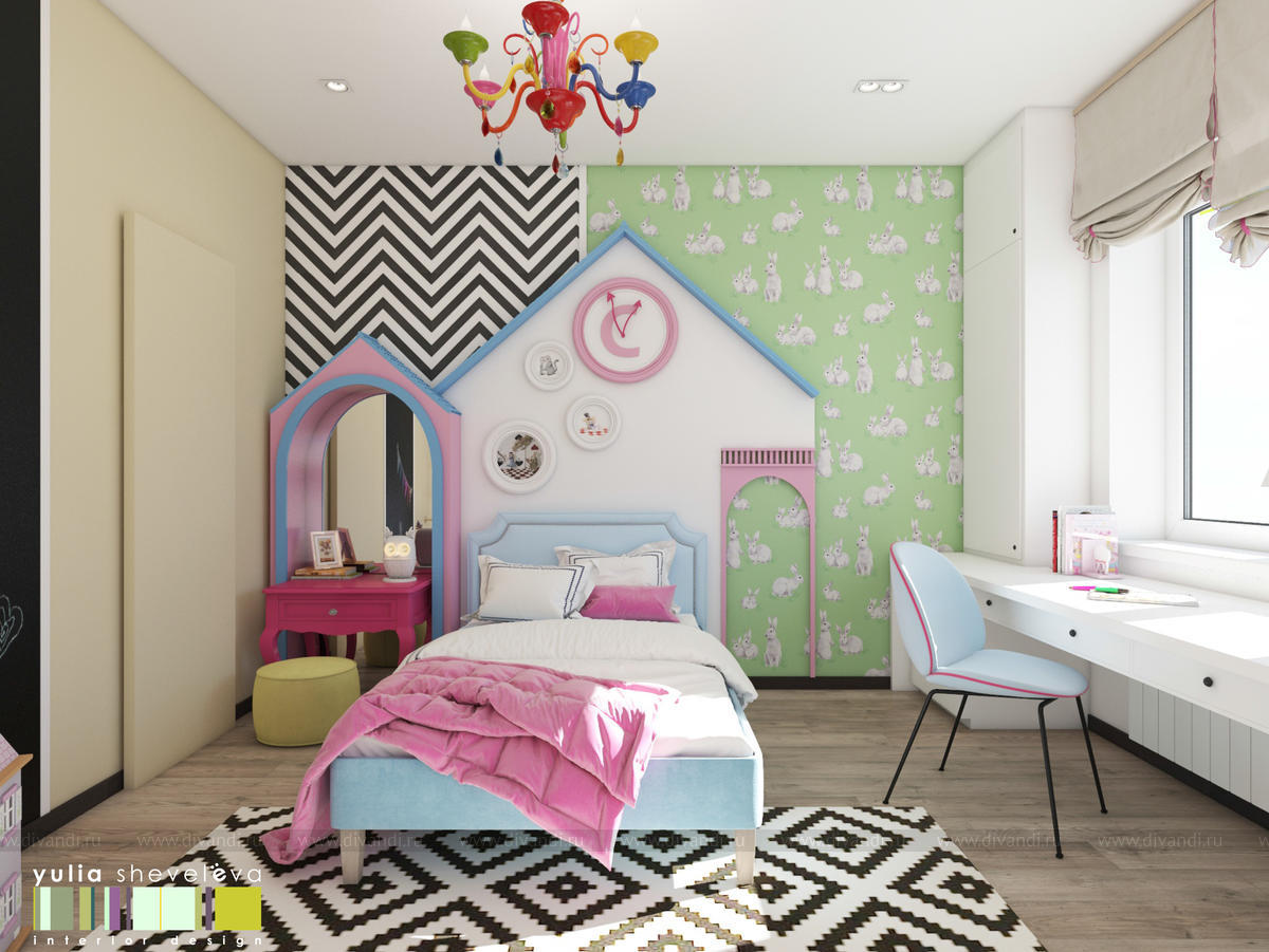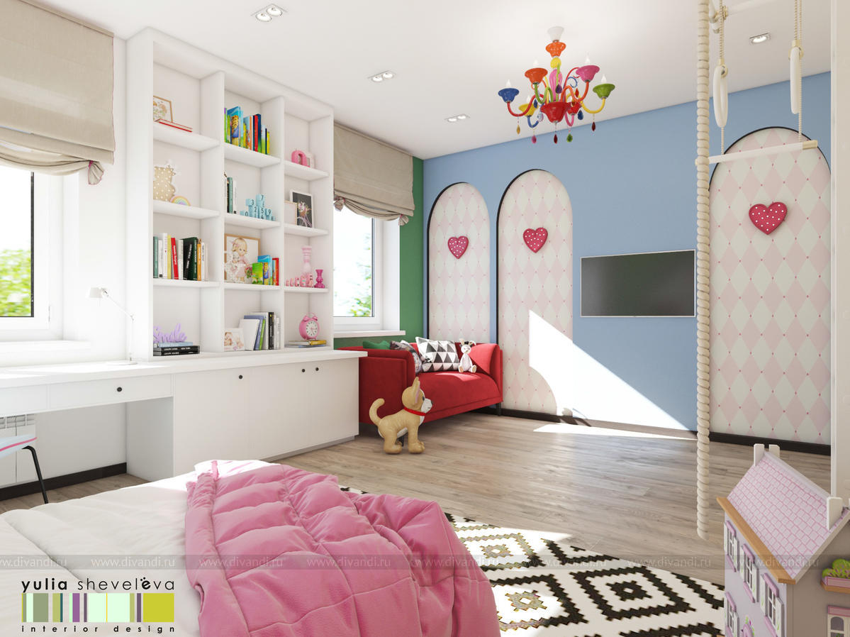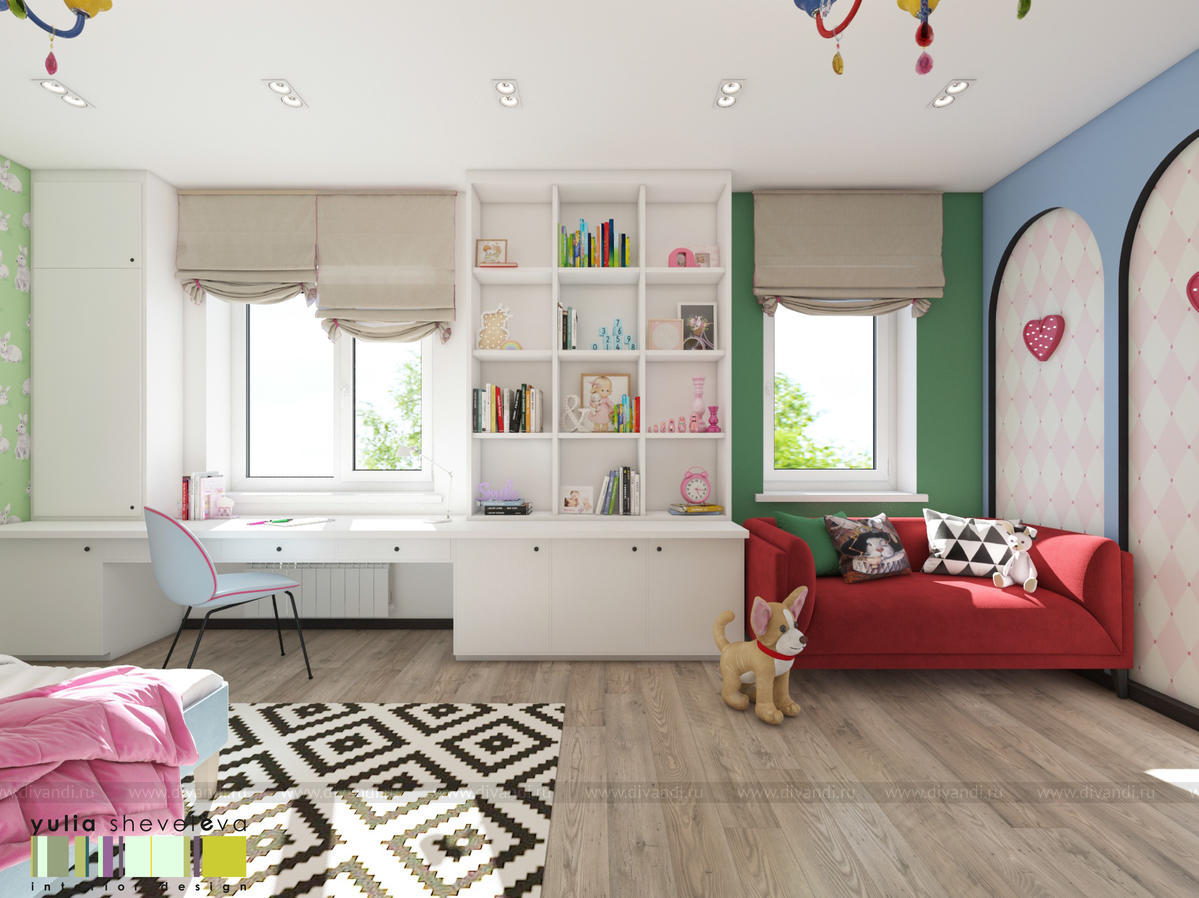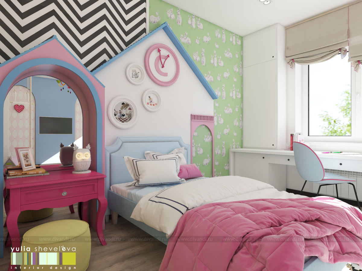На втором этаже – главная спальня, комната старшей дочери, детская младшей дочери, санузел и ванная комната. При каждой комнате спроектирована отдельная гардеробная. Детская комната отличается по стилю от остального интерьера дома. Тема для детской – «Алиса в зазеркалье». Создан сказочный интерьер для юной принцессы.