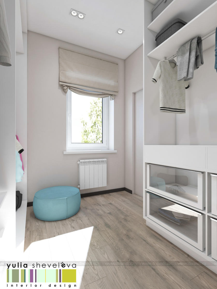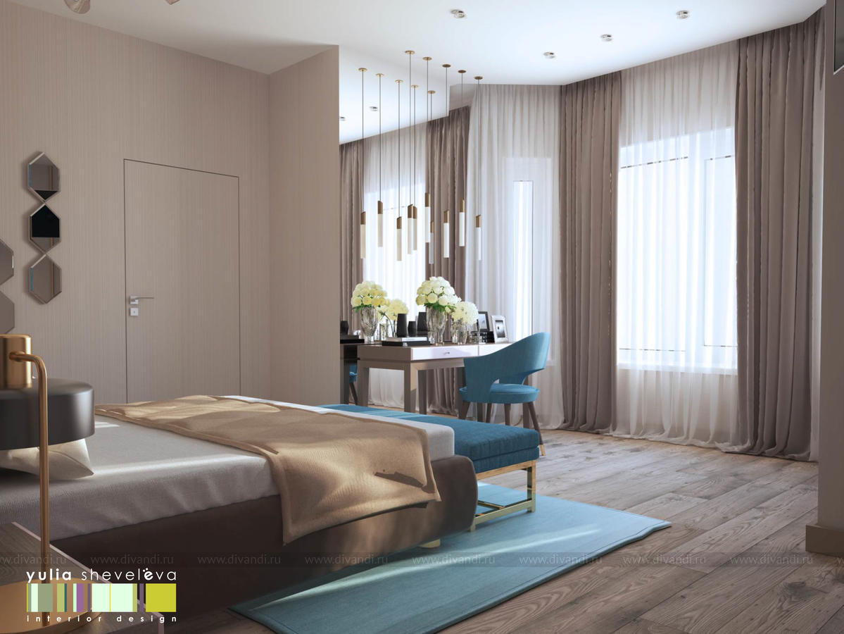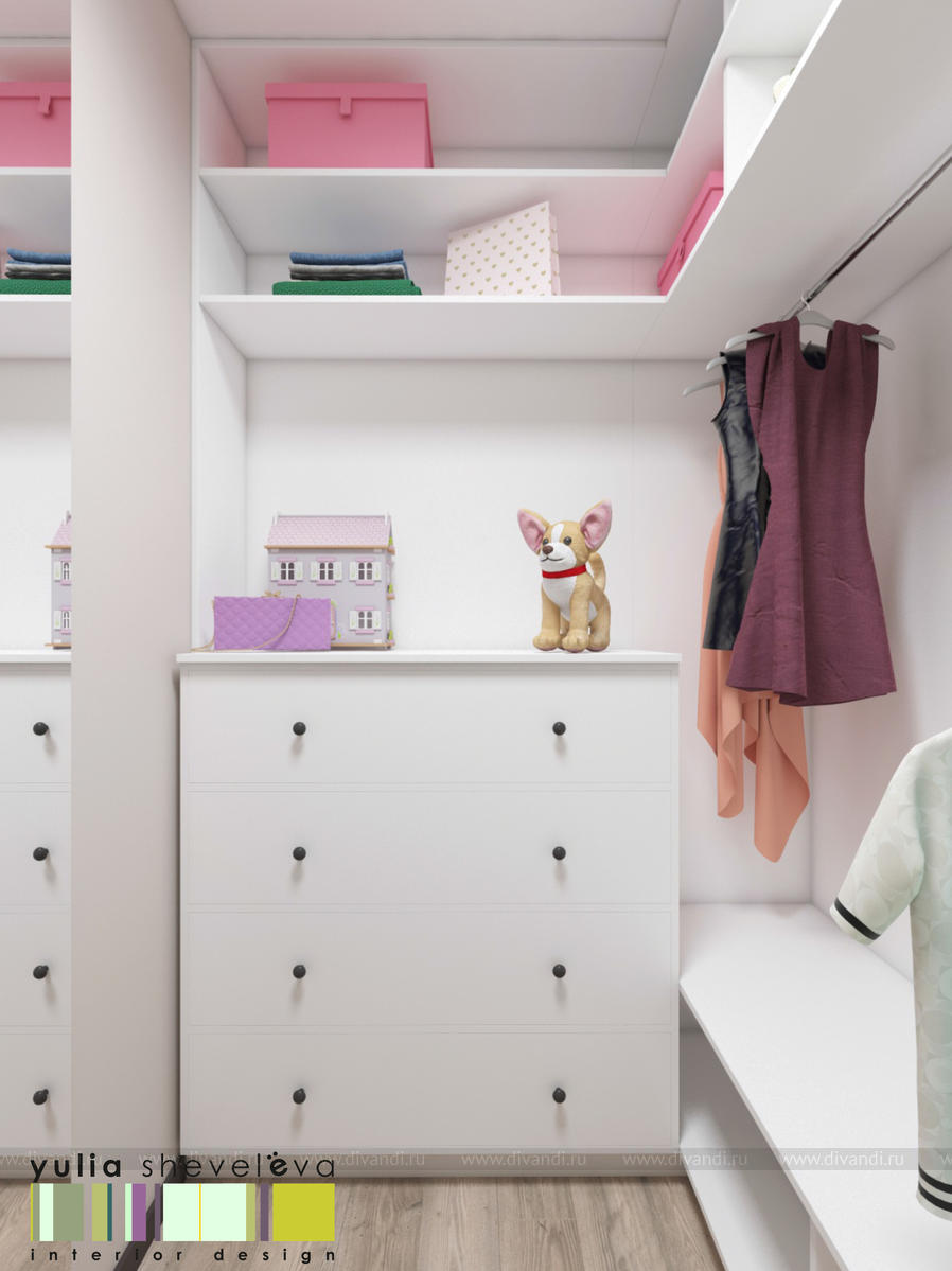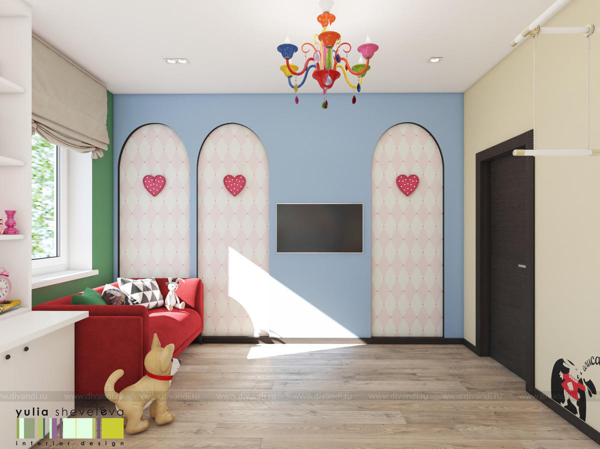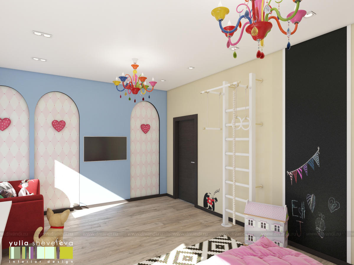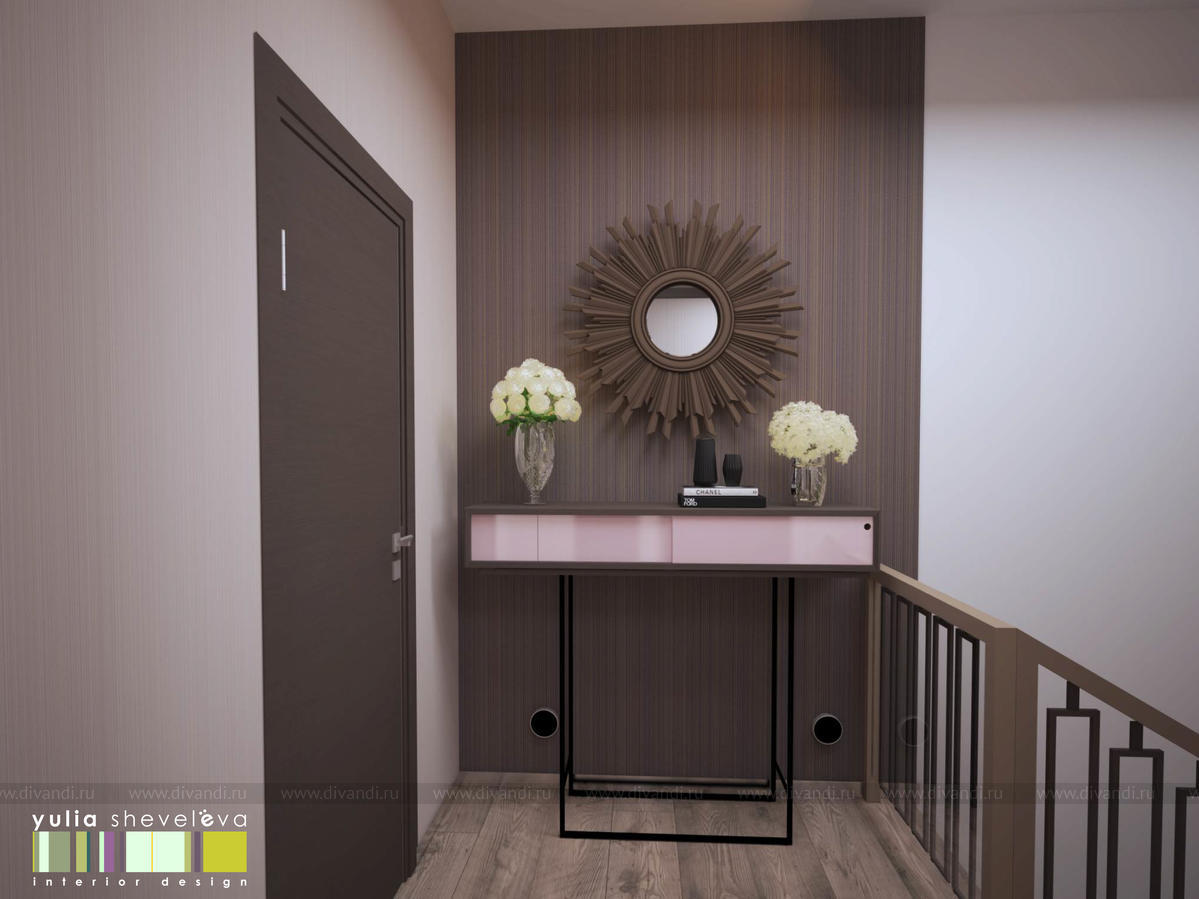 На втором этаже – главная спальня, комната старшей дочери, детская младшей дочери, санузел и ванная комната. При каждой комнате спроектирована отдельная гардеробная. Детская комната отличается по стилю от остального интерьера дома. Тема для детской – «Алиса в зазеркалье». Создан сказочный интерьер для юной принцессы.