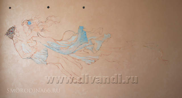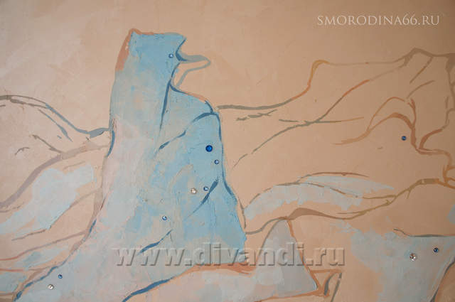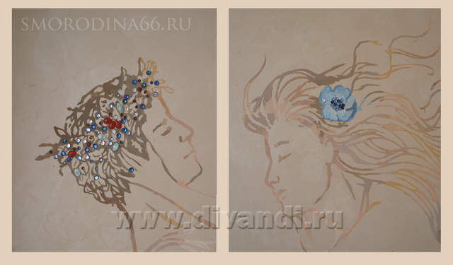 Трафаретная группа выполнена по декоративной штукатурке и нанесена ей же в гостинной. В работе применены стразы.