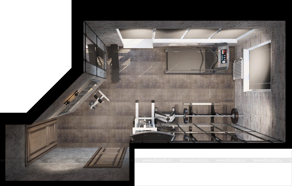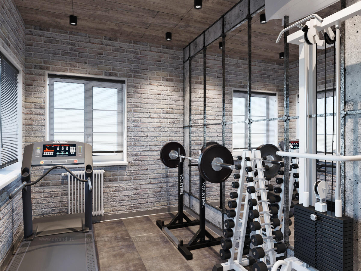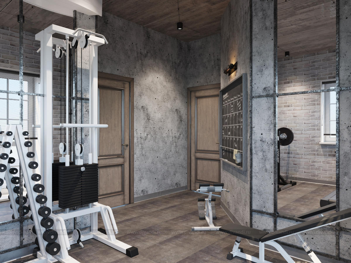 Тренажерный зал в стиле лофт в подмосковном коттедже.