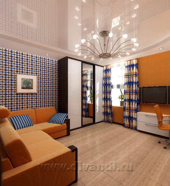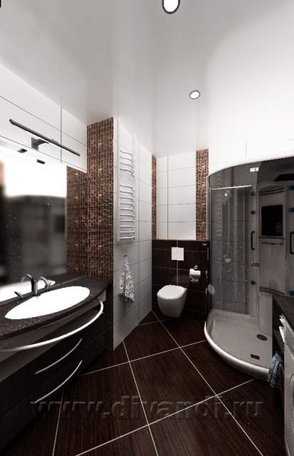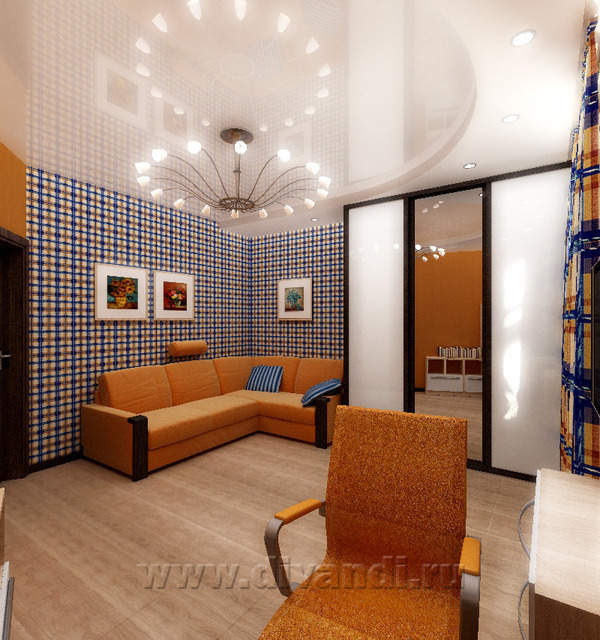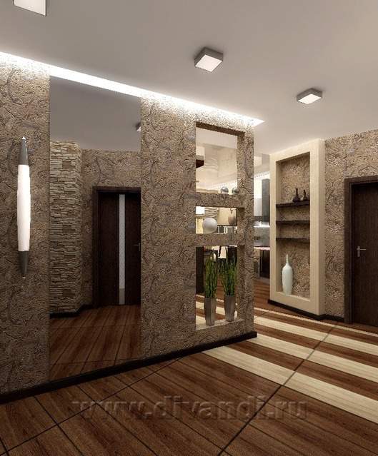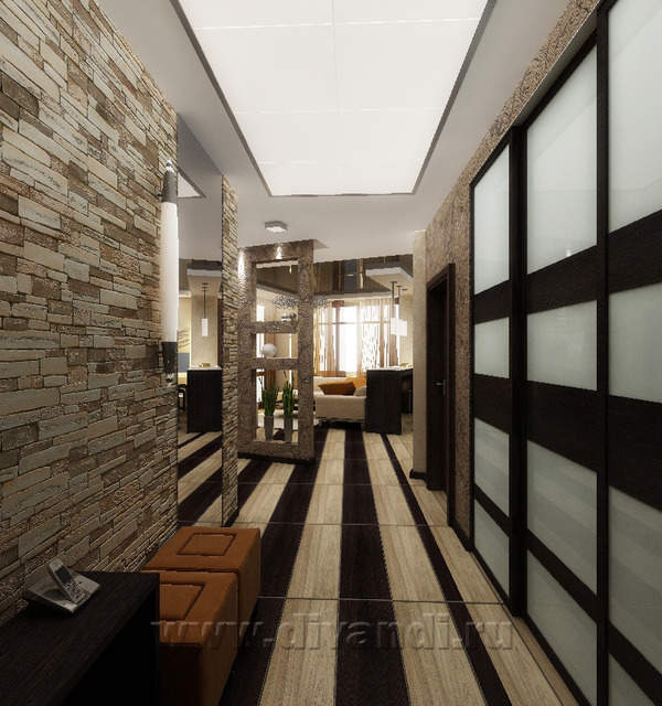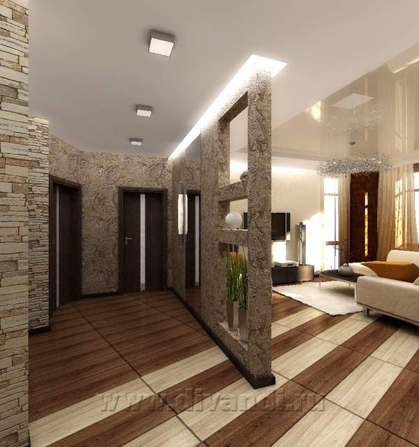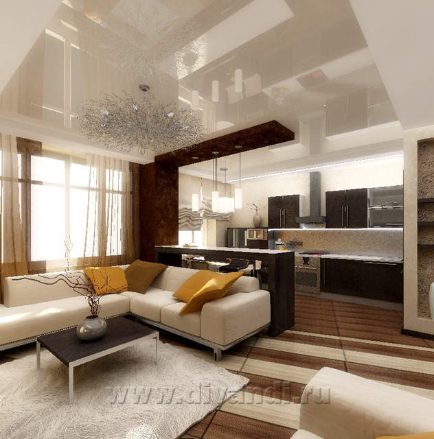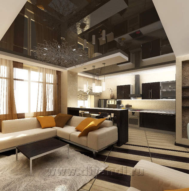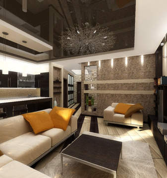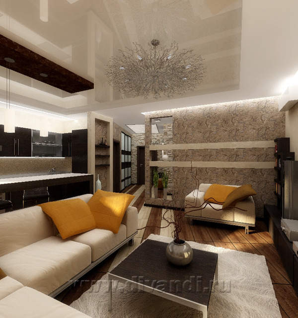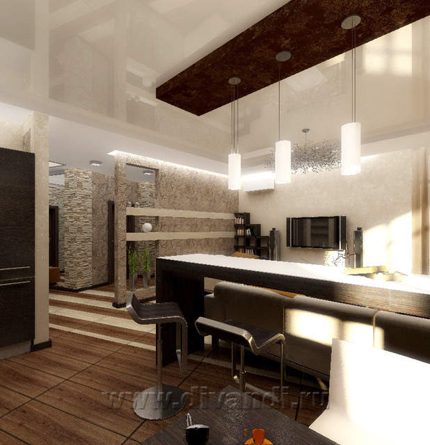 легкой перегородкой с проемами и подсветкой. Кухня отделена барной стойкой.Все эти помещения объединены общим полом из керамогранита,с фактурой дерева.Важную роль в проекте играет подсветки по периметру помещения и разделительной перегородки.