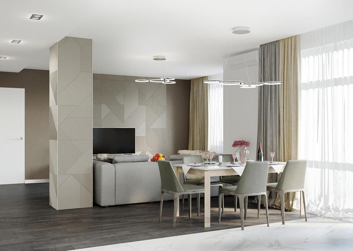 Работа над квартирой шла долго, Клиент уделял большое внимание мелочам в интерьере.Подбирались самый качественные материалы. Кухня - гостиная объединенная. На фоне лаконичного гарнитура - использован живописный керамогранит. В спальне мы учли пожелание Клиента и разместили фреску в изголовье кровати с картиной любимого художника.Спальня получилась немного вышла из стилистики минимализма, но это было сделано осознанно.