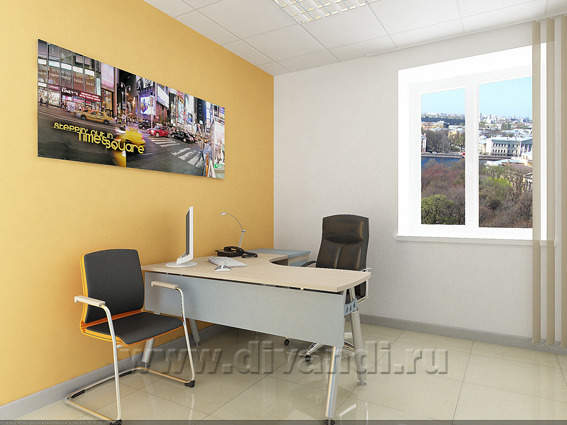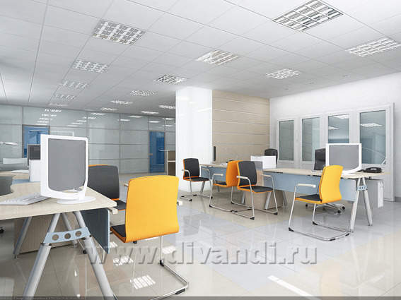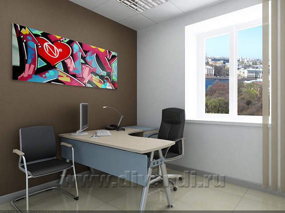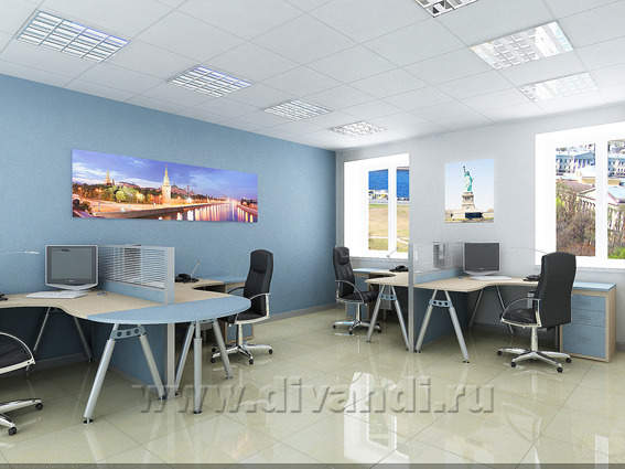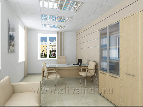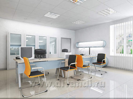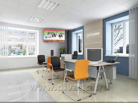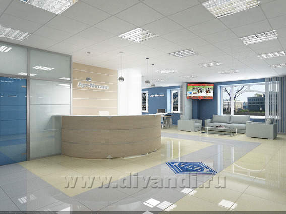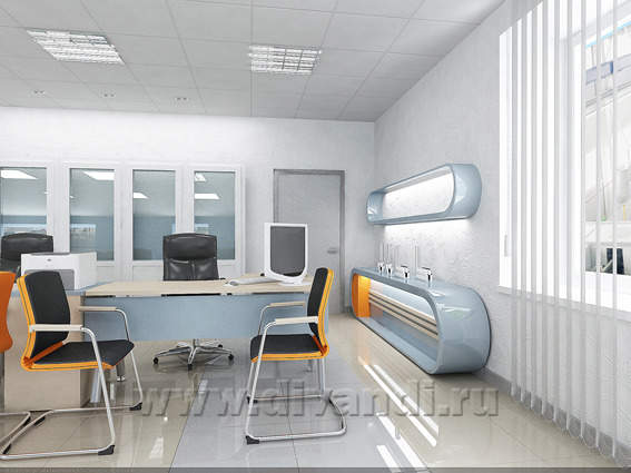 Этот офис заказчик попросил сделать универсальным. Здесь можно провести переговоры, презентацию, принять частного клиента для консультации и даже устроить VIP-прием». Минималистский стиль, материалы на контрасте цветов (синяя декоративная штукатурка и бежевый мрамор), чистые архитектурные линии... Все плоскости в этом офисе глянцевые: отражающие поверхности расширяют пространство.