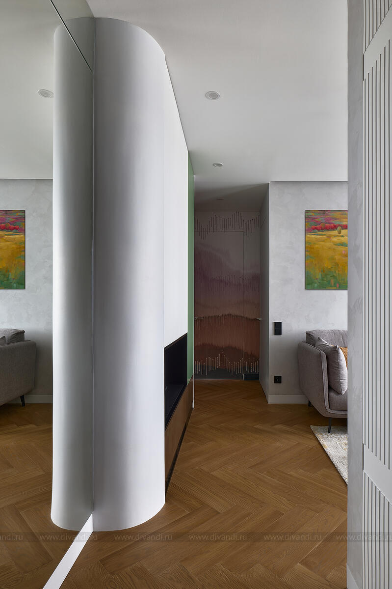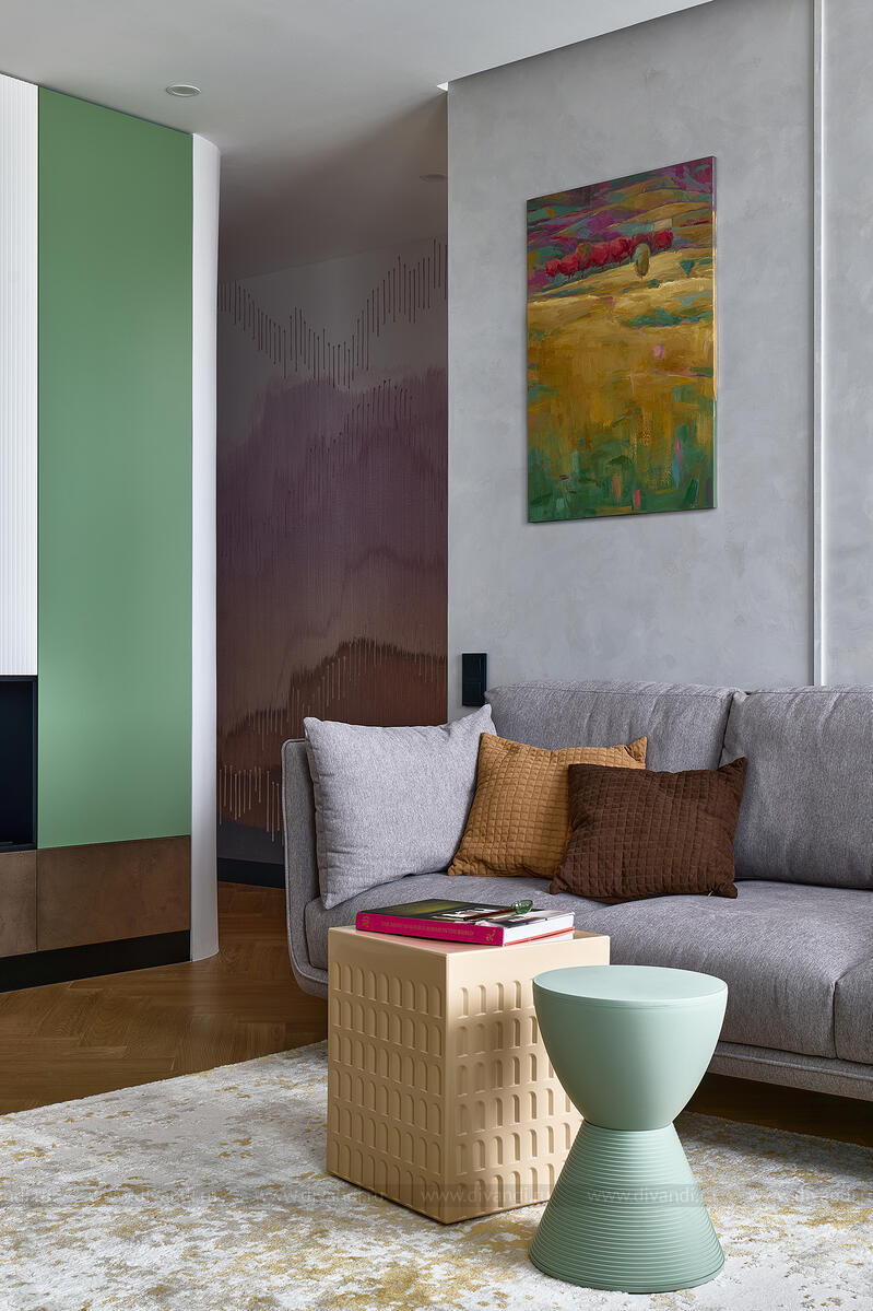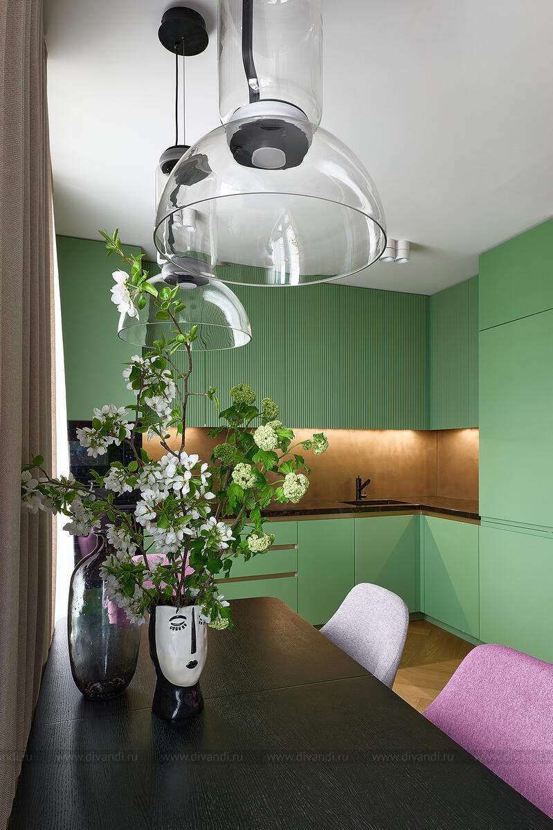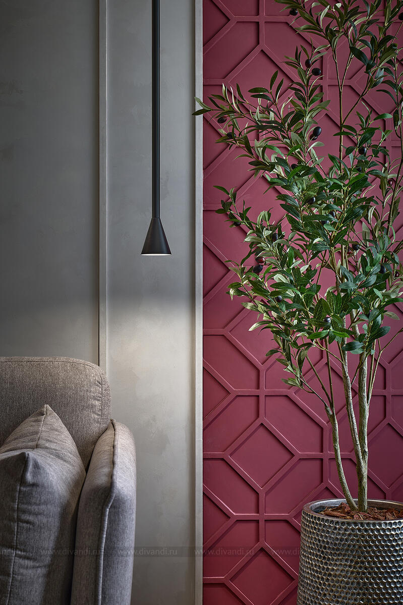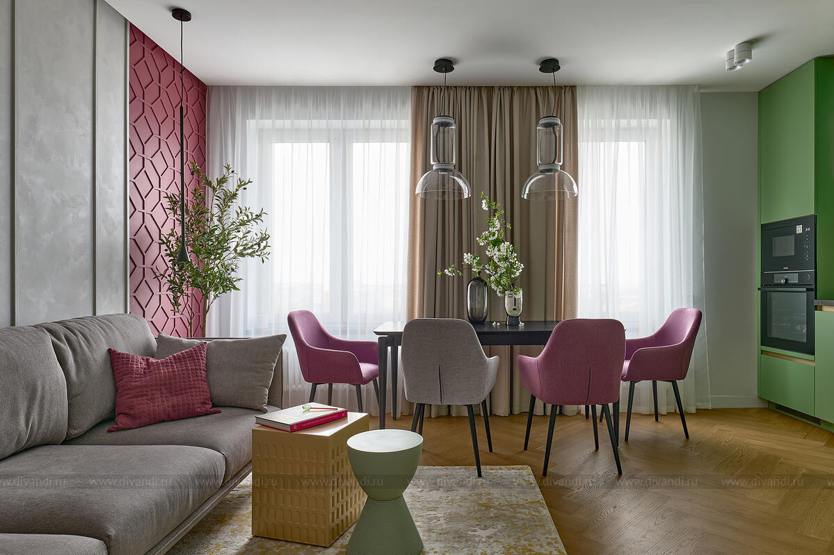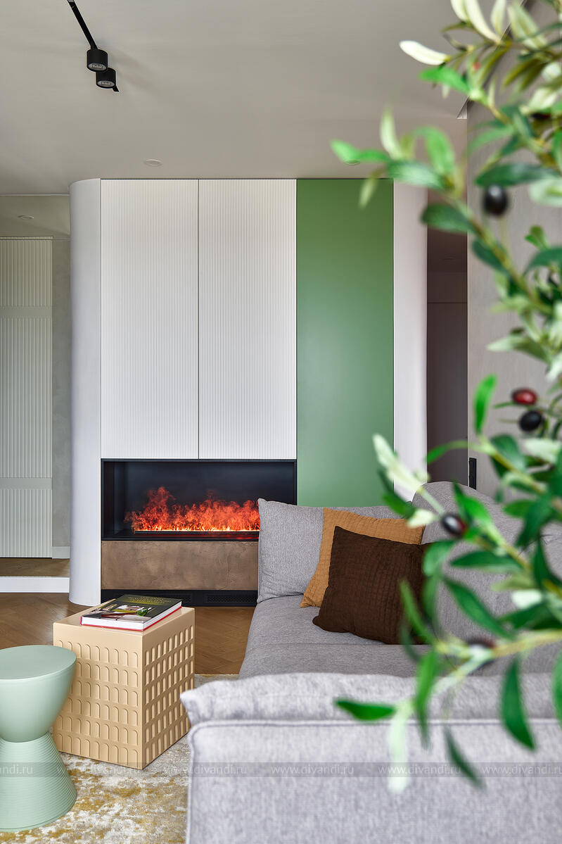 Гостиная и кухня выдержаны в сдержанном серо-зелёном фоне с сочными вкраплениями ягодного и оливкового. Мягкий диван, геометрические кофейные столики, бархатные кресла и стеклянные подвесы — всё работает на ощущение комфорта и свежести. Встроенный камин и ритмичные вертикальные панели в отделке задают тон всей зоне отдыха.