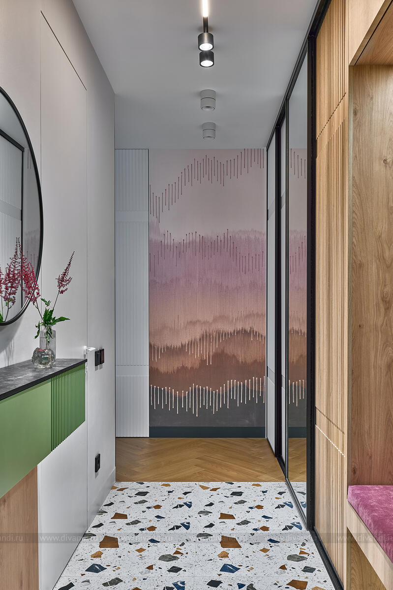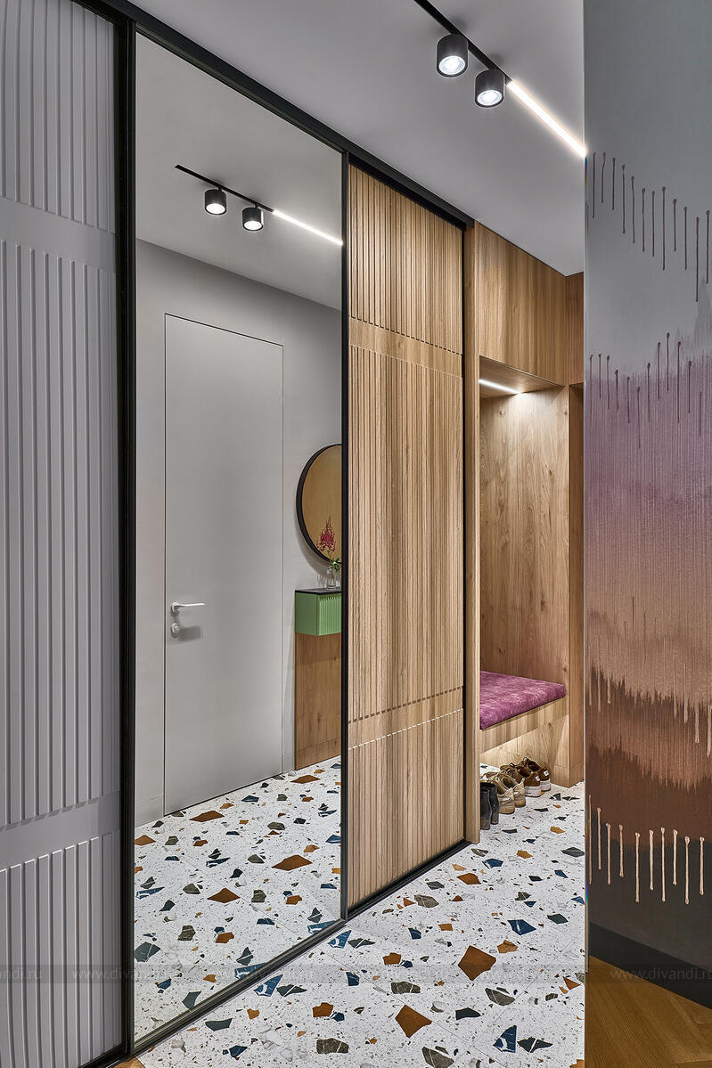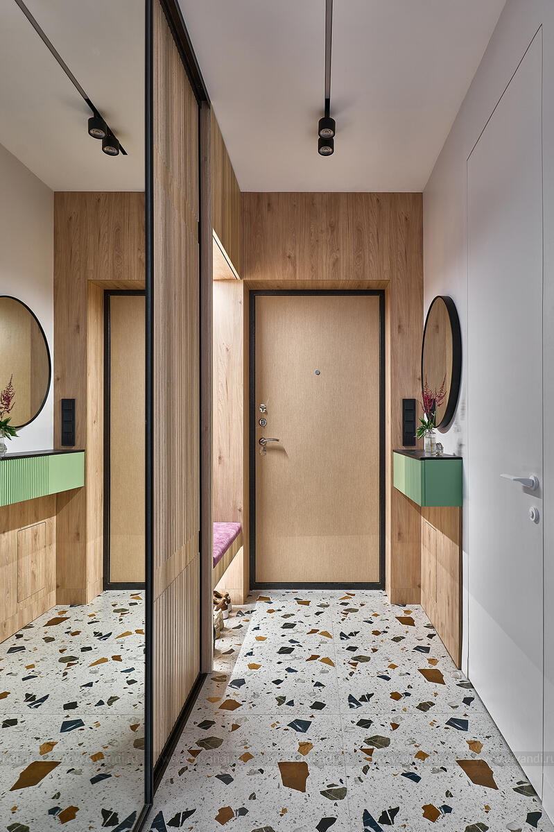 Прихожая радует неожиданным решением: на фоне спокойной древесной текстуры — глянцево-зелёные подвесные консоли и акцентная терраццо-плитка с вкраплениями, напоминающими рассыпанные самоцветы. Продуманное хранение и зеркальные поверхности визуально расширяют пространство.