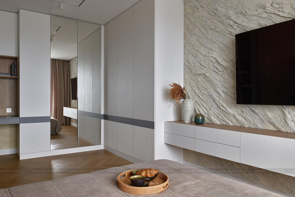 Спальня выполнена в природной, каменной палитре. Фактурная стена за ТВ-зоной напоминает срез минерала, а встроенный шкаф со стеклянными и глухими фасадами делает помещение строгим, но тёплым. Здесь уместен текстиль в нейтральной гамме и приглушённый декор — интерьер не утомляет, а успокаивает.
