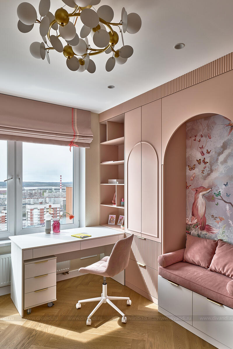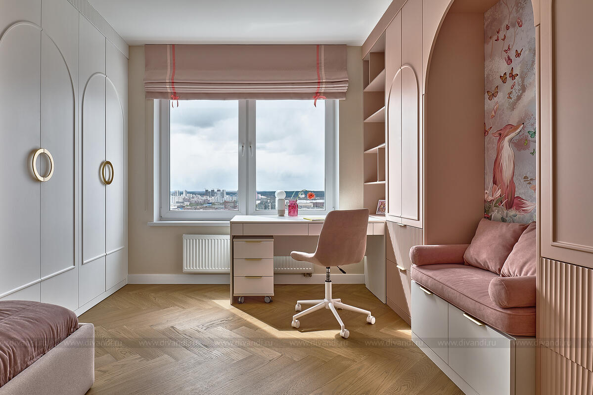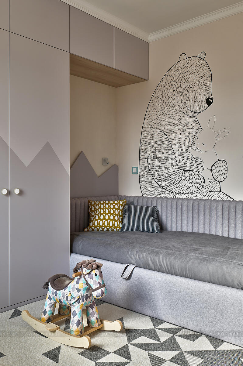 Детские комнаты — настоящая галерея дизайнерской заботы. Комната мальчика решена в серо-лавандовой гамме с характерной мебелью «горного» профиля и трогательной графикой с медведем и кроликом. Вторая детская, для девочки, словно соткана из рассветного воздуха: нежно-пудровая палитра, арочные фасады, золотая фурнитура и роспись с лисой в цветущем лесу. Всё выполнено с любовью к деталям и потребностям ребёнка.