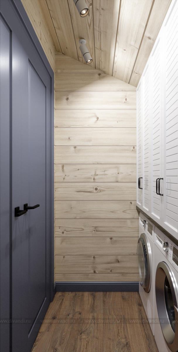 Заказчики взяли за основу типовой проект дома из бруса, поэтому мы работали с существующими стенами, где перед нами стояла задача удобно и функционально расставить мебель. На первом этаже были расположены прихожая, лестничный холл, кухня-гостиная, гостевая спальня и ванная комната. На втором этаже – лестничных холл, спальня хозяев, два кабинета, постирочная и ванная комната.