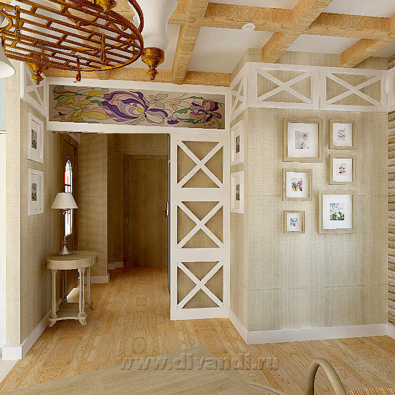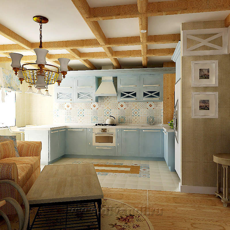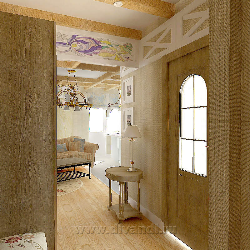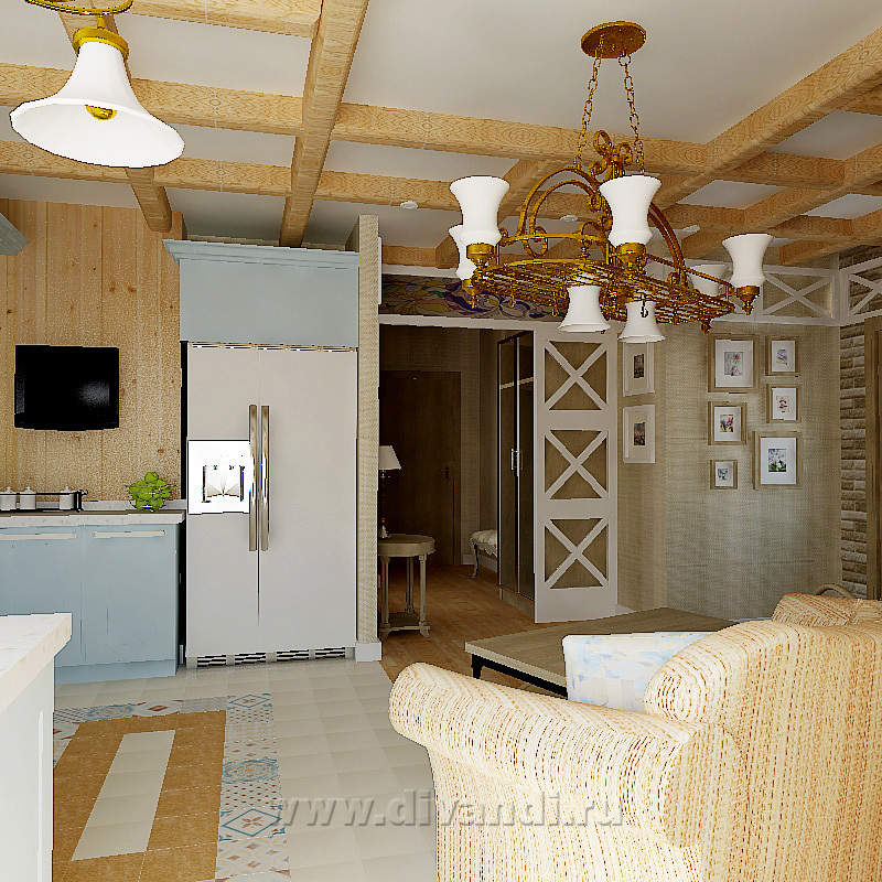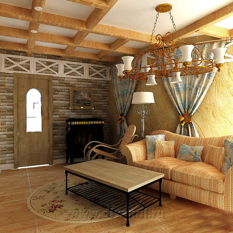 Основным элементом квартиры, от которого отталкивался дизайнер по созданию остального пространства, стала кухня. Первый вариант цвета был голубым, в последствии, заказчик остановился на более нейтральном и стандартном типе кухни - сочетании бежевого с шоколадным оттенком. Гостиная соединена с коридором. Разъединяет пространство гипсокартонная перегородка с декором в стиле кантри, спроектированная по идее дизайнера. Вверху конструкции также индивидуально для заказчика разрабатывается витраж в том же стиле. Также подчеркивает стиль кантри облицовка стены кухни деревянными рейками, что придает уюта и теплоты в комнату. Главная зона отдыха в помещении - каминная.Она была предусмотрена конкретно для сильного главы семейства, также стало акцентом в квартире и добавило изюминки в пространство гостиной.