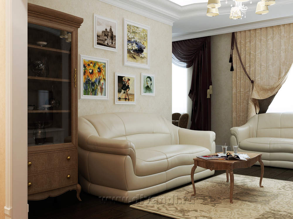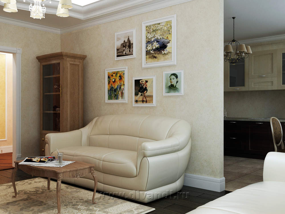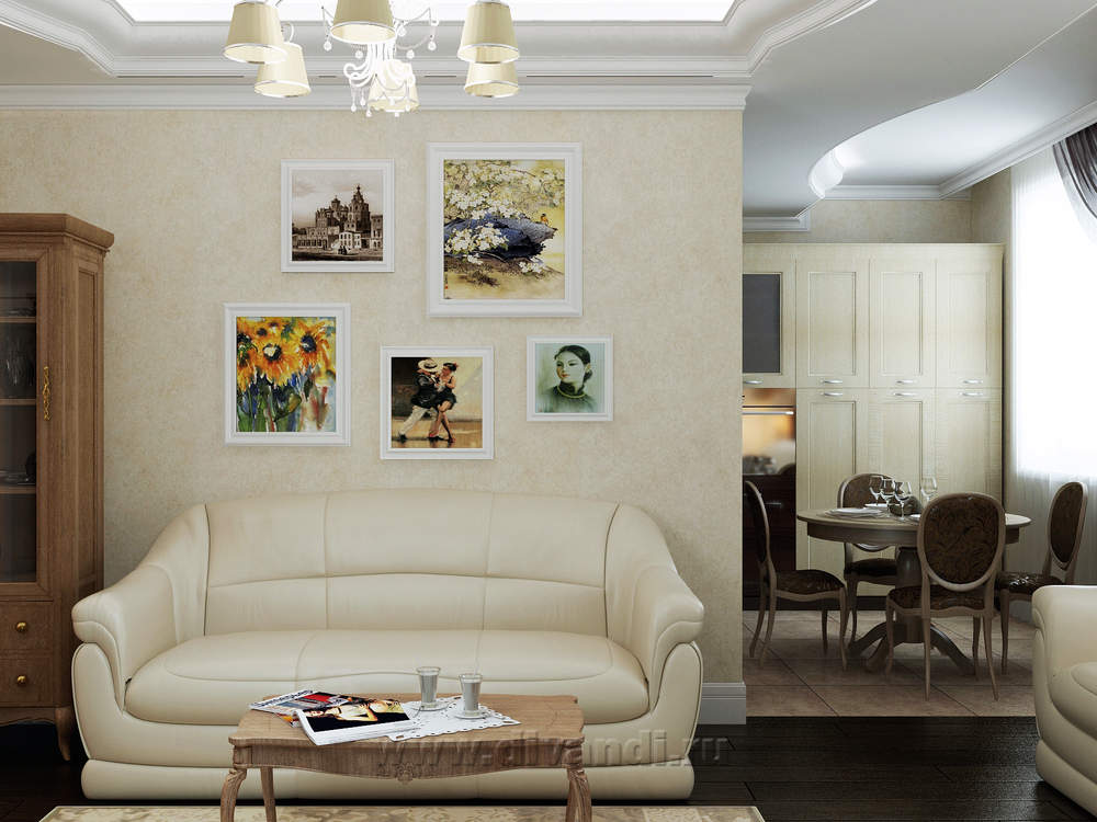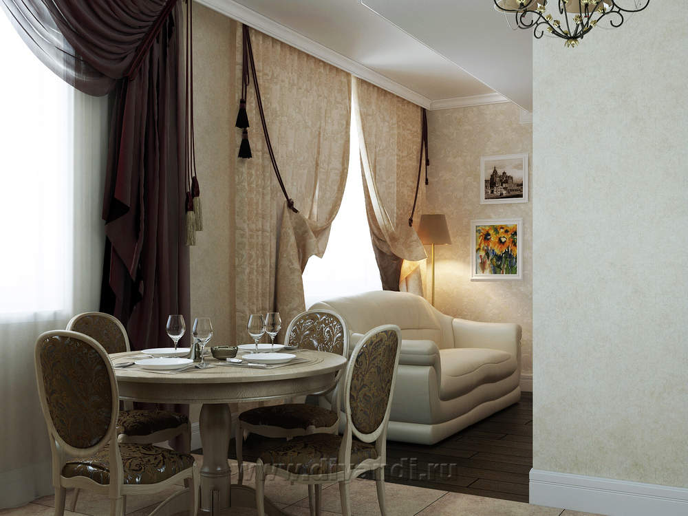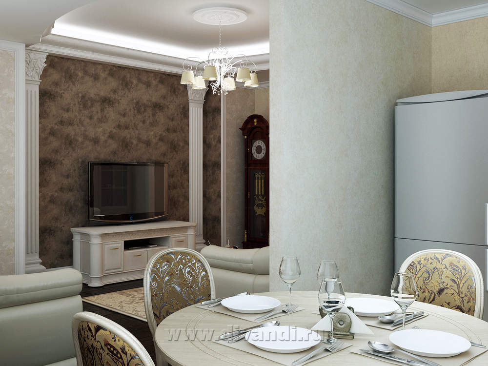 Требовалось совместить гостиную с кухней, сохраняя выбранную мебель заказчика и некоторые элементы. Получилась нежная, воздушная классика с нотками прованса.