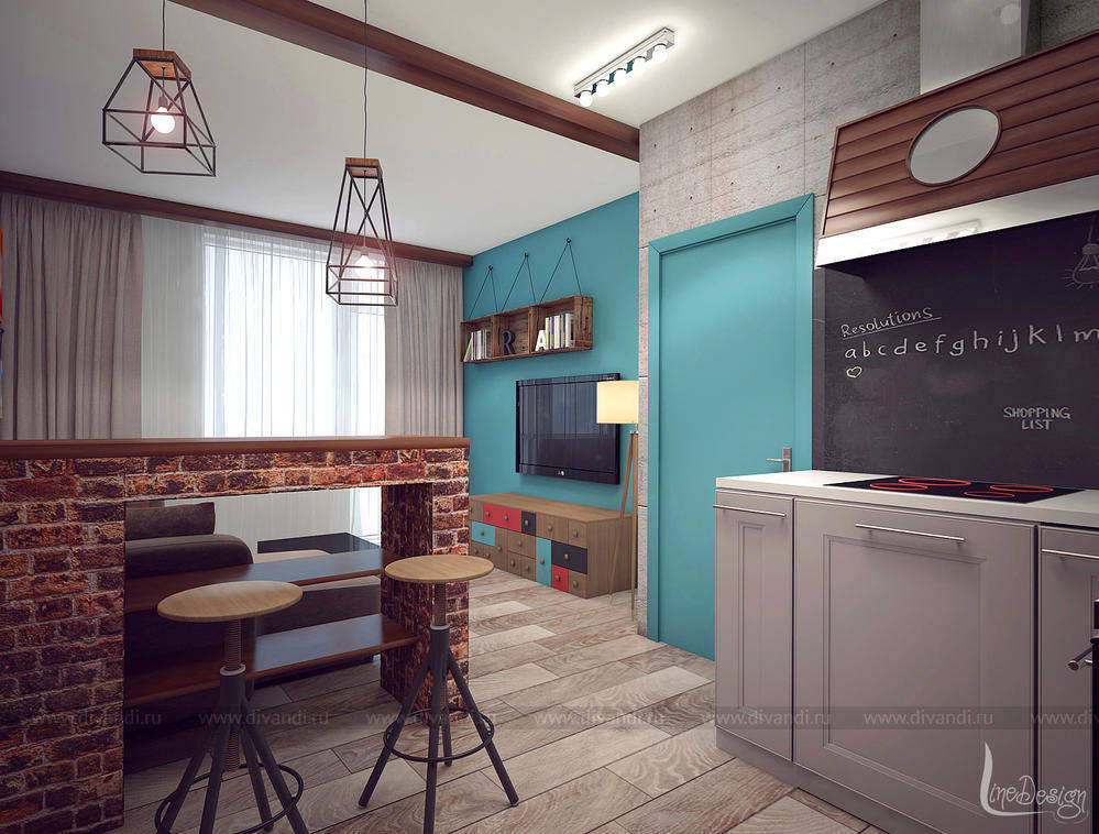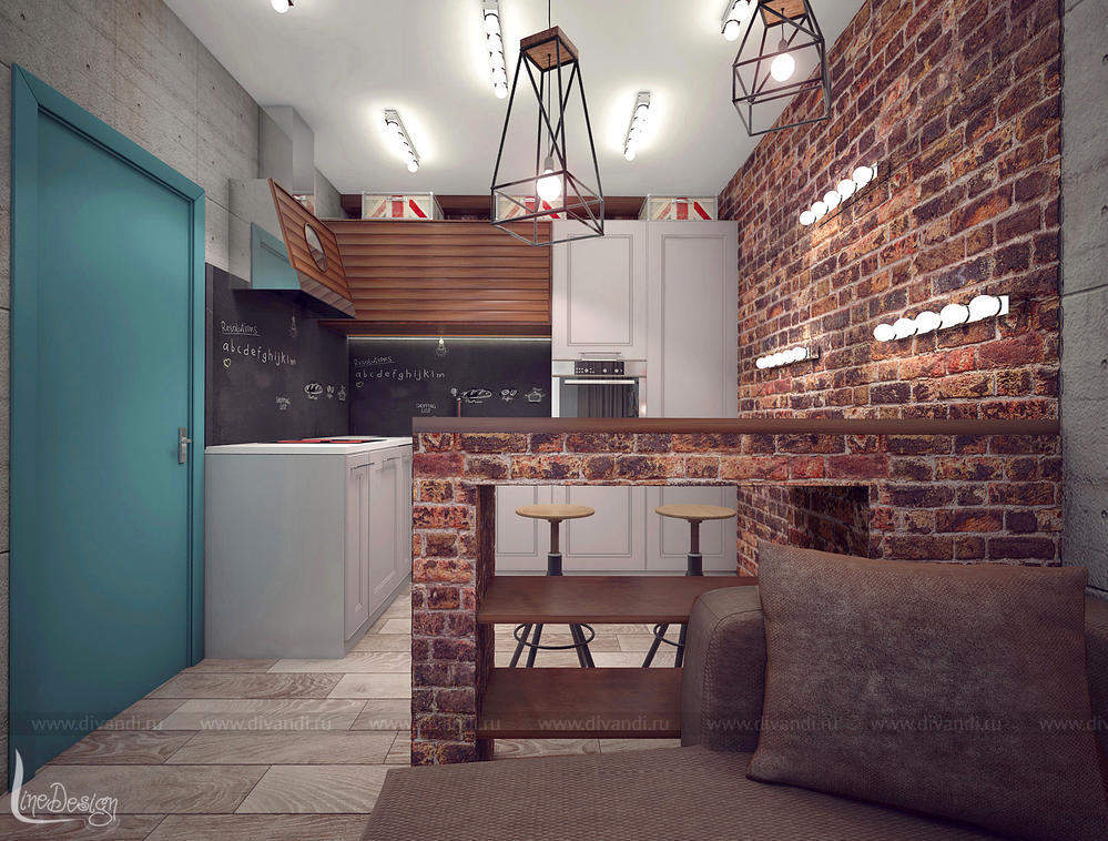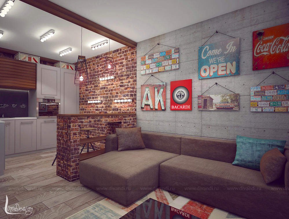 Этот мини-лофт получился уютным и наполненным атмосферными деталями. Свободная планировка кухни-гостиной, брутальная отделка стен, сочетание холодных металлических цветов и теплого цвета дерева, применение тематической графики и оригинальных декоративных приемов -все это позволило создать неповторимый шарм и творческую атмосферу в интерьере.
