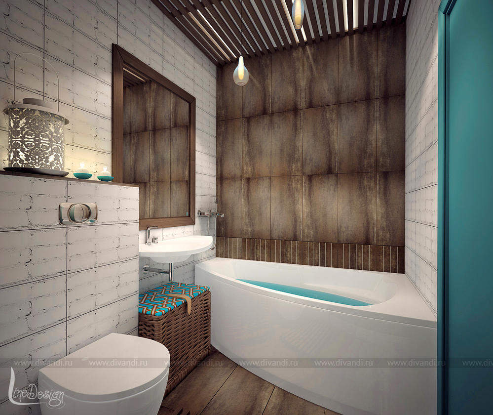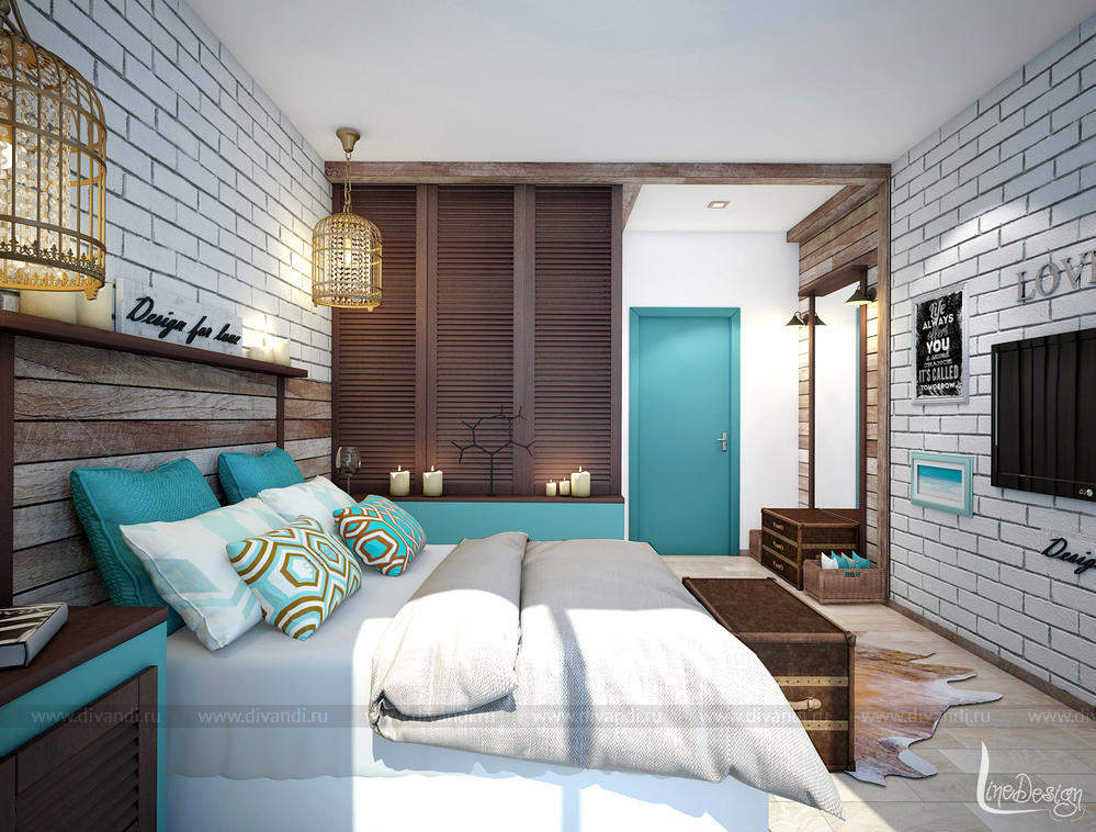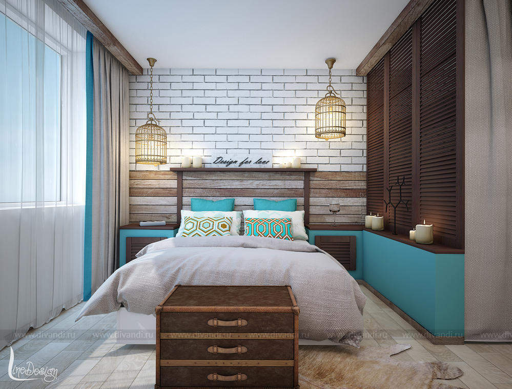 В спальне была выделена гардеробная комната, мы не стали делать стандартные шкафы — использовали реечные дверки для зонирования. Атмосфера средиземноморья создается благодаря привнесению бирюзовых оттенков и натуральной текстуры дерева. Атмосфера в этой спальне — это море и солнце в любое время.
