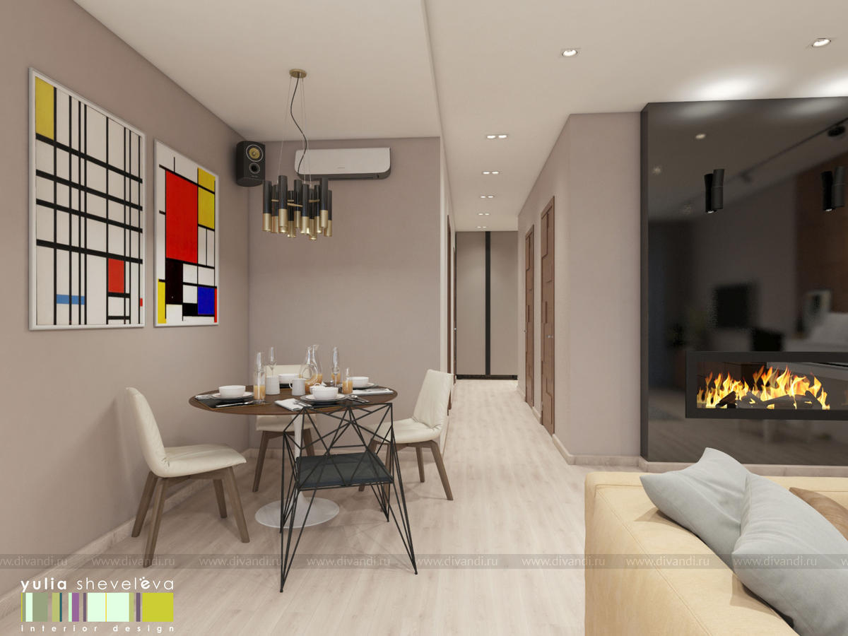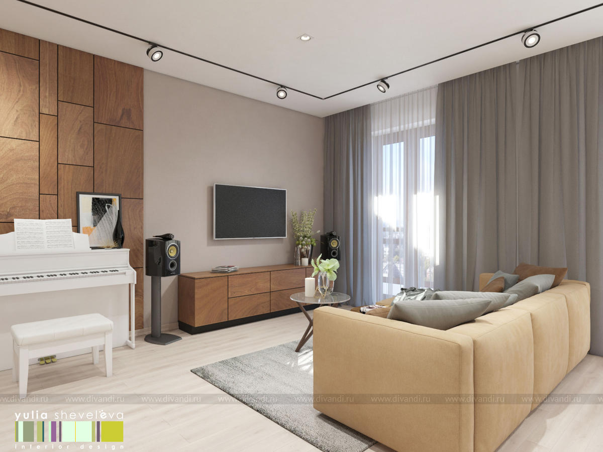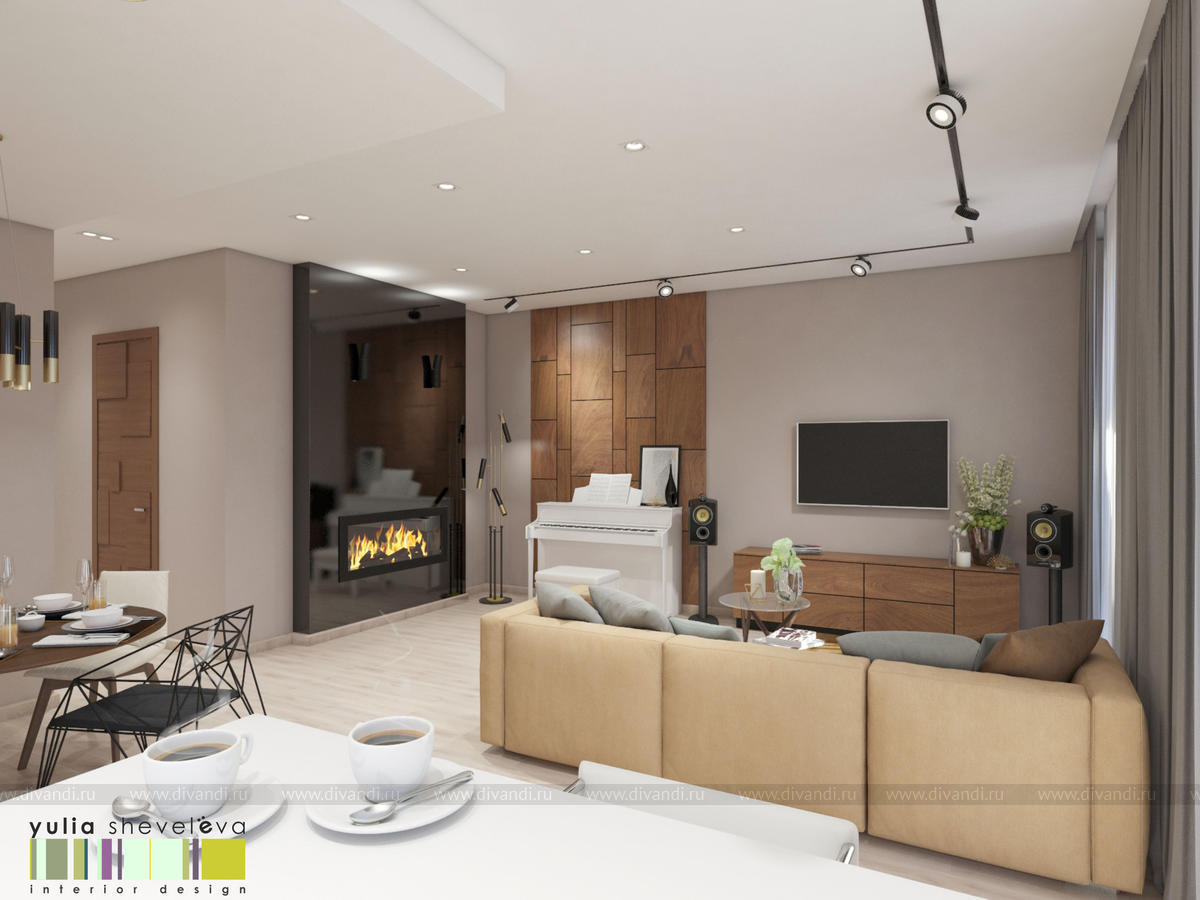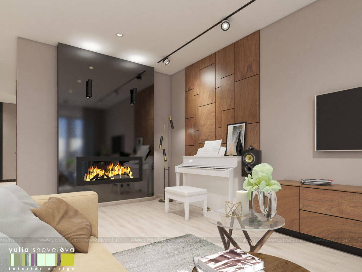 Квартира г. Екатеринбург, общая площадь 100 м кв. Апартаменты расположены в самом центре города, с великолепной террасой. В квартире уже был сделан дизайн-проект, но прошло много времени и новые хозяева решили его изменить. Из того, что решили оставить в новом интерьере - камин в гостиной и кухонный гарнитур. Все остальное подверглось тотальной переделке. Кардинально планировку не стали менять, лишь увеличили гардеробную комнату за счет большого гостевого санузла. Высота помещения также позволила увеличить дверные проемы. Интерьер выполнен в теплой светлой гамме, в отделке использовано много дерева. Для текстиля также отдано предпочтение природным оттенкам. Хозяйка квартира играет на фортепьяно, поэтому инструмент занял почетное место в гостиной. От предыдущих хозяев остался камин в облицовке из черного стекла, его мы решили полностью сохранить.
