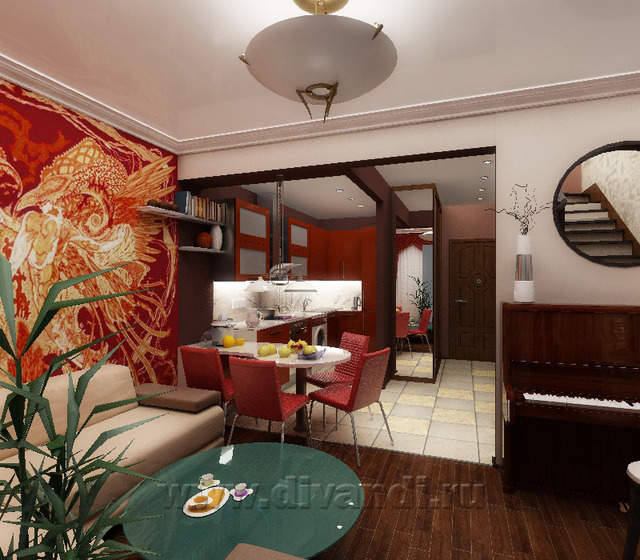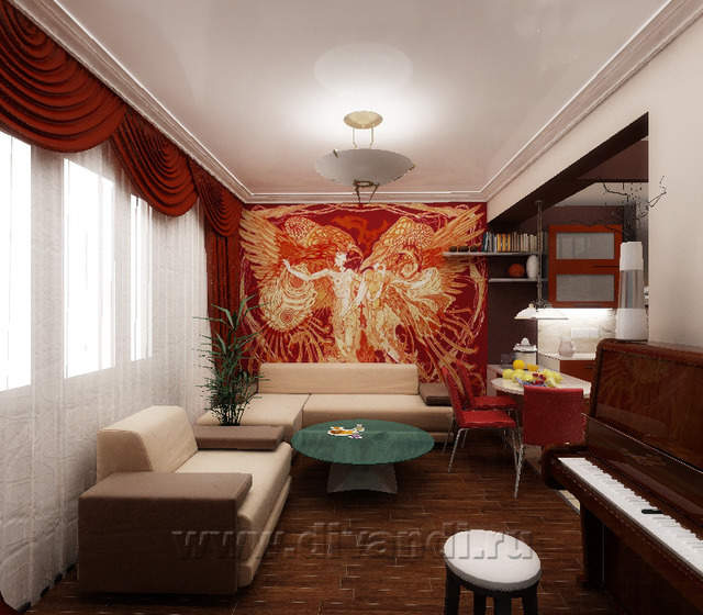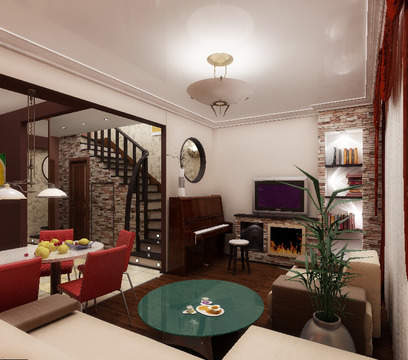 Стилистика старого дома имела место, поэтому в достаточно современном интерьере появились элементы классики- карнизы, розетки- отсюда- эклектика.
