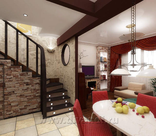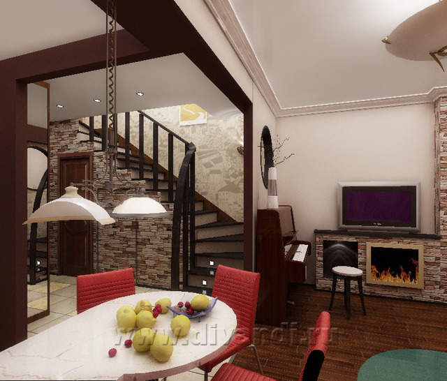 Проектом было решено снести все перегородки и по-иному распланировать пространство. Лестница в прихожей была развернута, и под ней появилась возможность обустройства туалета(его не было изначально на 1-ом этаже вообще).Остальное пространство 1-го этажа ,поделенное потолочной балкой, было отведено гостиной с кухонной зоной, столовой и прихожей со шкафом-купе.