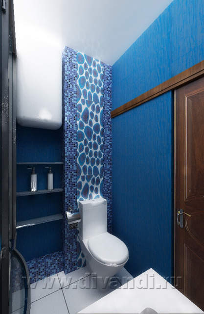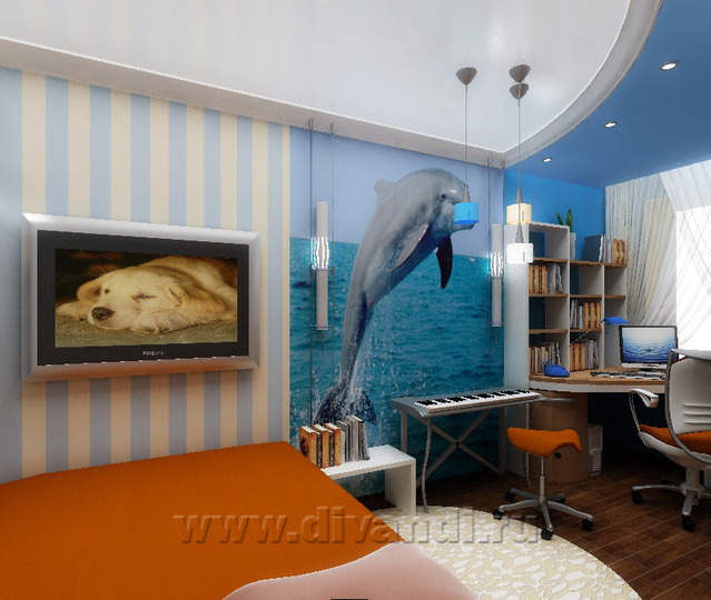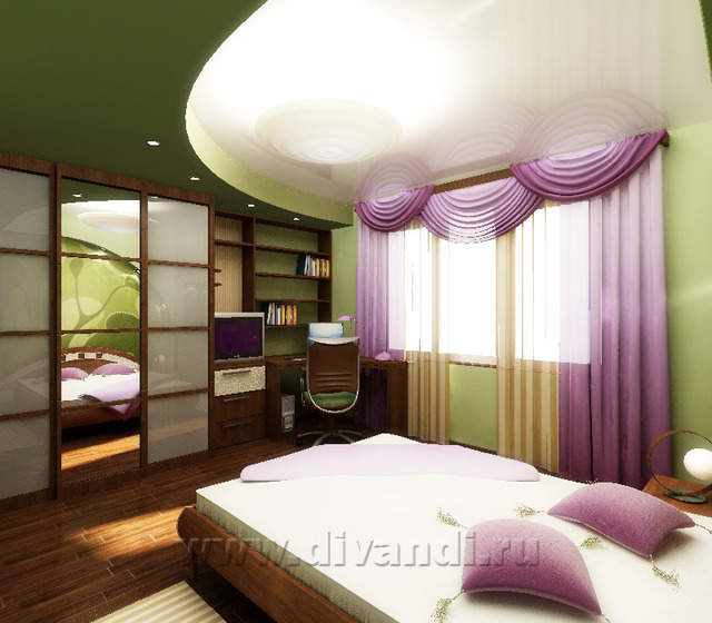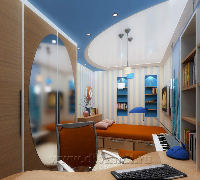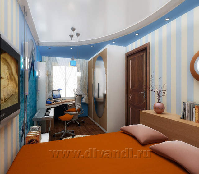 На втором уровне квартиры расположились спвльная, детская и санузел. Определенную сложность в решении представляли потолочные балки, перерезающие все пространство квартиры. Появились разноуровневые подшивные потолки в спальне и детской. Между этими помещениями обустроена перегородка с чередующими нишами и усиленной звукоизоляцией. Спальня совмещает функции кабинета и тренажерного зала. Возможность расширения санузла практически отсутствовала, было заложено окно и тем не менее в санузле расположилось все необходимое.