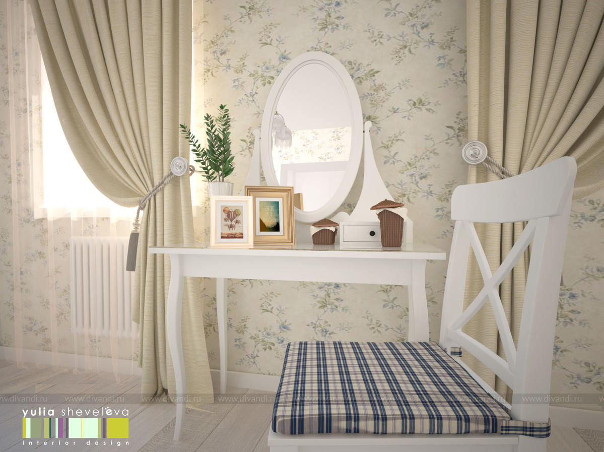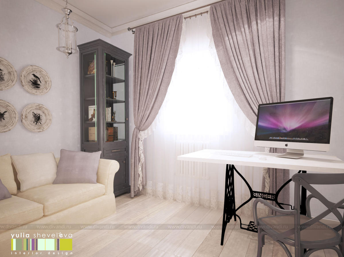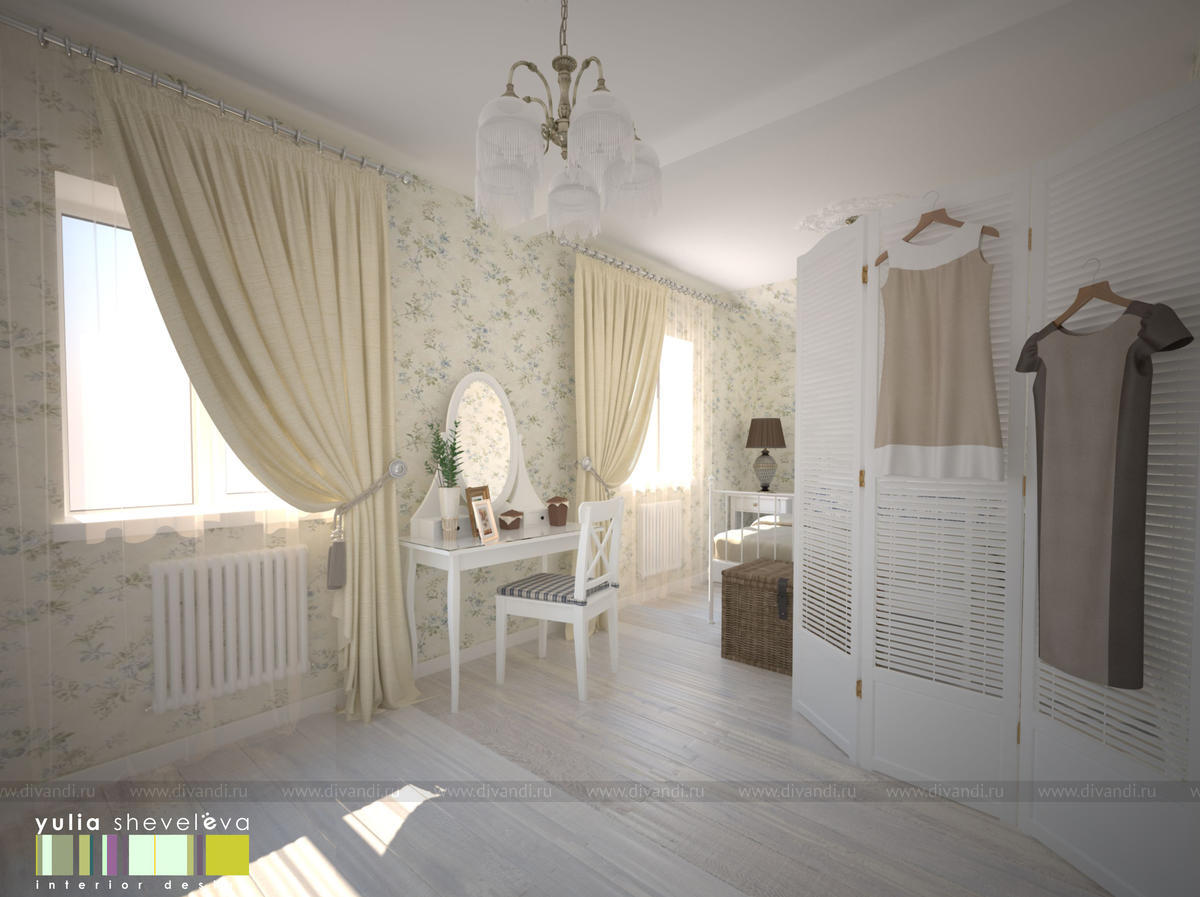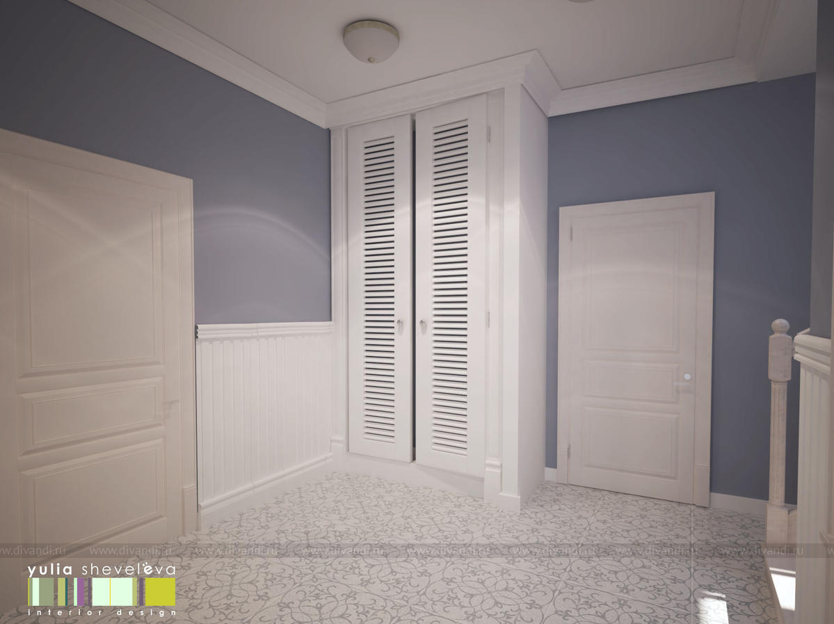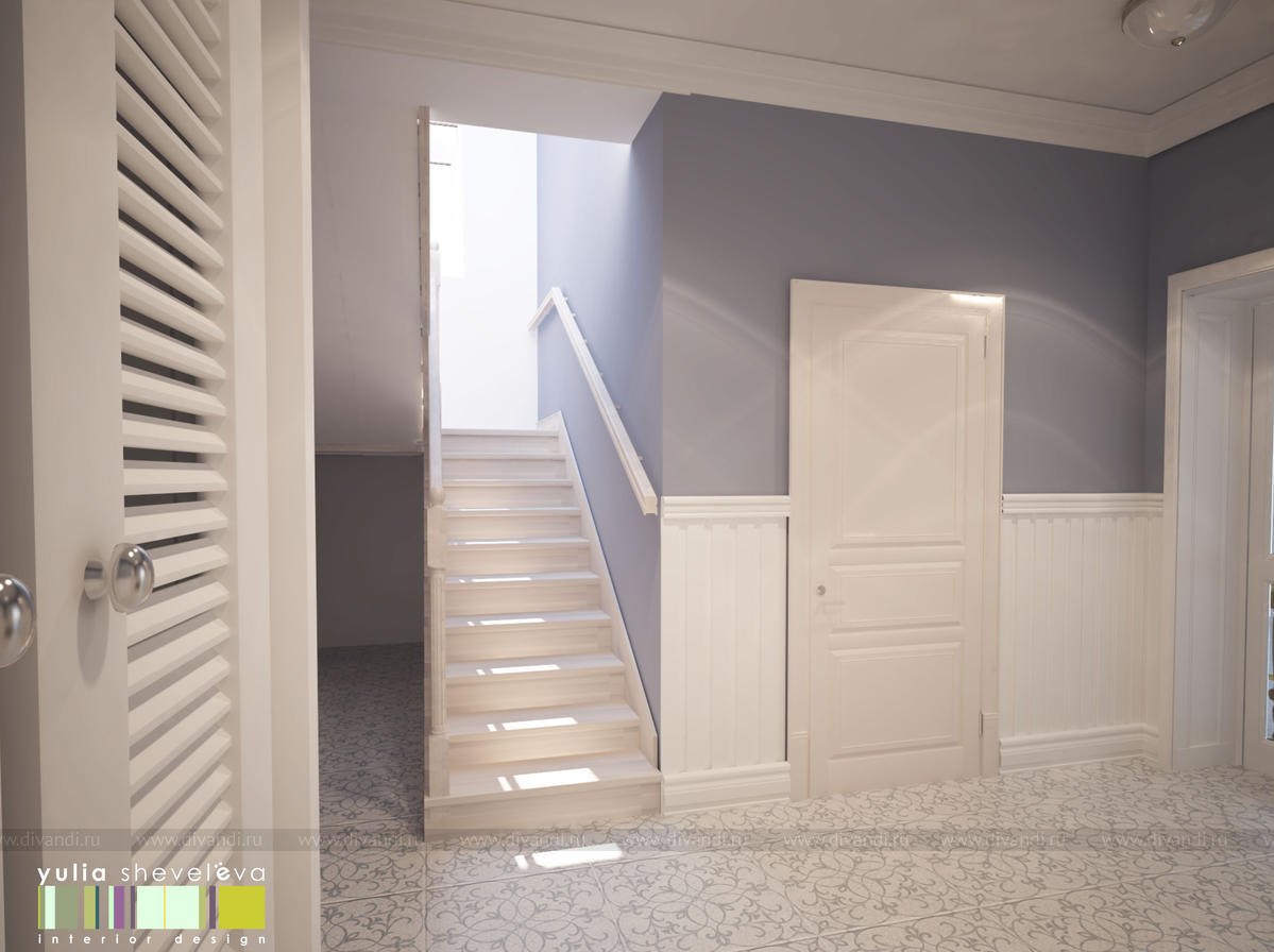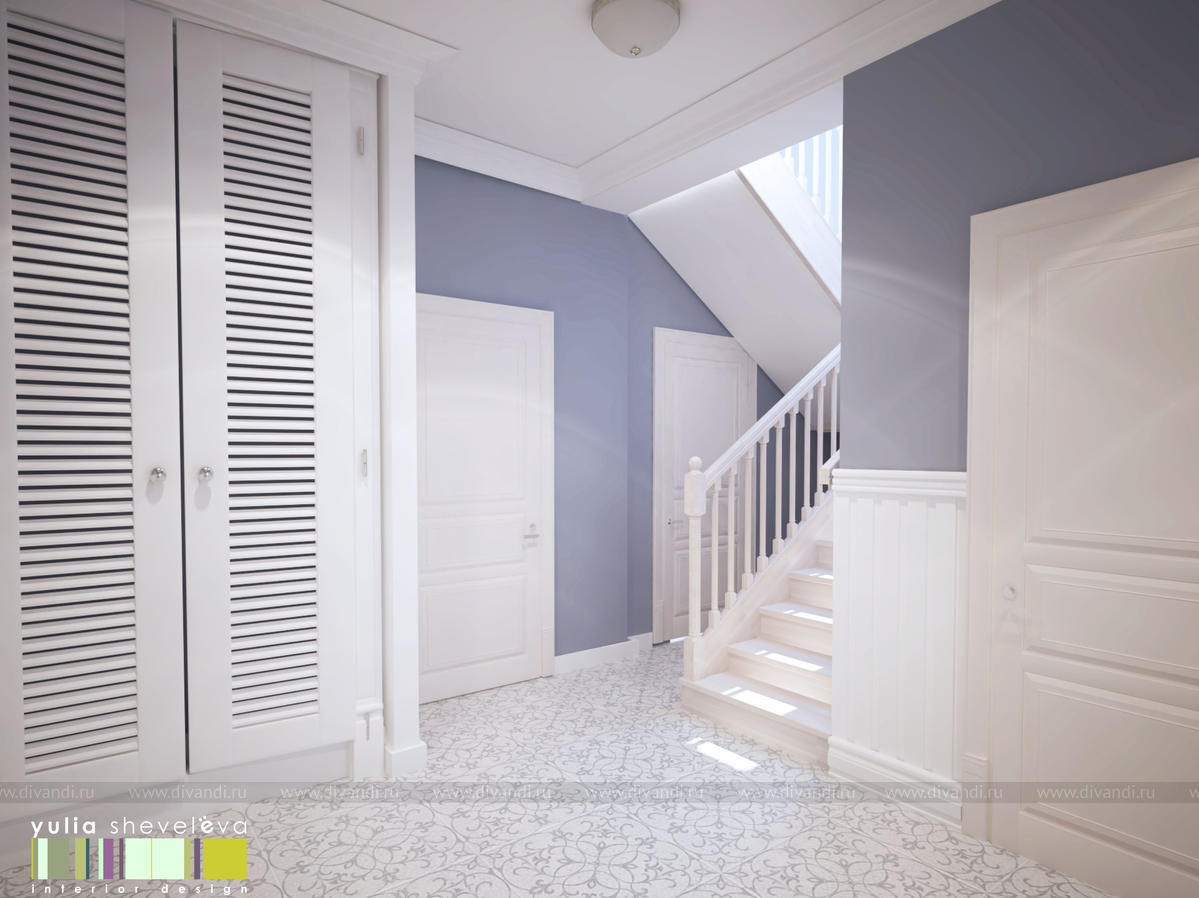 Проект небольшого загородного дома в г. Екатеринбурге для семейной пары и двух дочерей. Интерьер мы решили сделать в классической стиле, с элементами Шебби Шик. Многие предметы интерьера загородного дома – это старинные вещи клиентов, которые хранились в гараже. Часть из них оставили в первозданном виде, что-то переделали и преобразили. Так ,например, столик в кабинете на 1 этаже сделали из подстолья машинки Zinger.Цветовая гамма для интерьера дома была выбрана преимущественно в голубых тонах, в холле и гостиной использована покраска, сделаны вставки из обоев с цветочным рисунком. Для младшей дочери интерьер комнаты выполнен более легкий и воздушный, с белой деревянной мебелью, уютными плетеными светильниками. Для старшей дочери интерьер получился более яркий и насыщенный. Слева от входа – стена в графитовой черной краске, рядом - система хранения из дерева и яркий желтый диван.Спальня родителей выдержана в общем стиле всего интерьера: на стенах – цветочные обои, кованая кровать и белая классическая деревянная мебель.