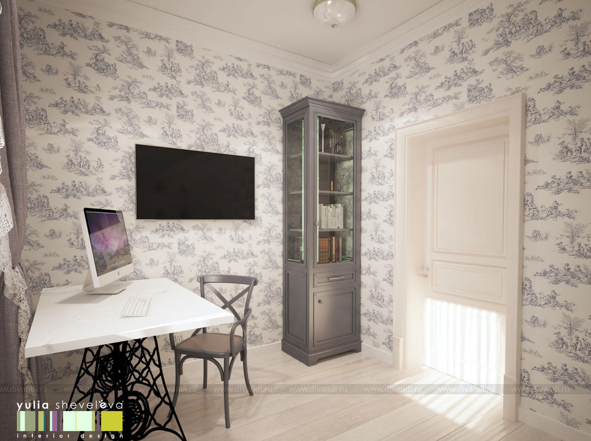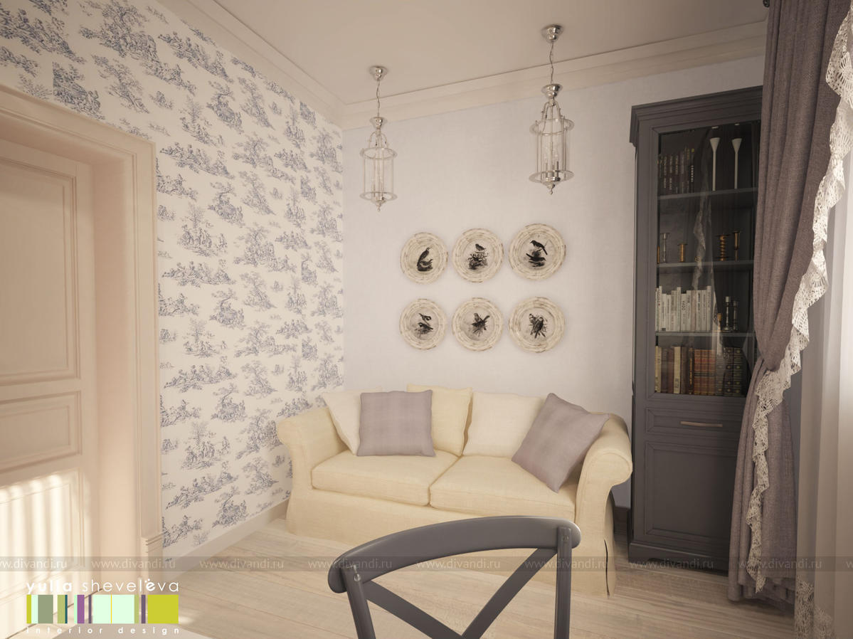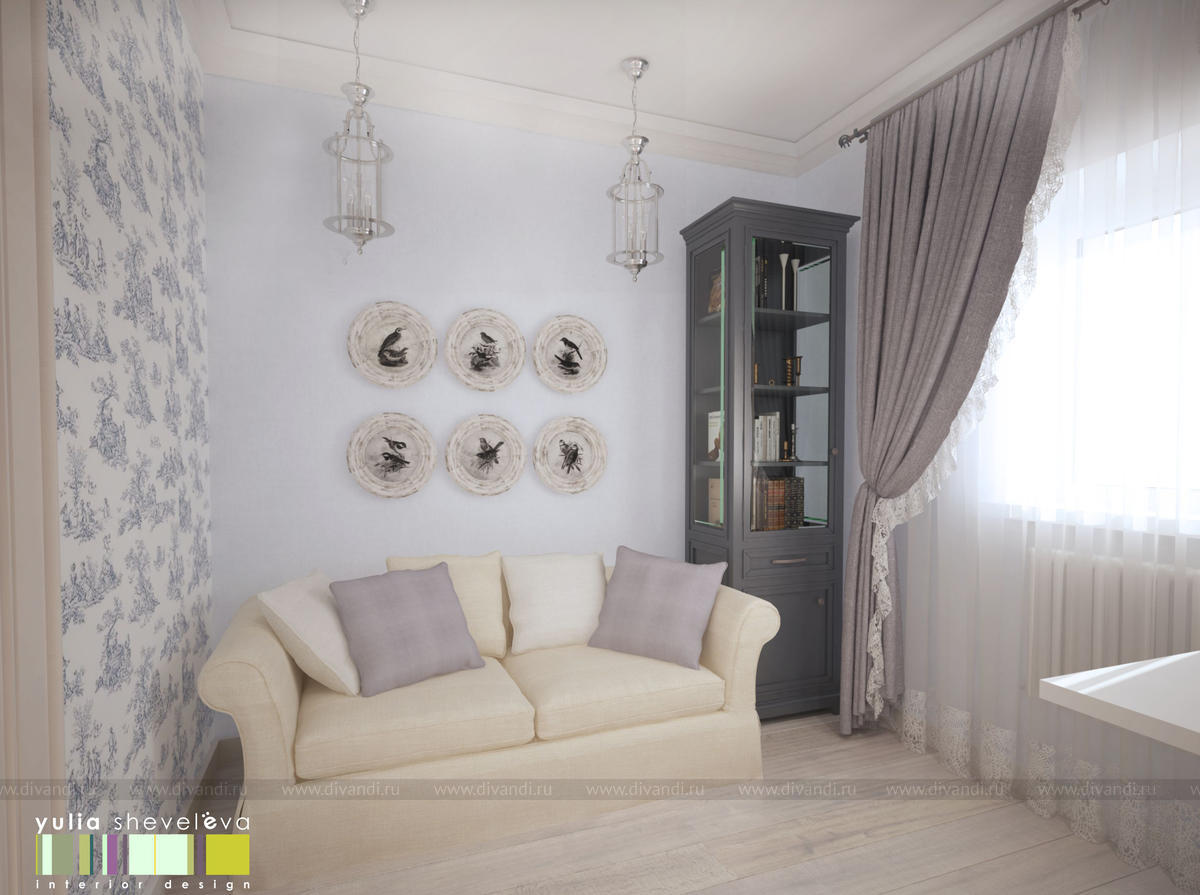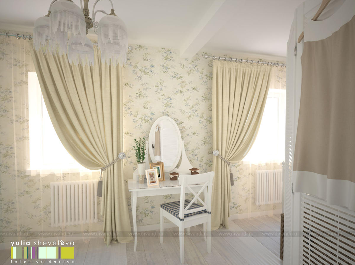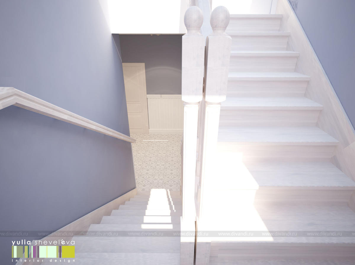 Проект небольшого загородного дома в г. Екатеринбурге для семейной пары и двух дочерей. Интерьер мы решили сделать в классической стиле, с элементами Шебби Шик. Многие предметы интерьера загородного дома – это старинные вещи клиентов, которые хранились в гараже. Часть из них оставили в первозданном виде, что-то переделали и преобразили. Так ,например, столик в кабинете на 1 этаже сделали из подстолья машинки Zinger.Цветовая гамма для интерьера дома была выбрана преимущественно в голубых тонах, в холле и гостиной использована покраска, сделаны вставки из обоев с цветочным рисунком. Для младшей дочери интерьер комнаты выполнен более легкий и воздушный, с белой деревянной мебелью, уютными плетеными светильниками. Для старшей дочери интерьер получился более яркий и насыщенный. Слева от входа – стена в графитовой черной краске, рядом - система хранения из дерева и яркий желтый диван.Спальня родителей выдержана в общем стиле всего интерьера: на стенах – цветочные обои, кованая кровать и белая классическая деревянная мебель.