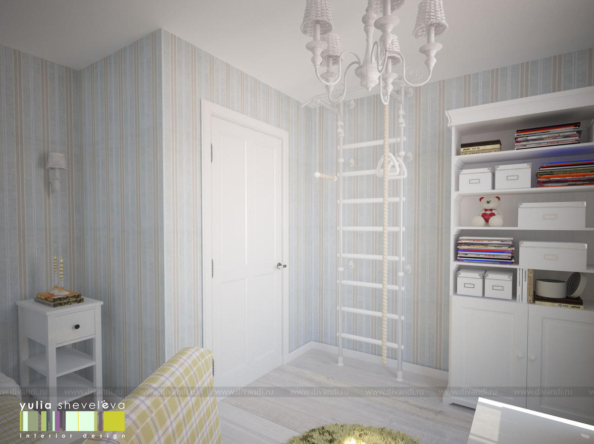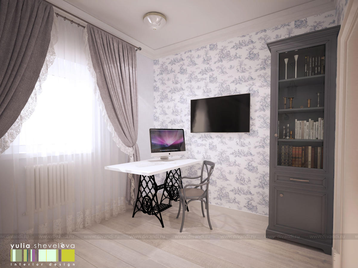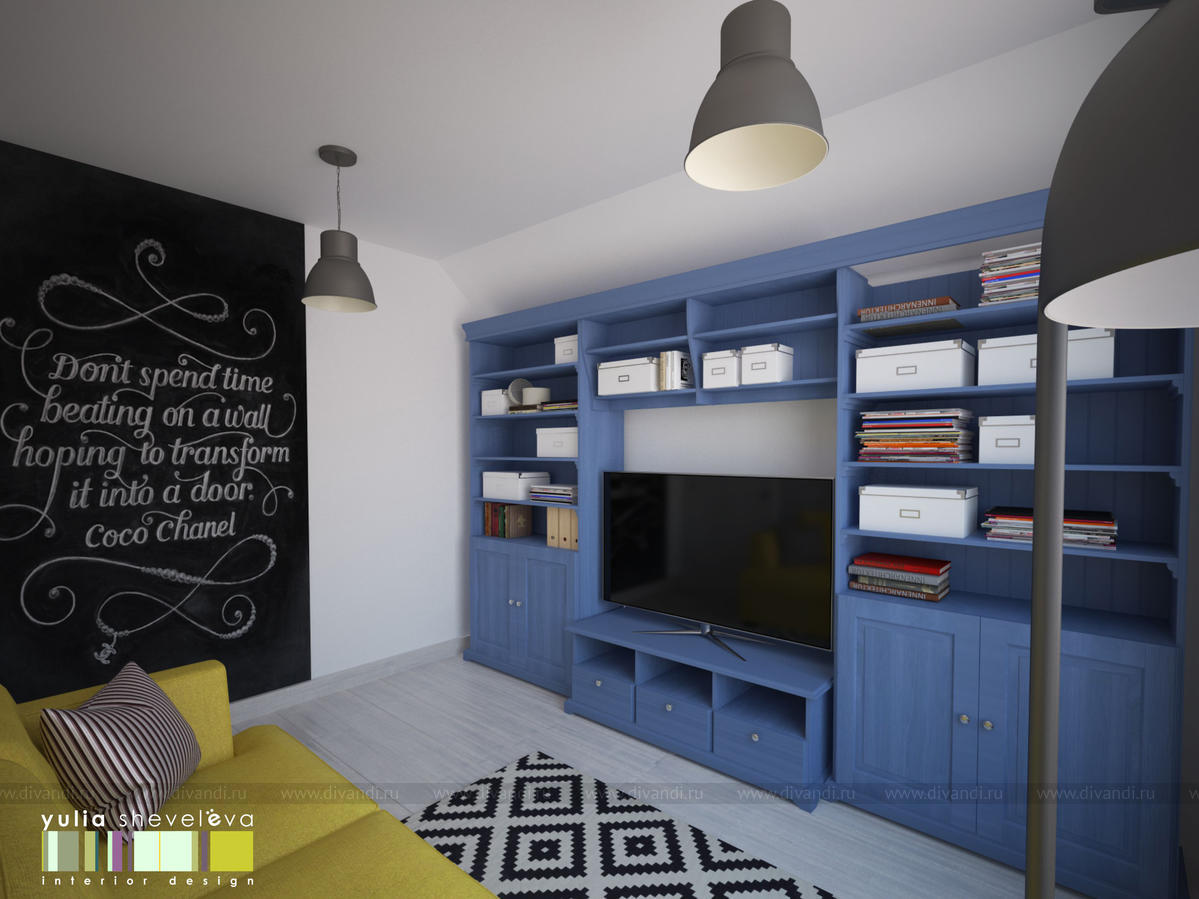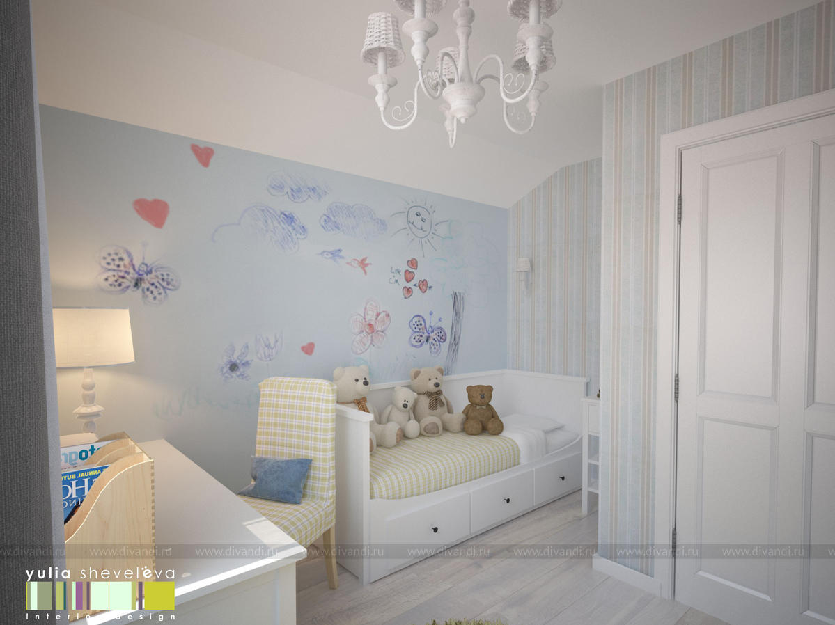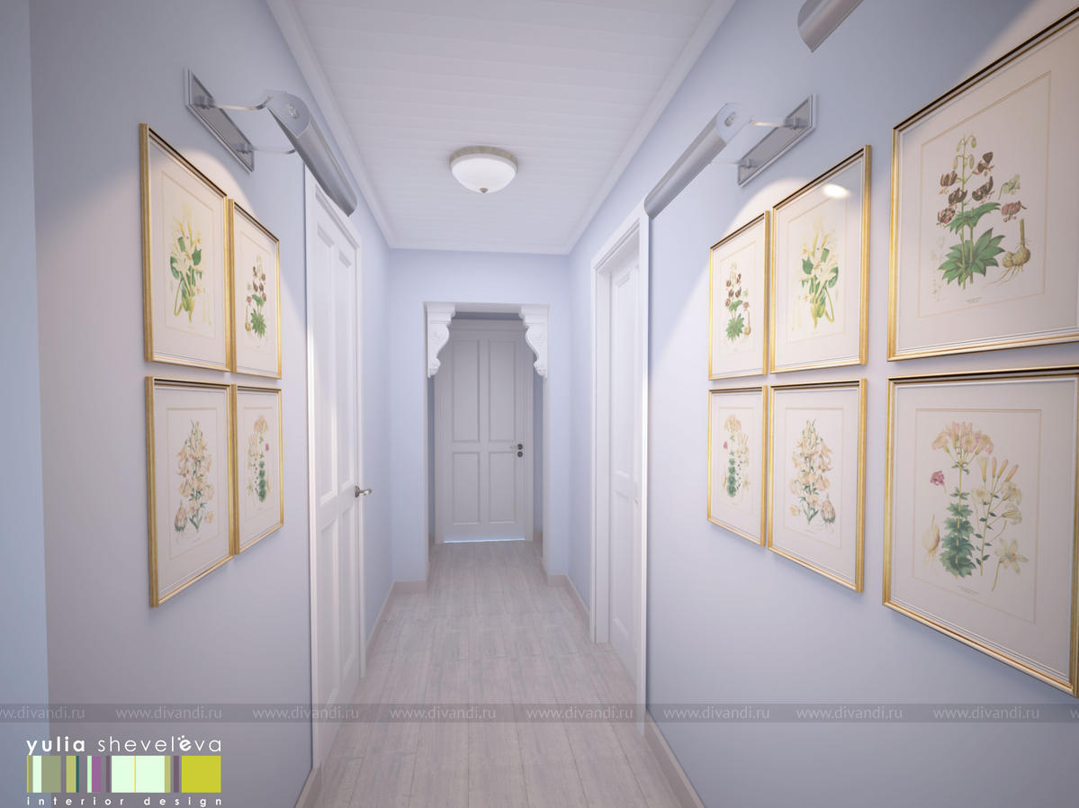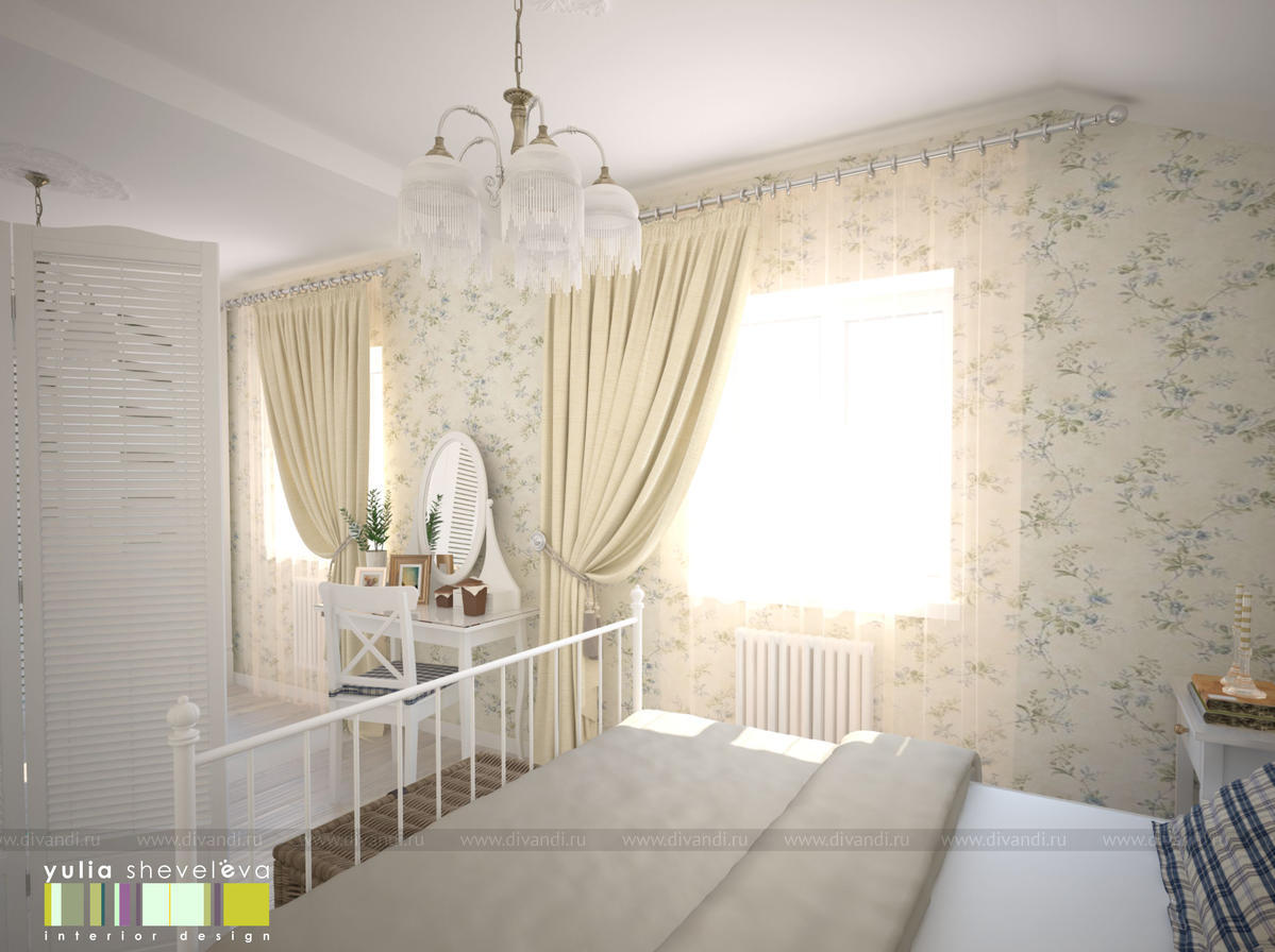 Проект небольшого загородного дома в г. Екатеринбурге для семейной пары и двух дочерей. Интерьер мы решили сделать в классической стиле, с элементами Шебби Шик. Многие предметы интерьера загородного дома – это старинные вещи клиентов, которые хранились в гараже. Часть из них оставили в первозданном виде, что-то переделали и преобразили. Так ,например, столик в кабинете на 1 этаже сделали из подстолья машинки Zinger.Цветовая гамма для интерьера дома была выбрана преимущественно в голубых тонах, в холле и гостиной использована покраска, сделаны вставки из обоев с цветочным рисунком. Для младшей дочери интерьер комнаты выполнен более легкий и воздушный, с белой деревянной мебелью, уютными плетеными светильниками. Для старшей дочери интерьер получился более яркий и насыщенный. Слева от входа – стена в графитовой черной краске, рядом - система хранения из дерева и яркий желтый диван.Спальня родителей выдержана в общем стиле всего интерьера: на стенах – цветочные обои, кованая кровать и белая классическая деревянная мебель.